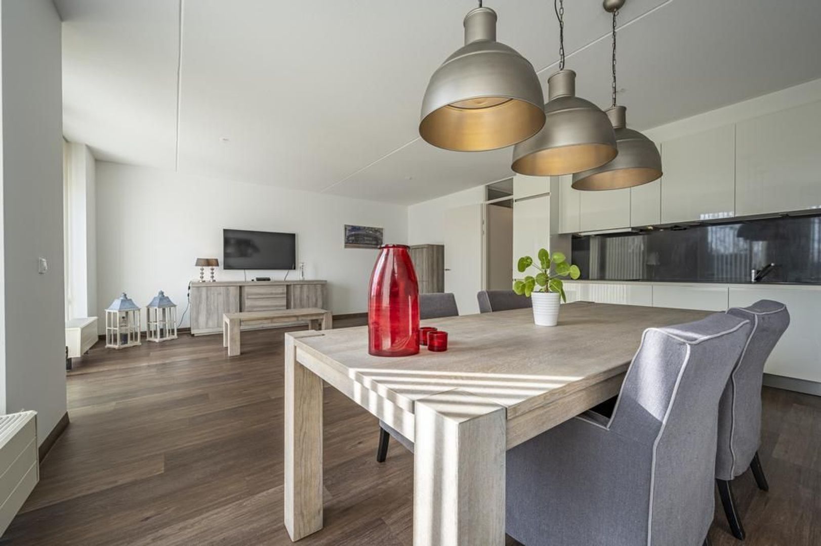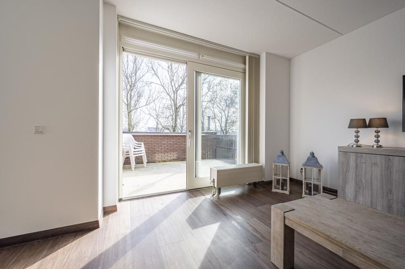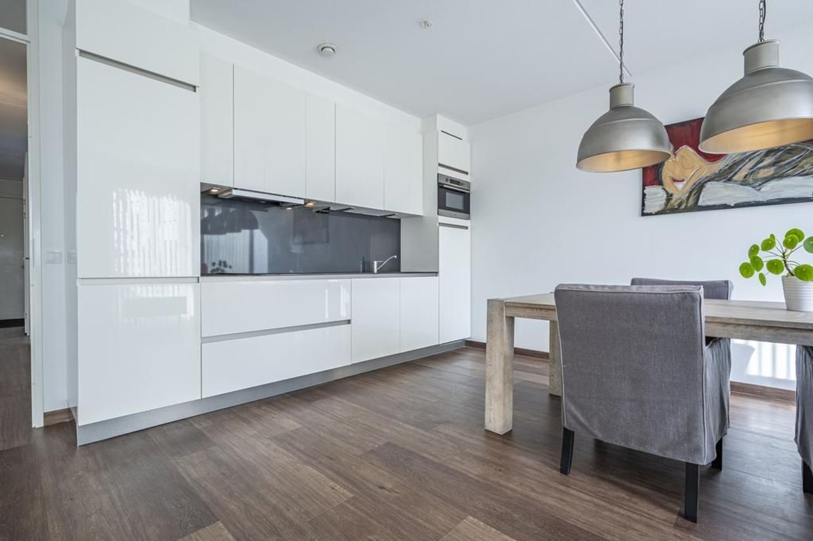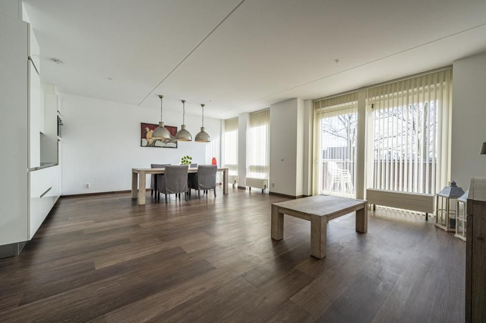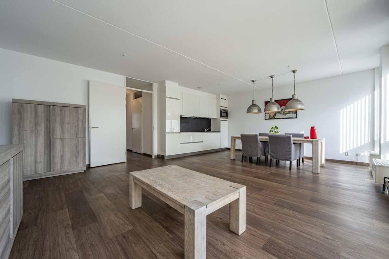 De woonkamer met open keuken bevindt zich aan de zuidoostzijde van het gebouw. Mooi vierkant en licht.