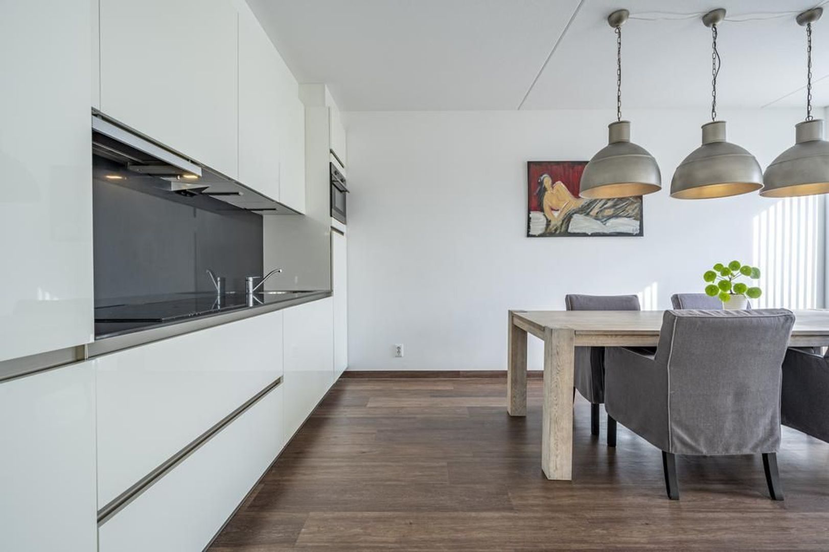 De keuken is wandopgesteld en uitgevoerd met een koelkast, vaatwasser, 4-pits inductiekookplaat en afzuigkap.