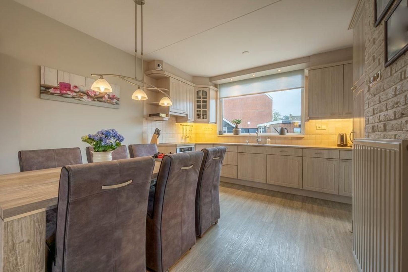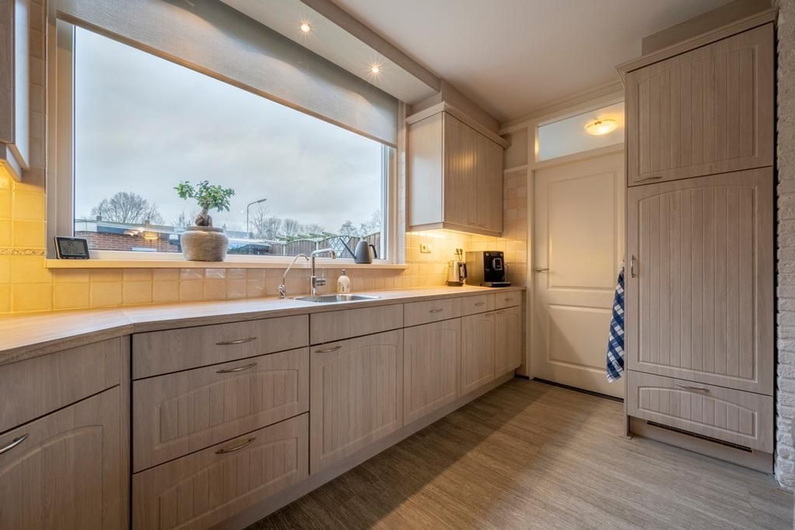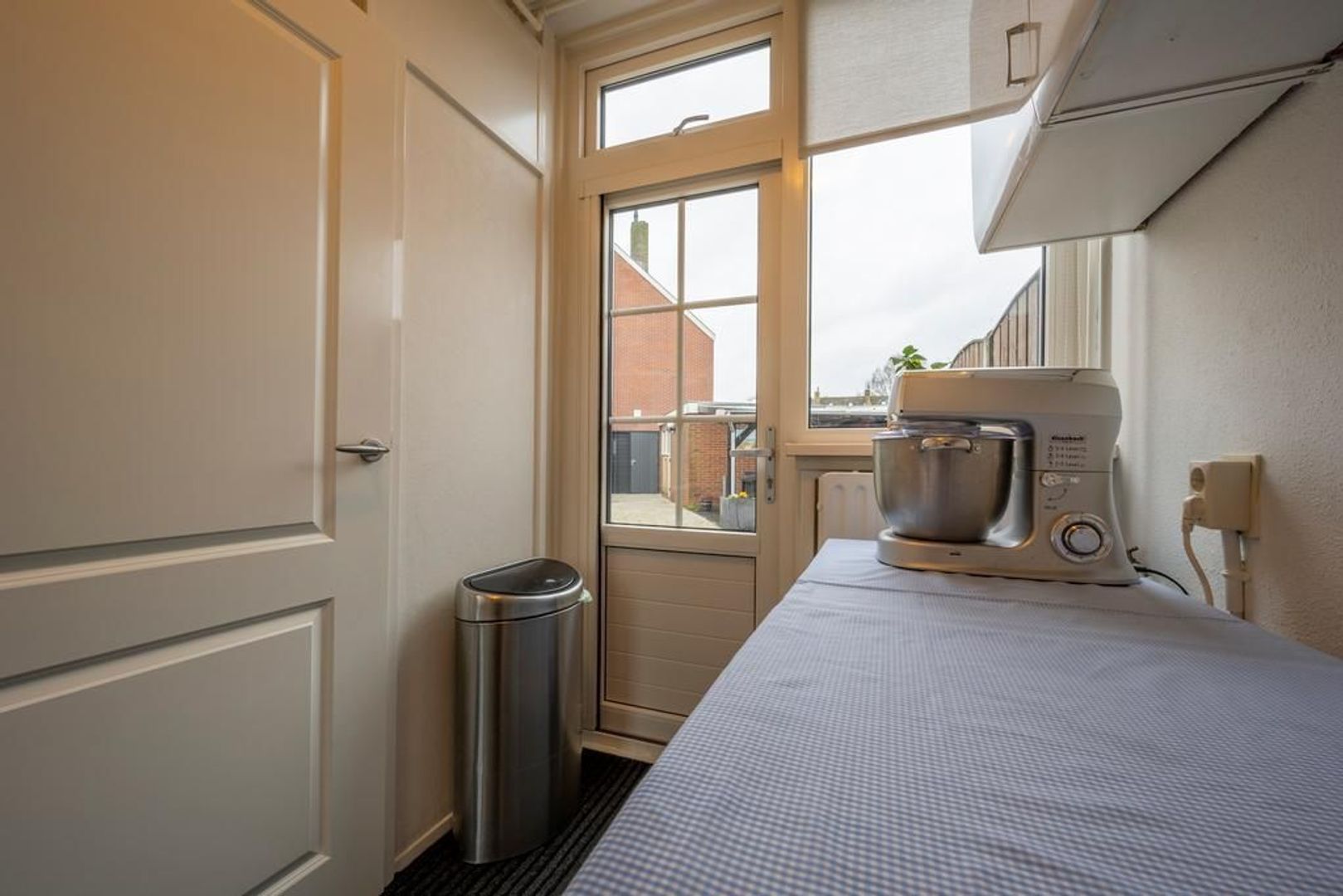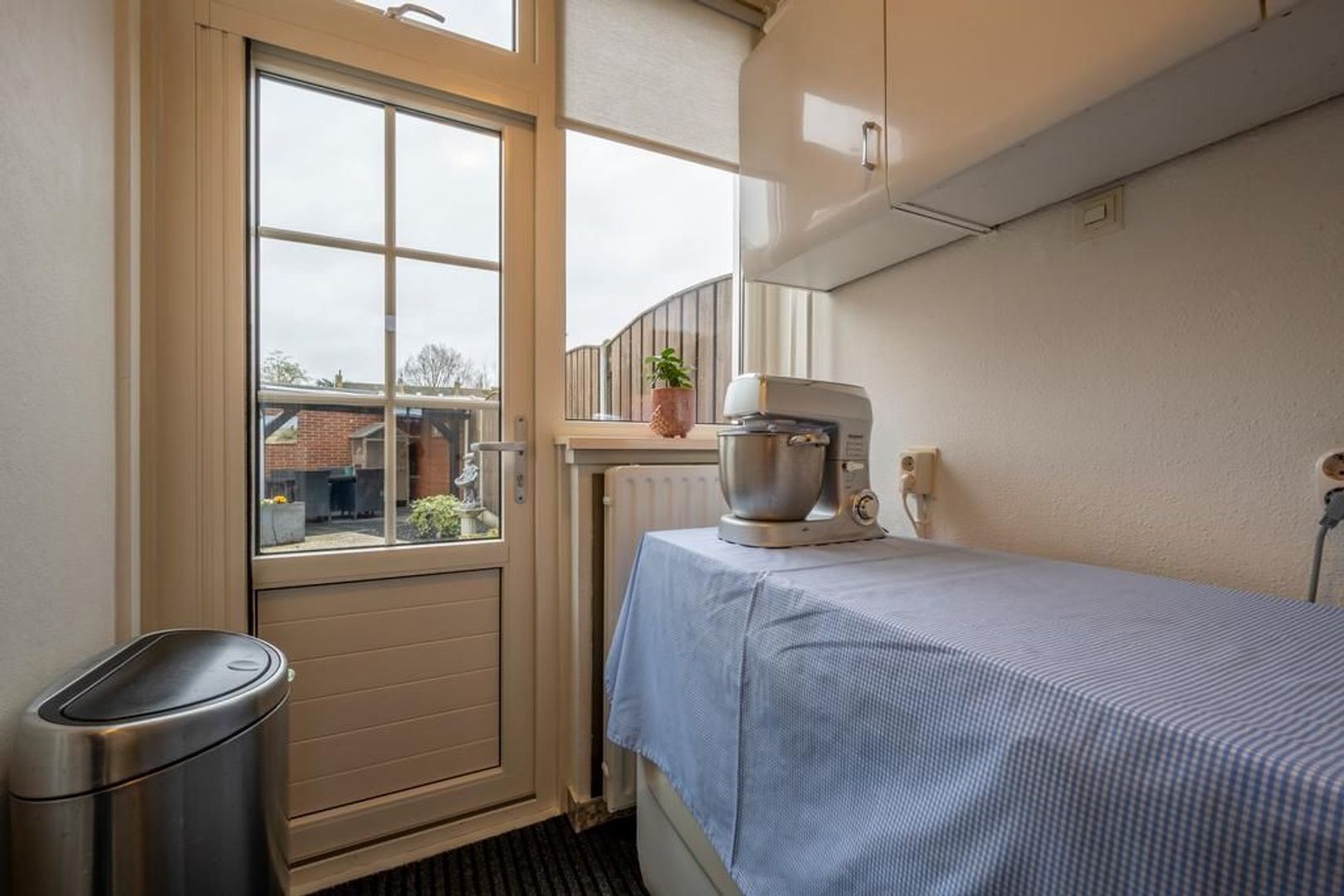 Bijzonder praktisch is de naastgelegen bijkeuken met de aansluitingen voor de wasapparatuur en de deur naar de tuin. In de bijkeukenkast is een waterontharder aanwezig.