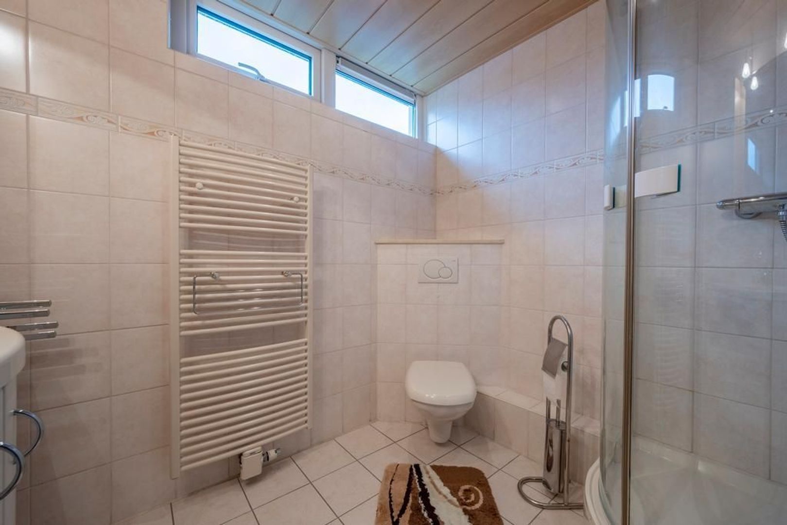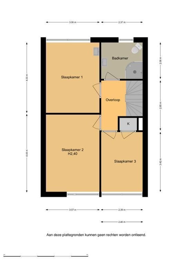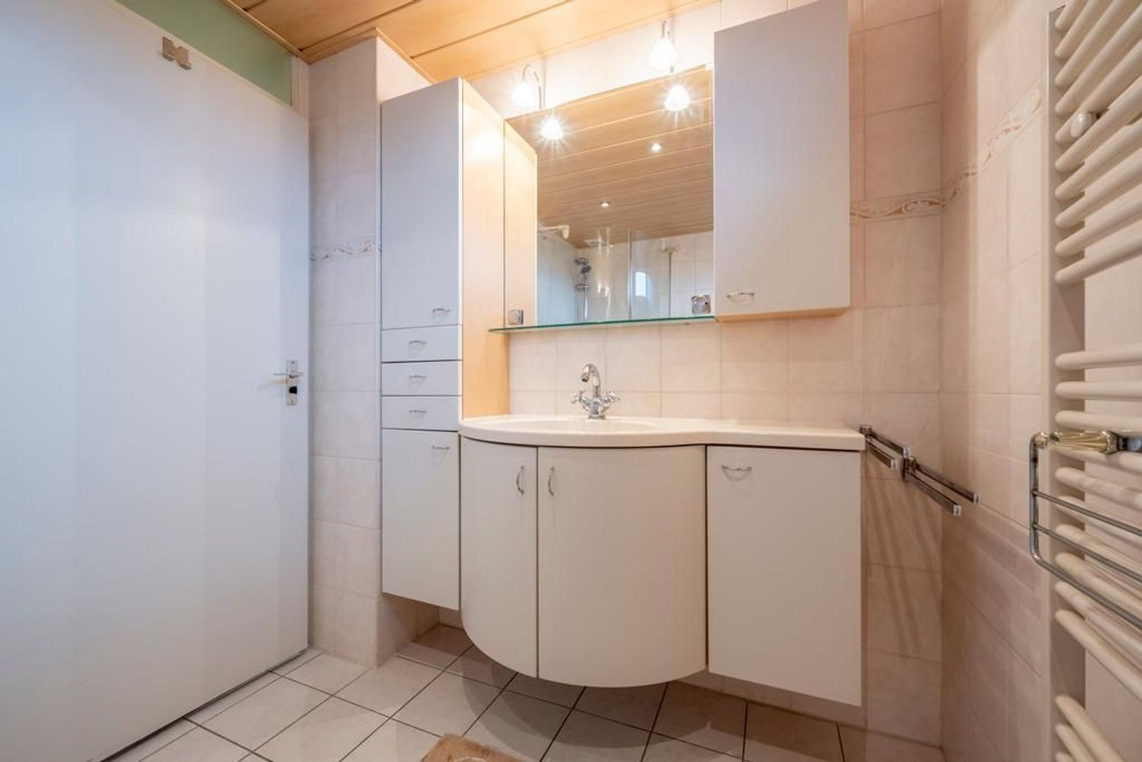 Op de eerste verdieping zijn drie slaapkamers, waarvan één met een vaste kast en wastafel. De badkamer beschikt -naast een gebruikelijk ventilatierooster- over een raam dat open kan, zodat er extra met frisse lucht geventileerd kan worden. De ruimte biedt plaats aan een wastafelmeubel, doucheruimte en tweede toilet.