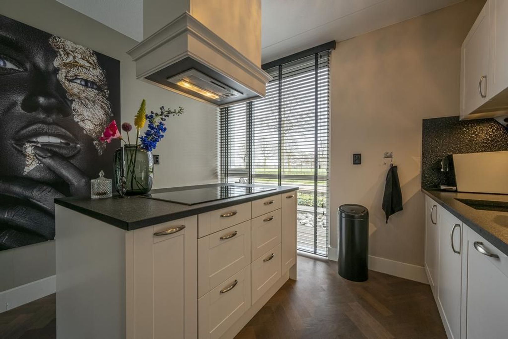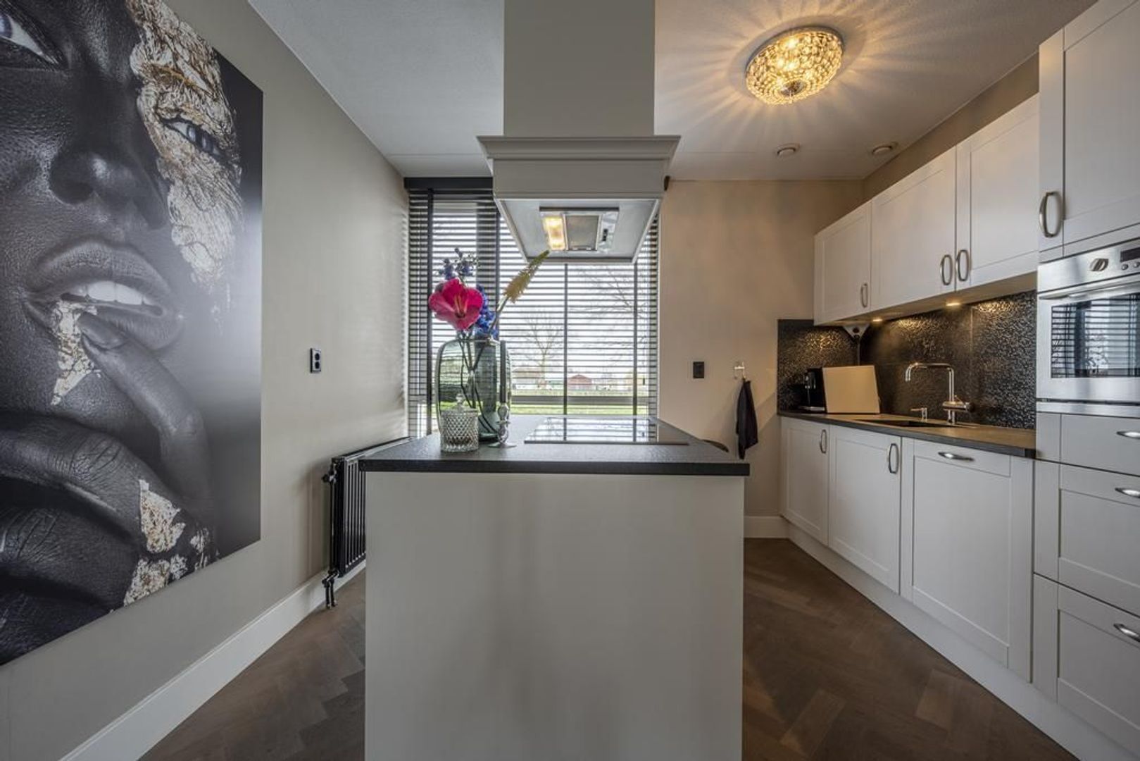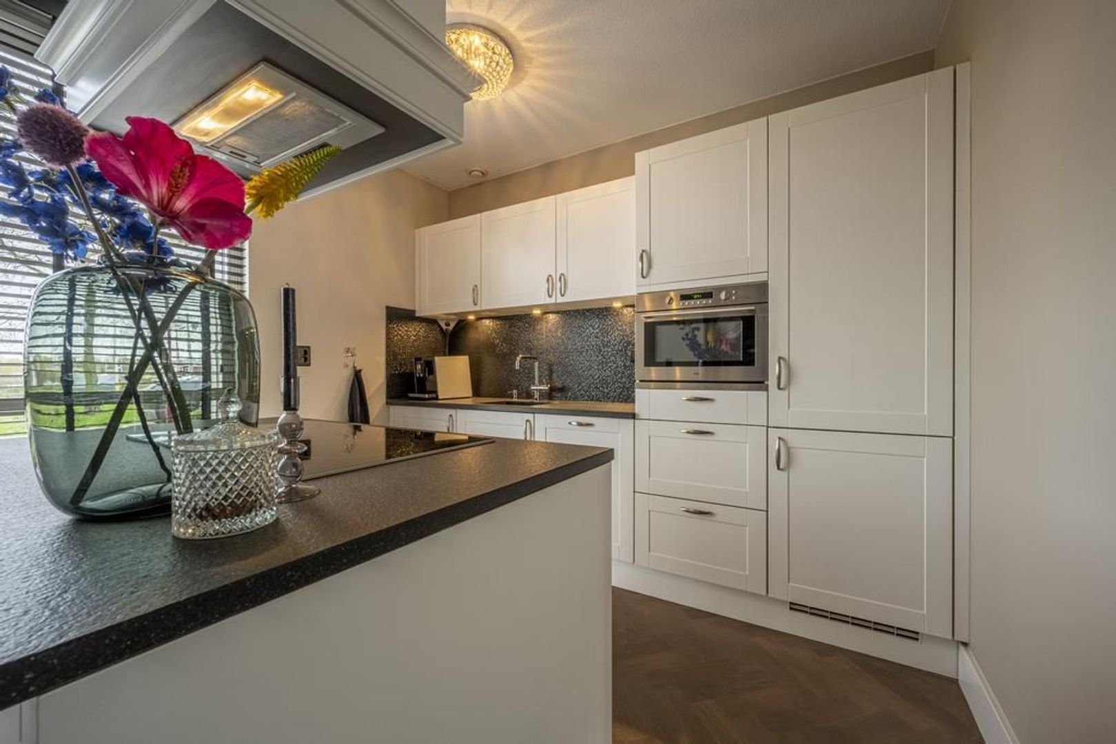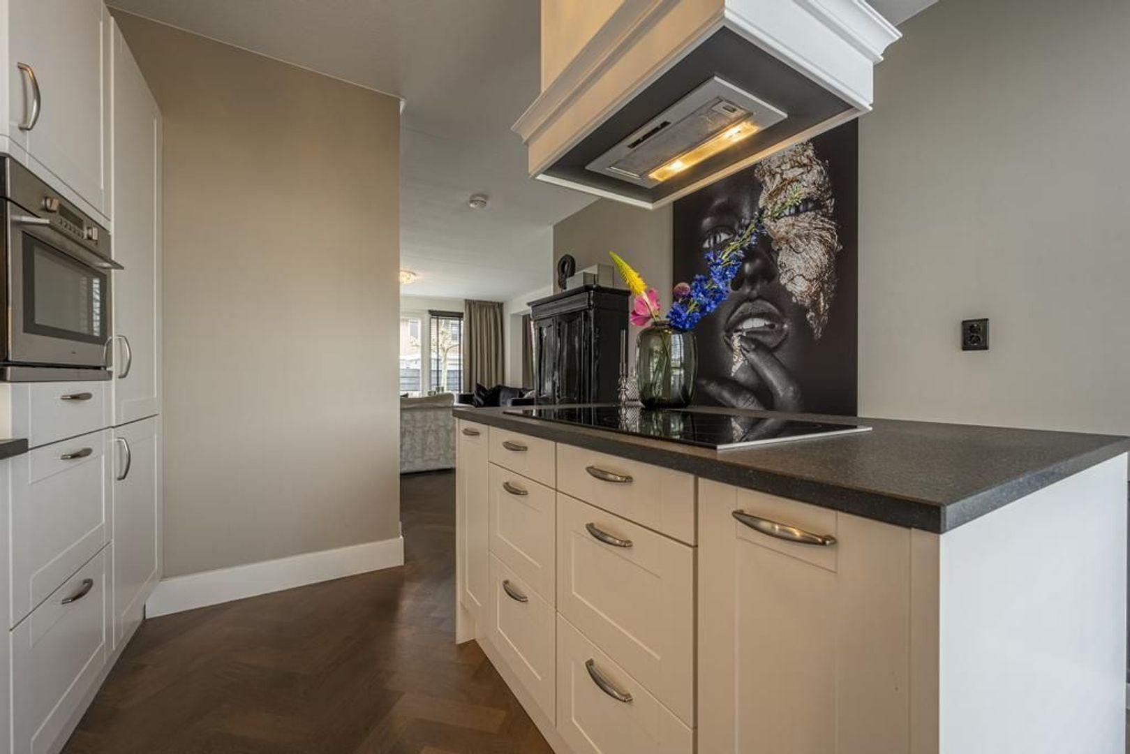 De open keuken is aan de straatzijde gesitueerd. Deze is voorzien van een wandopstelling en een eiland. Compleet met inbouwapparatuur, zoals een combi-magnetron, koel-vriescombinatie, vaatwasser, 5-pits inductie kookplaat en een afzuigkap.