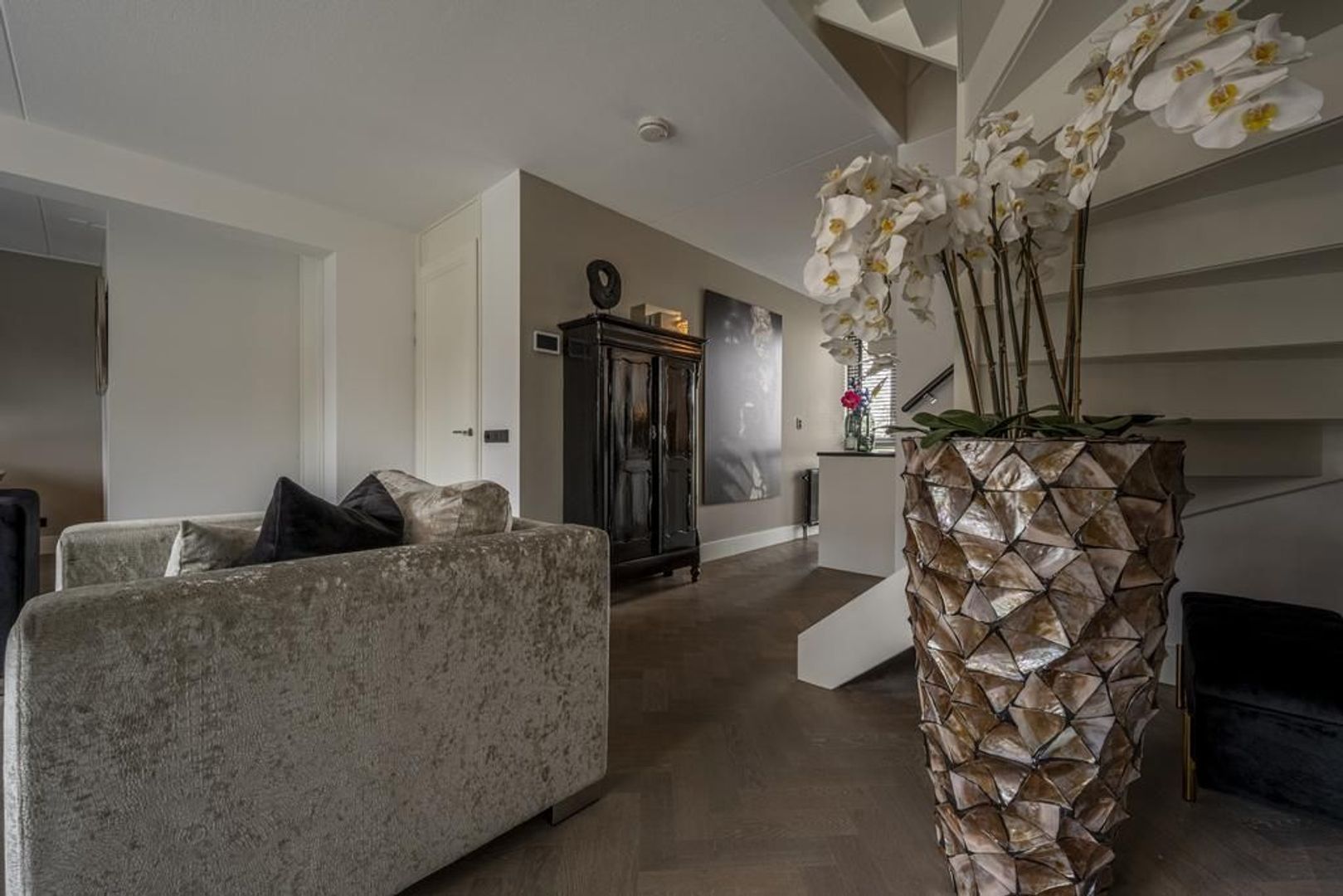 De begane grond is afgewerkt met een prachtige houten vloer, dat is gelegd in een visgraatmotief. De wanden zijn strak gestuct.