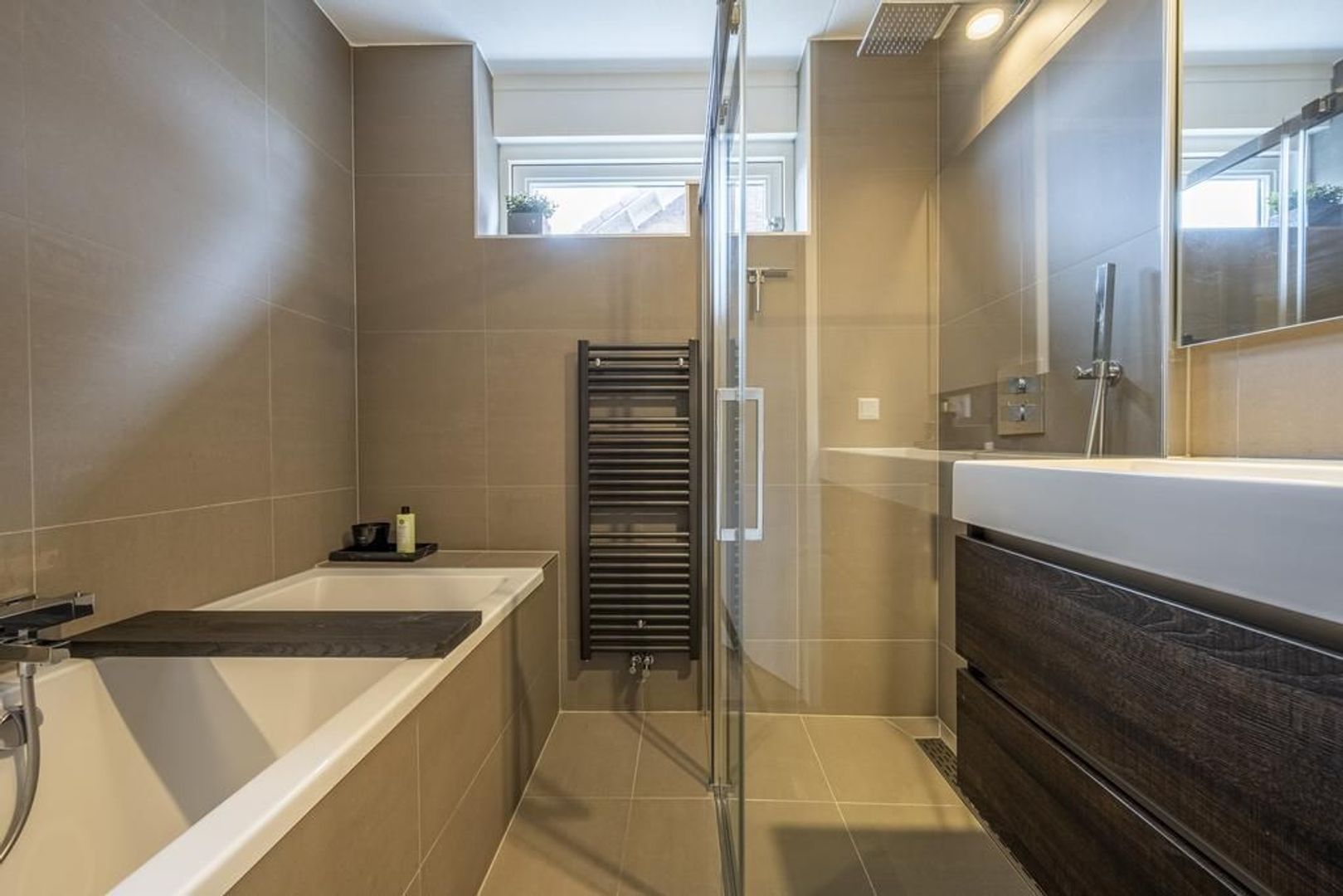 Deze is ingericht met een kunststof ligbad, een inloopdouche en een groot wastafelmeubel met dito spiegel erboven.