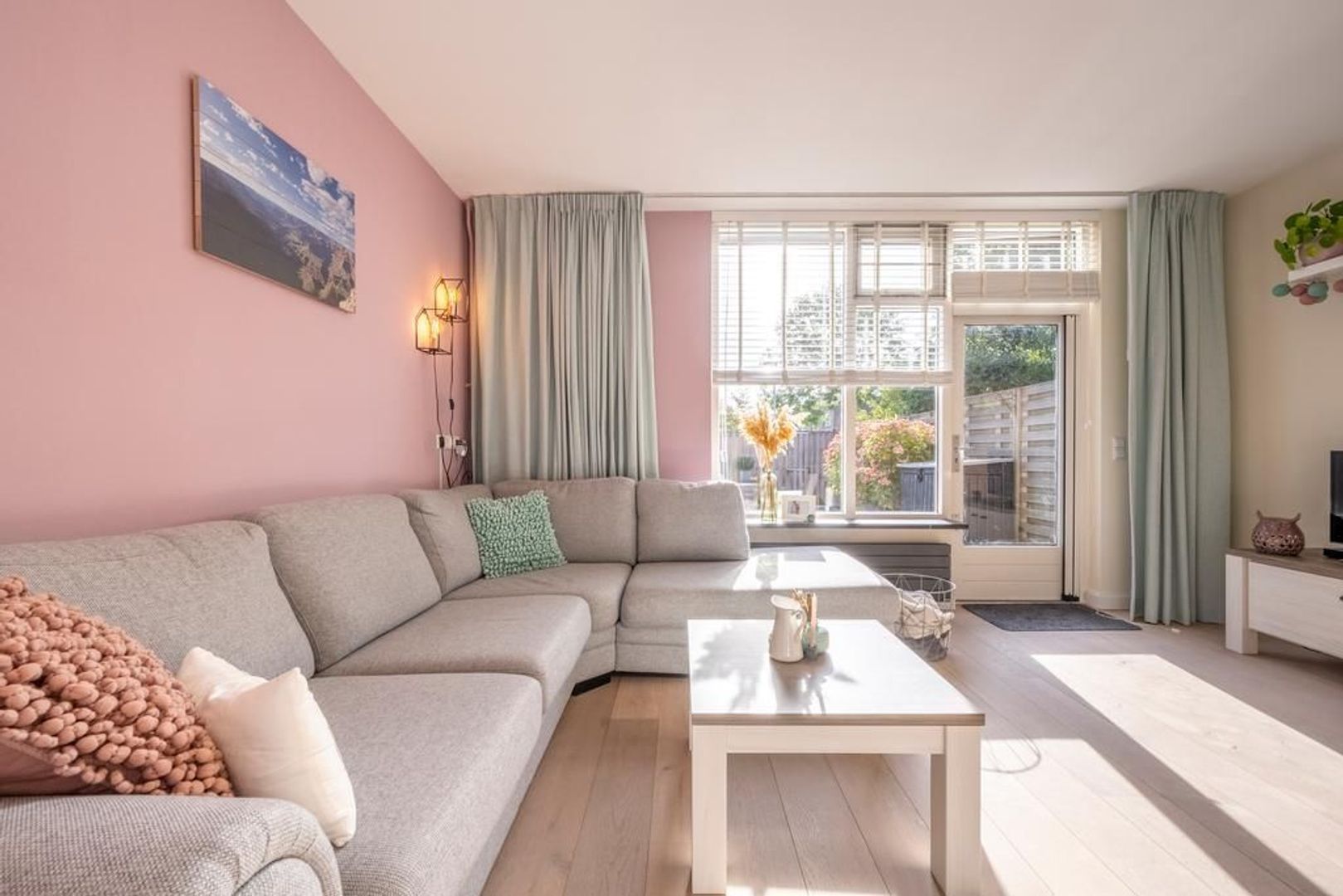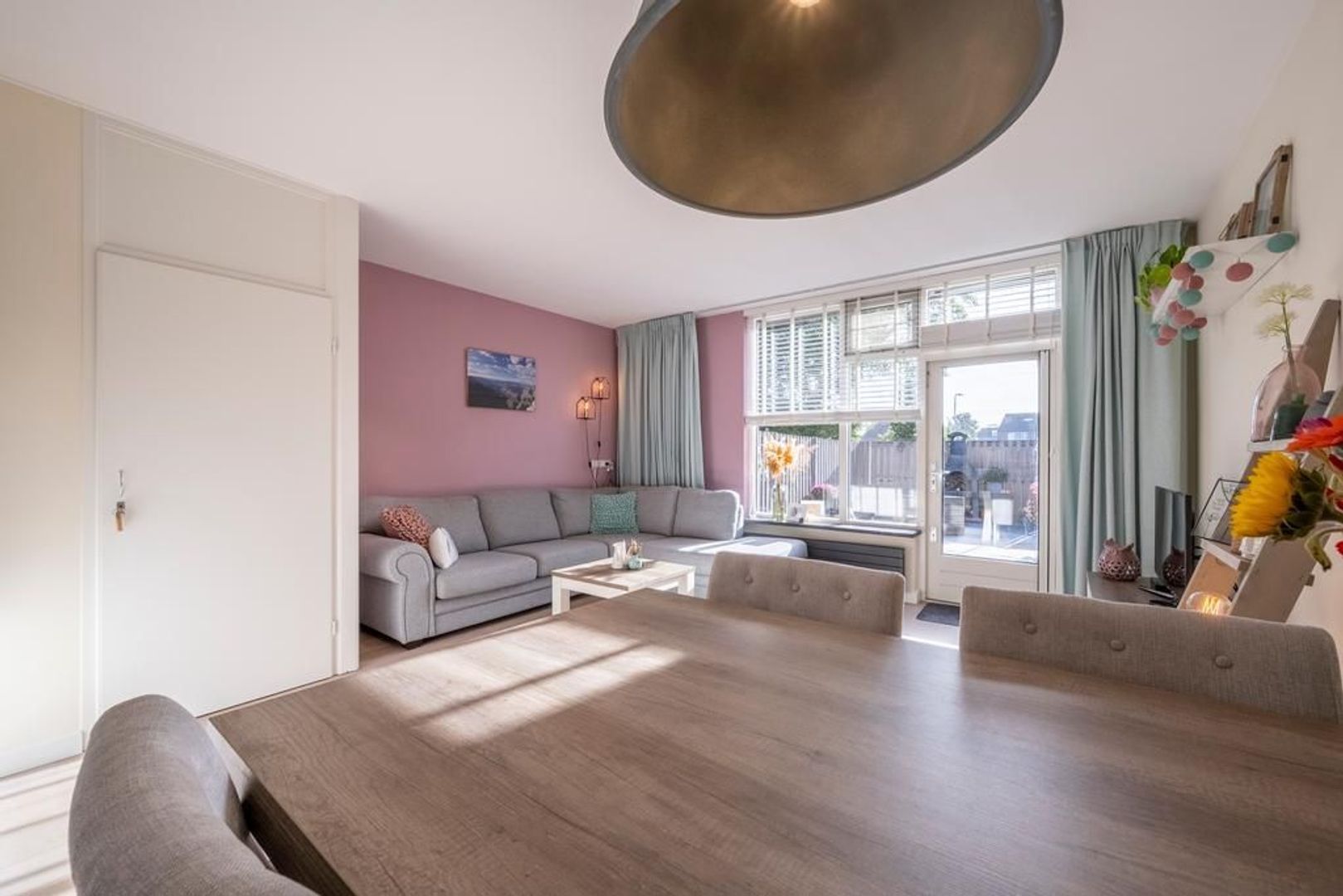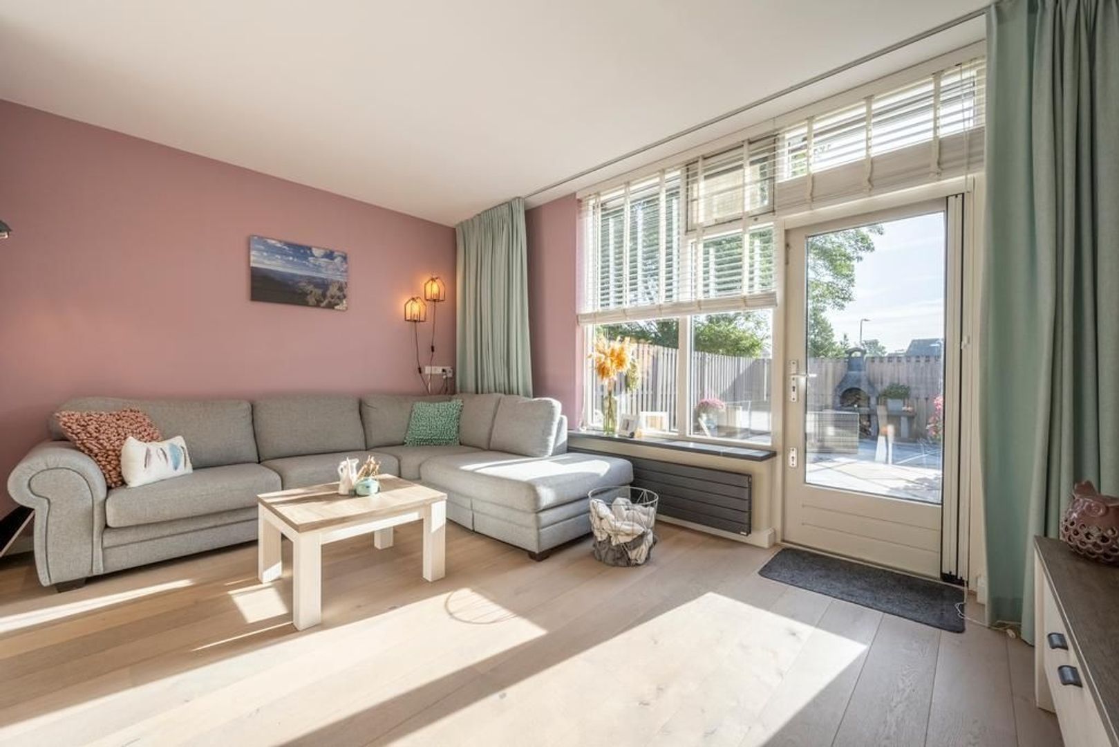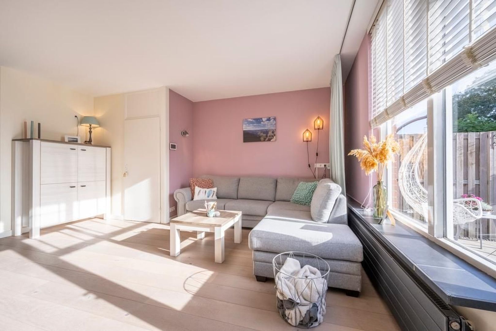 De gezellige woonkamer is tuingericht. Deze is tevens voorzien van een trapkast.