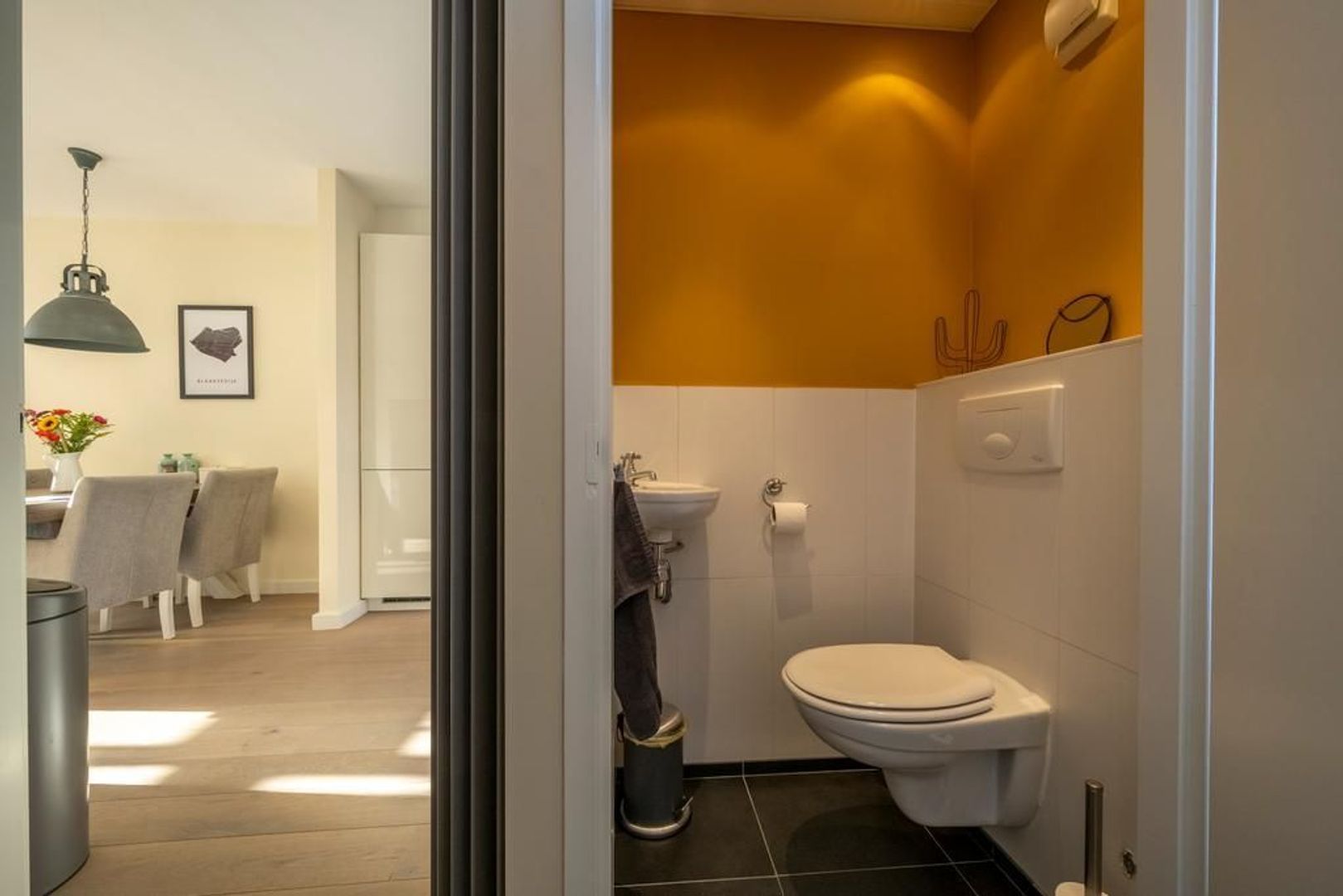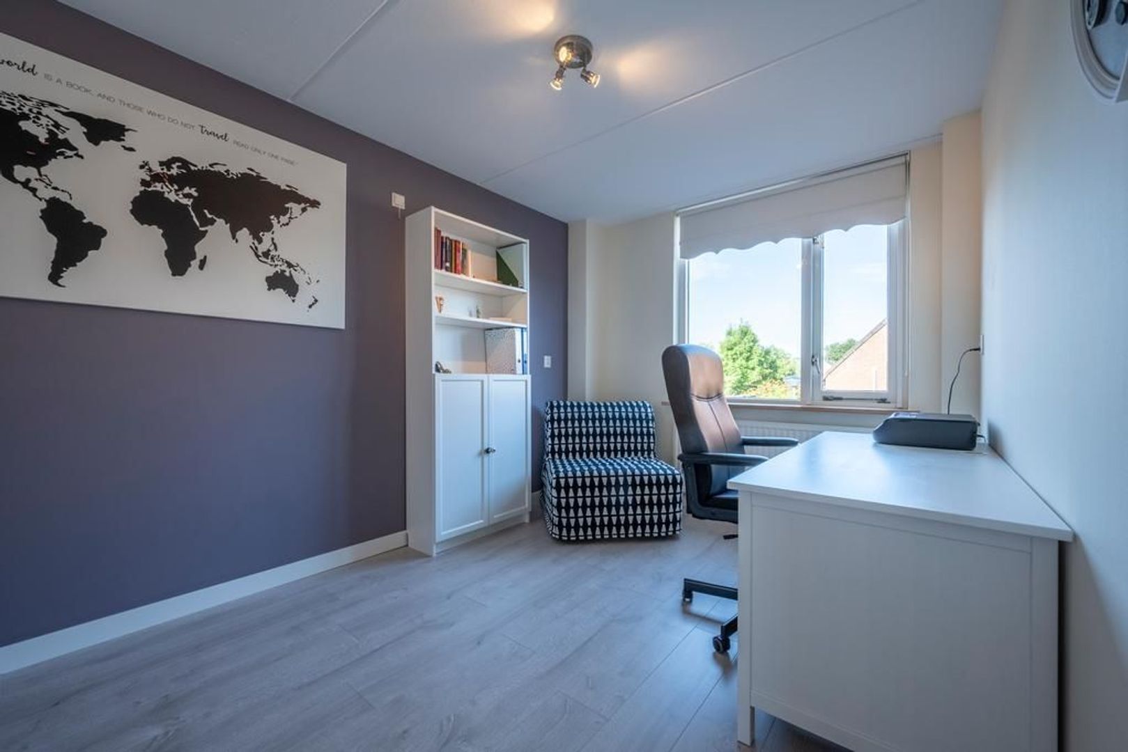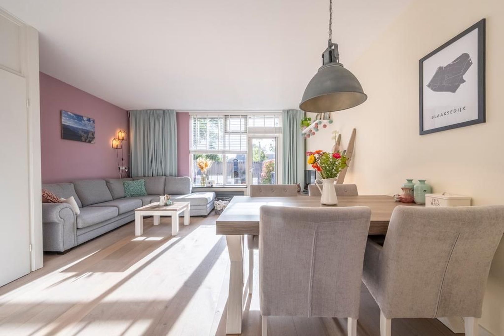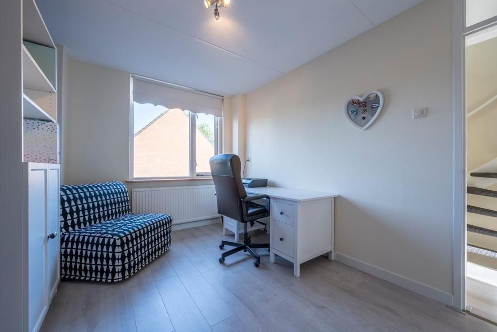 De gezellige woonkamer is tuingericht. Deze is tevens voorzien van een trapkast.