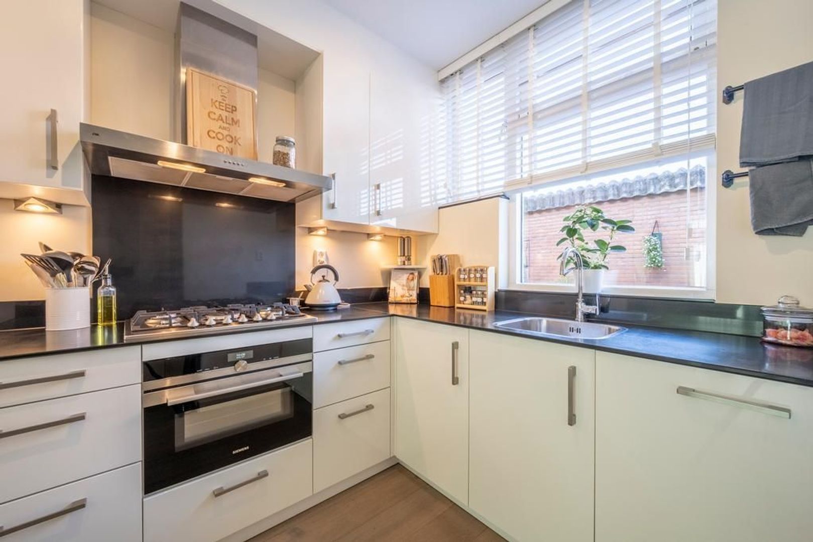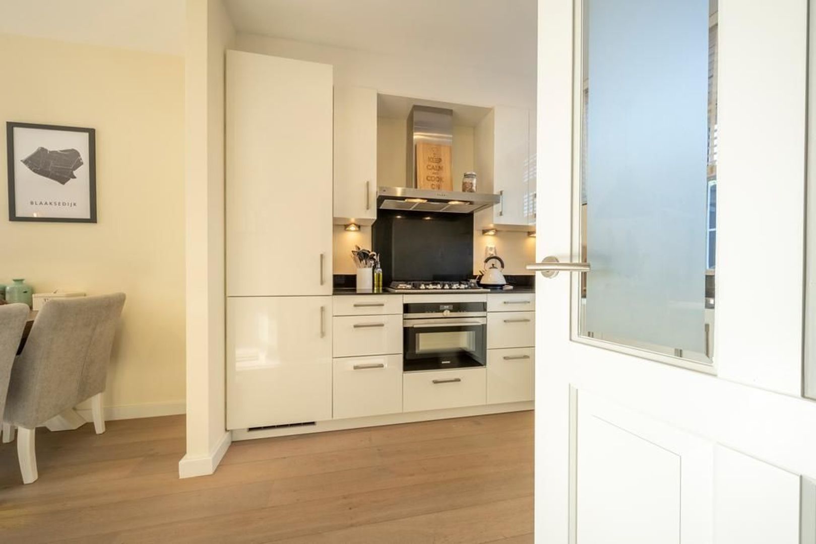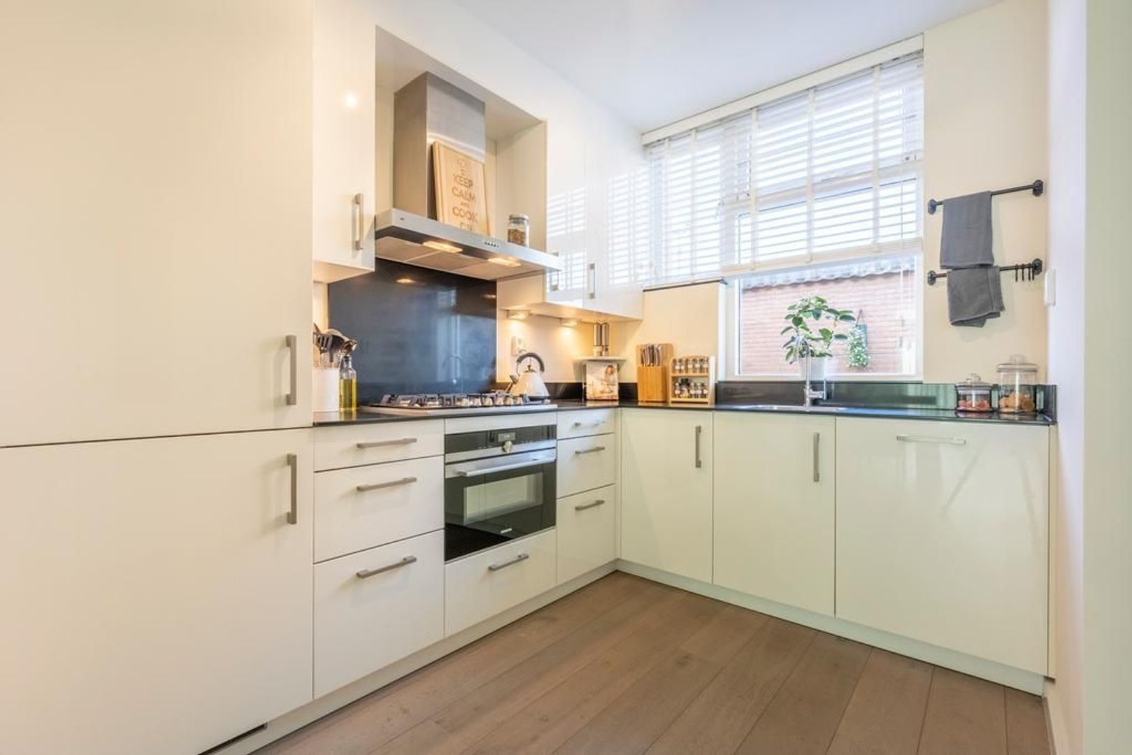De keuken bevindt zich aan de voorzijde. Deze is uitgevoerd met een granieten aanrechtblad, een combi-oven, vijfpits gaskookplaat, afzuigkap, vaatwasser en een koel-vriescombinatie.