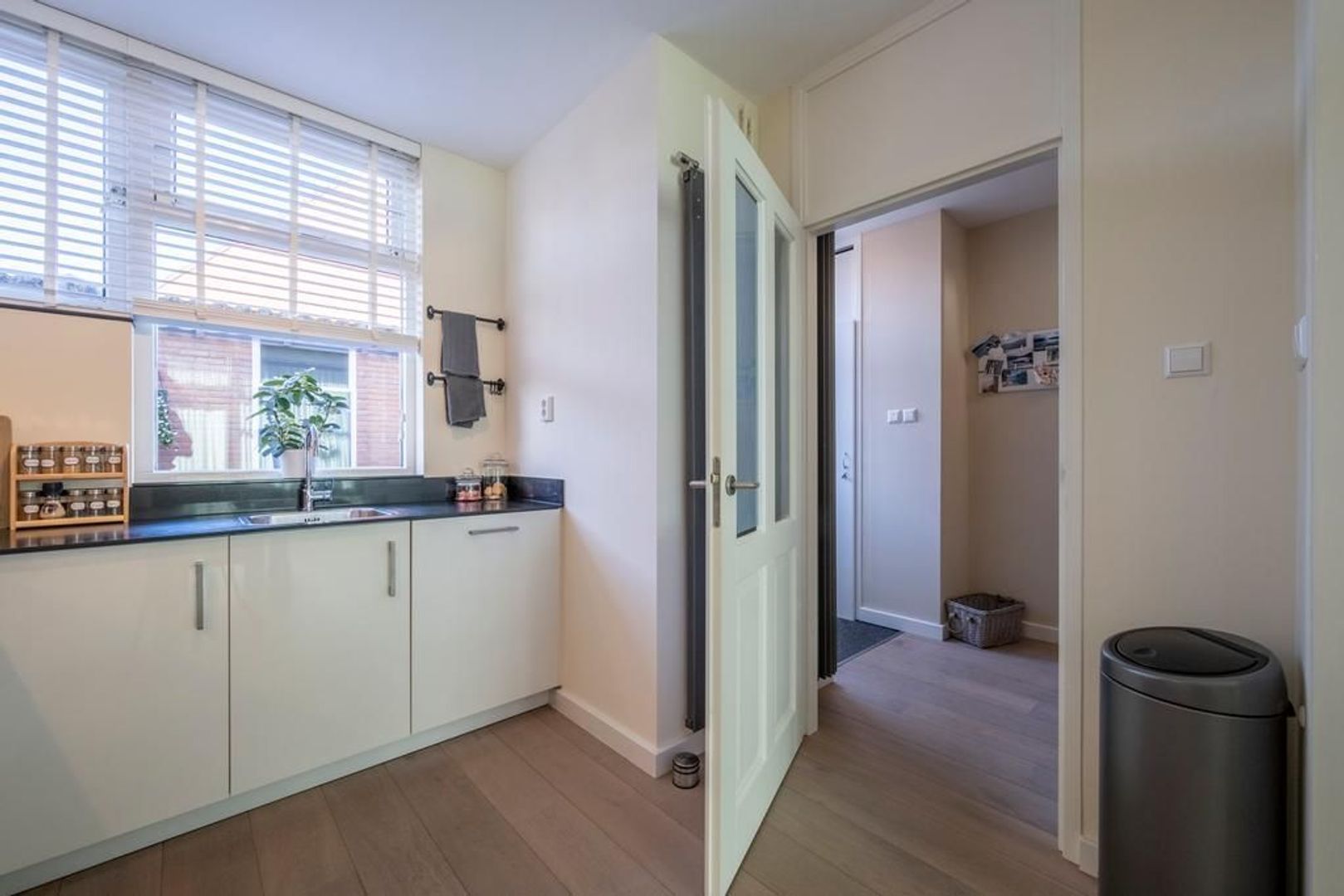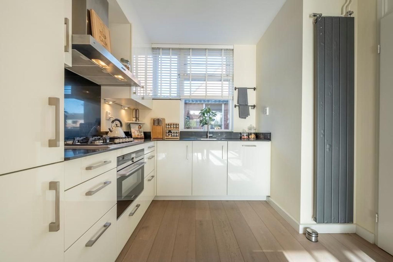 De begane grondvloer is afgewerkt met mooi eikenhout. De verdiepingsvloeren van laminaat. De wanden zijn grotendeel glad gestuukt.