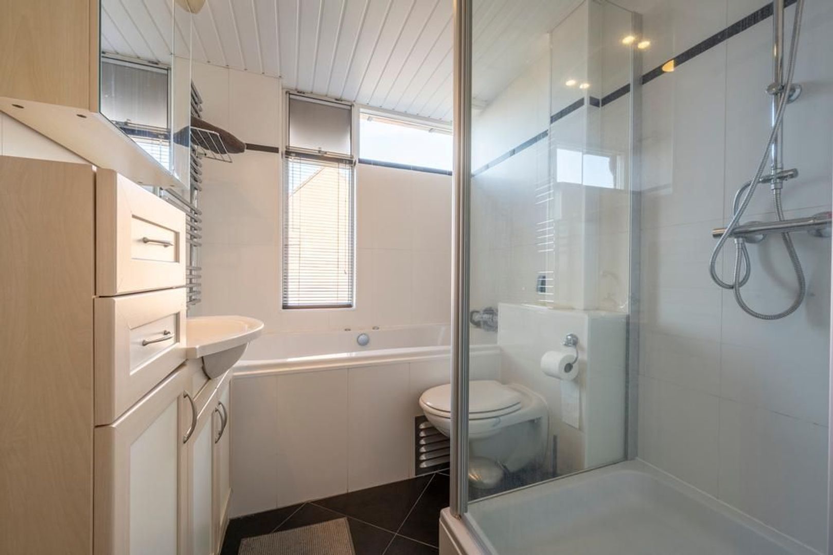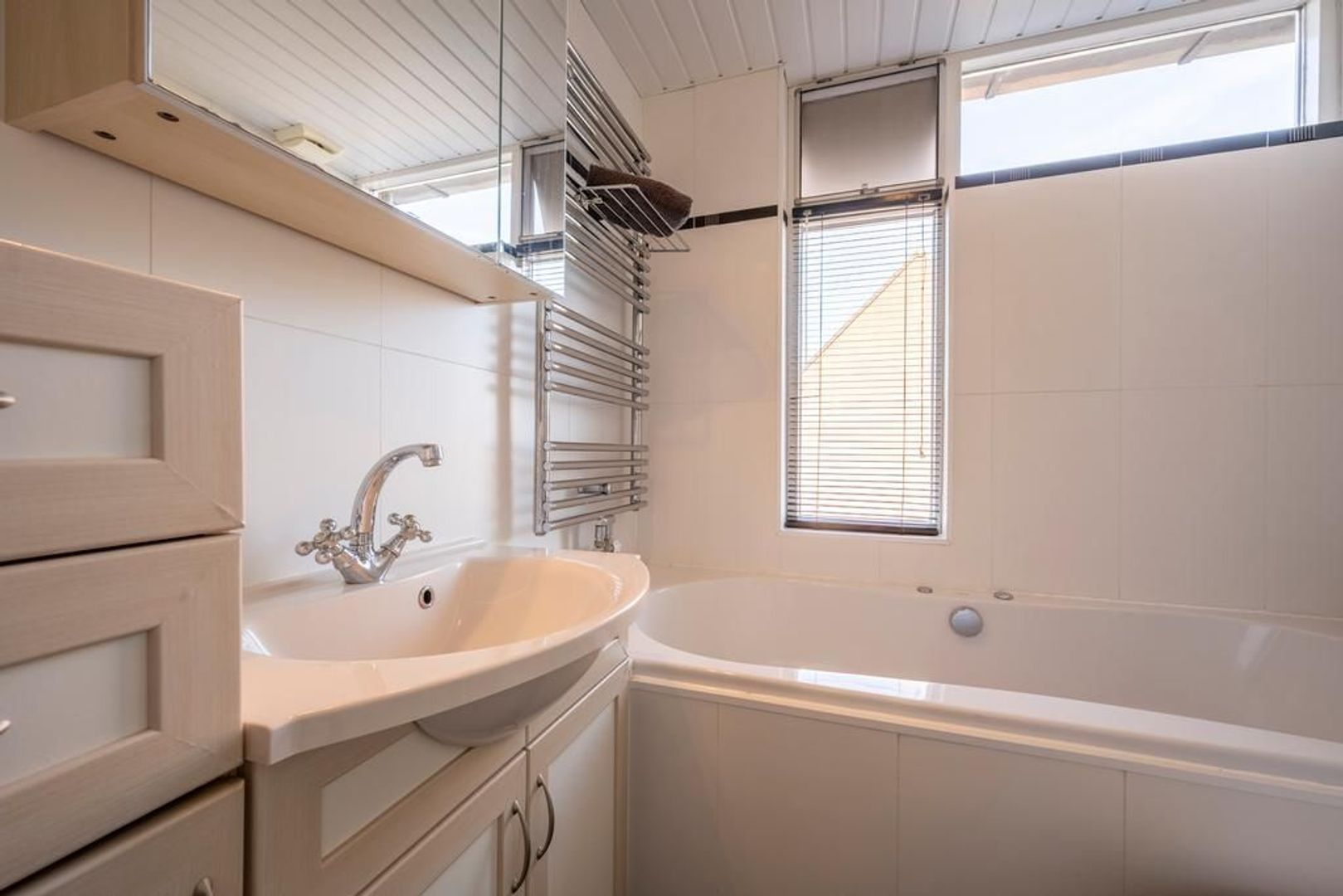 Op de eerste verdieping zijn twee ruime slaapkamers en de badkamer. Deze is volledig betegeld en uitgevoerd met een bubbelbad, douchecabine met regendouche, wastafelmeubel en een tweede toilet. Een groot raam zorgt voor extra licht en ventilatie.