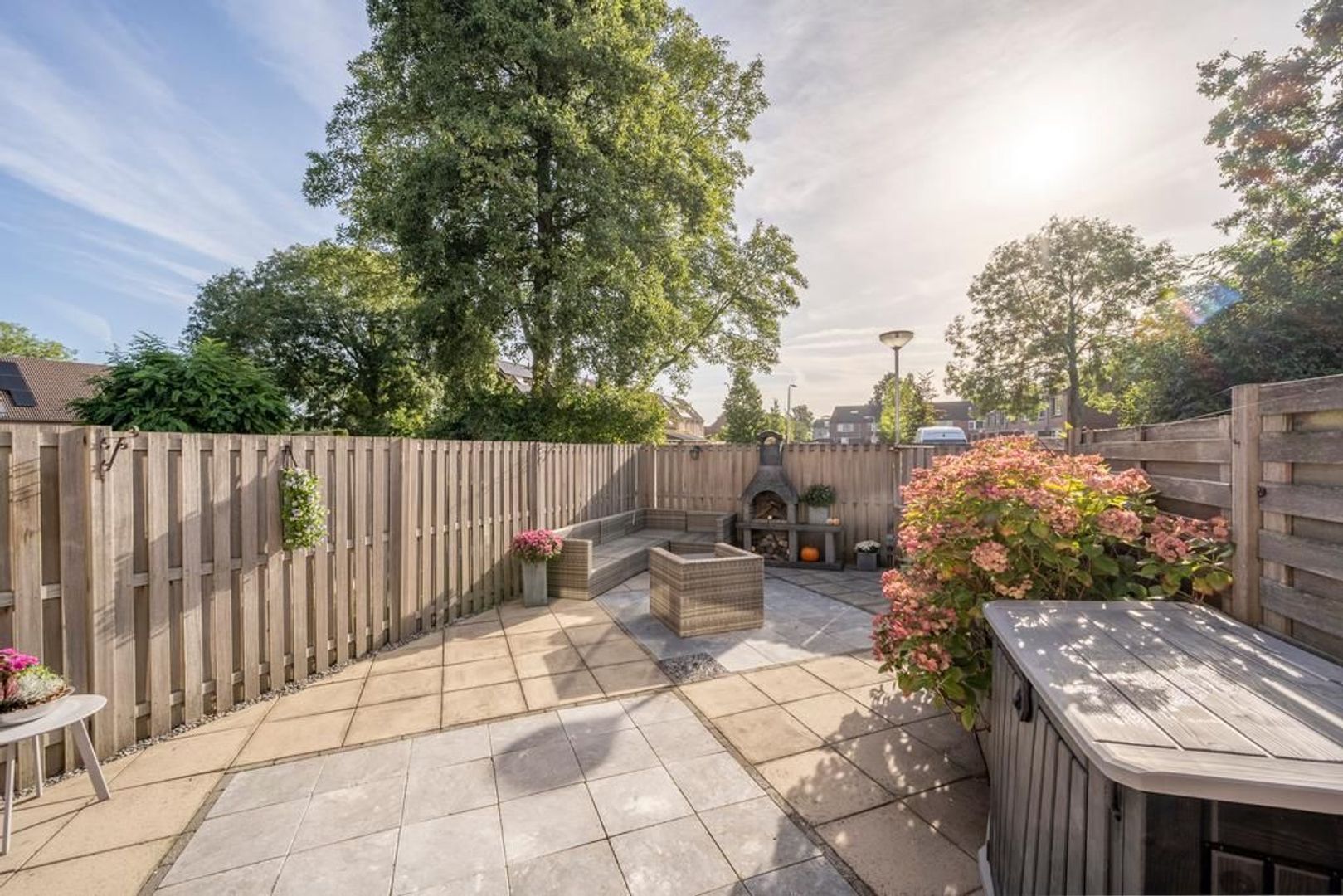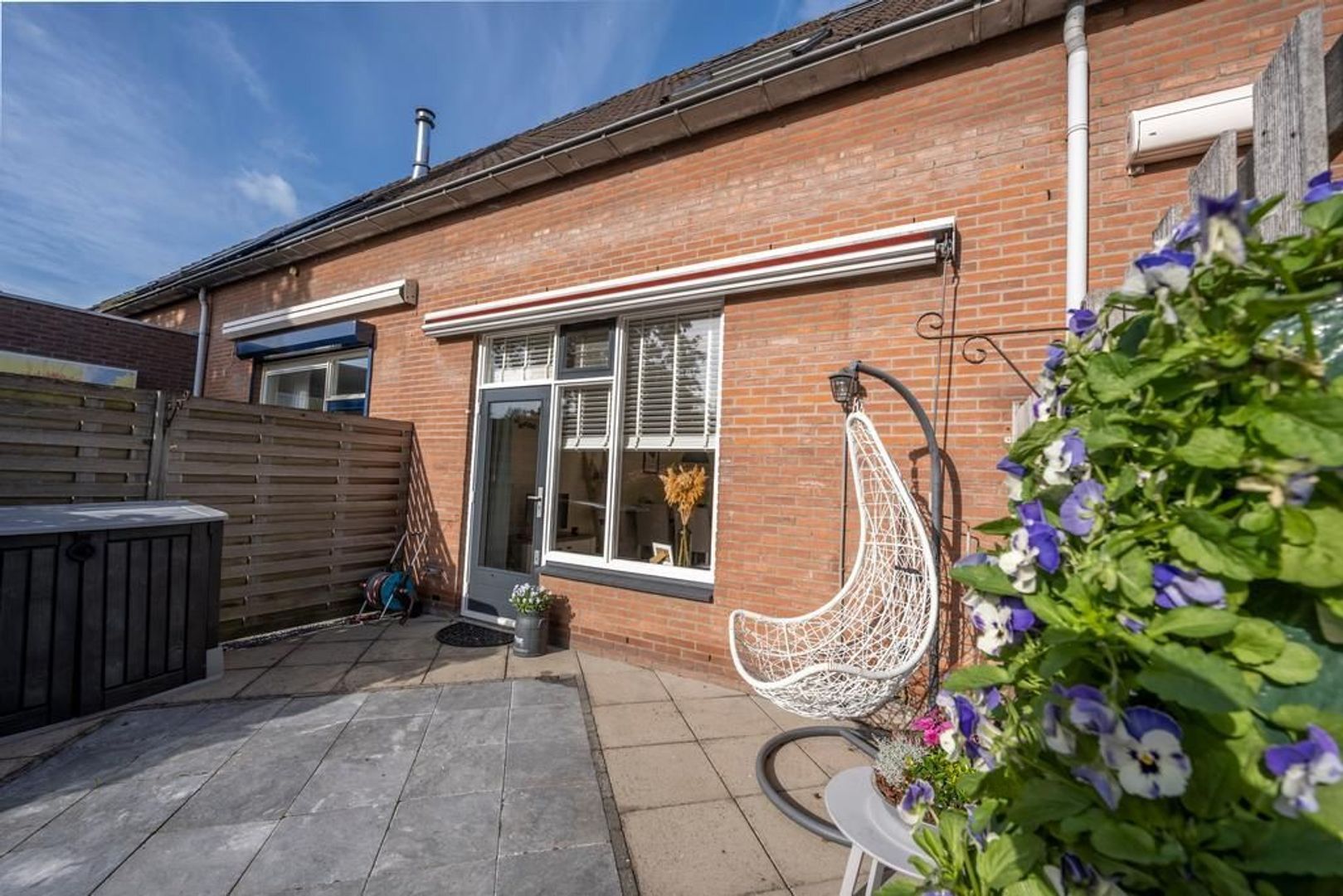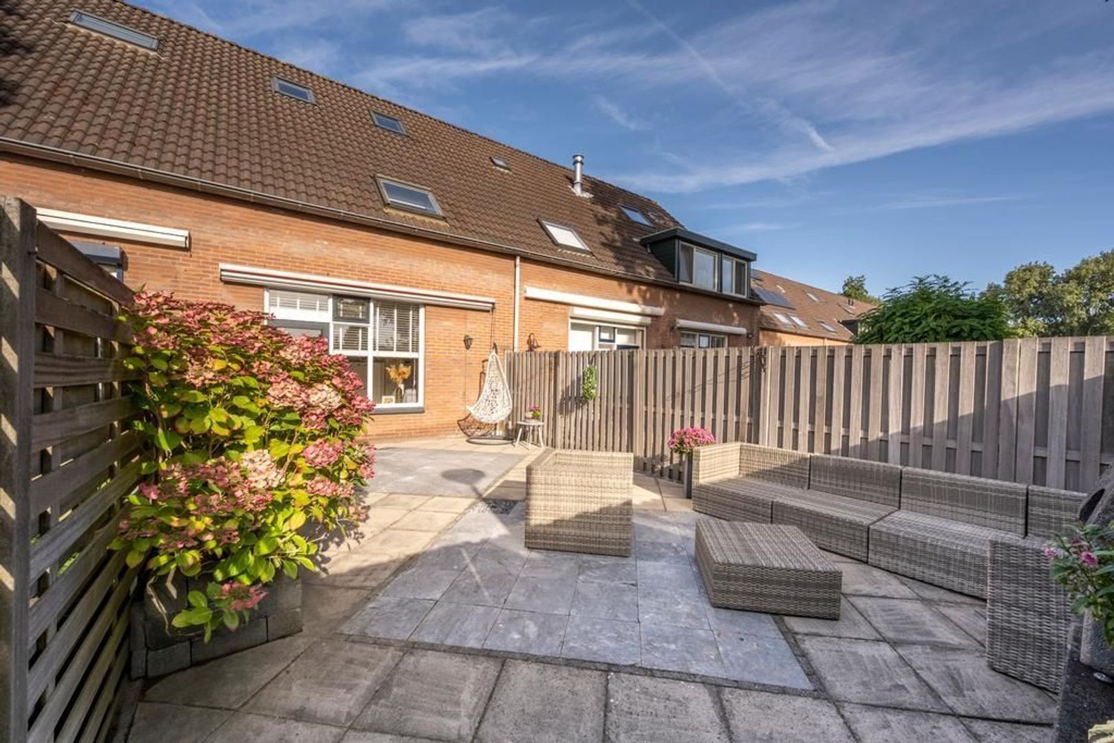 In de op het zuidoosten gelegen achtertuin is altijd wel een plekje in de zon of schaduw te vinden. Omdat er aan het einde van de tuin geen directe bebouwing ligt, geeft de tuin een heerlijk vrij gevoel.