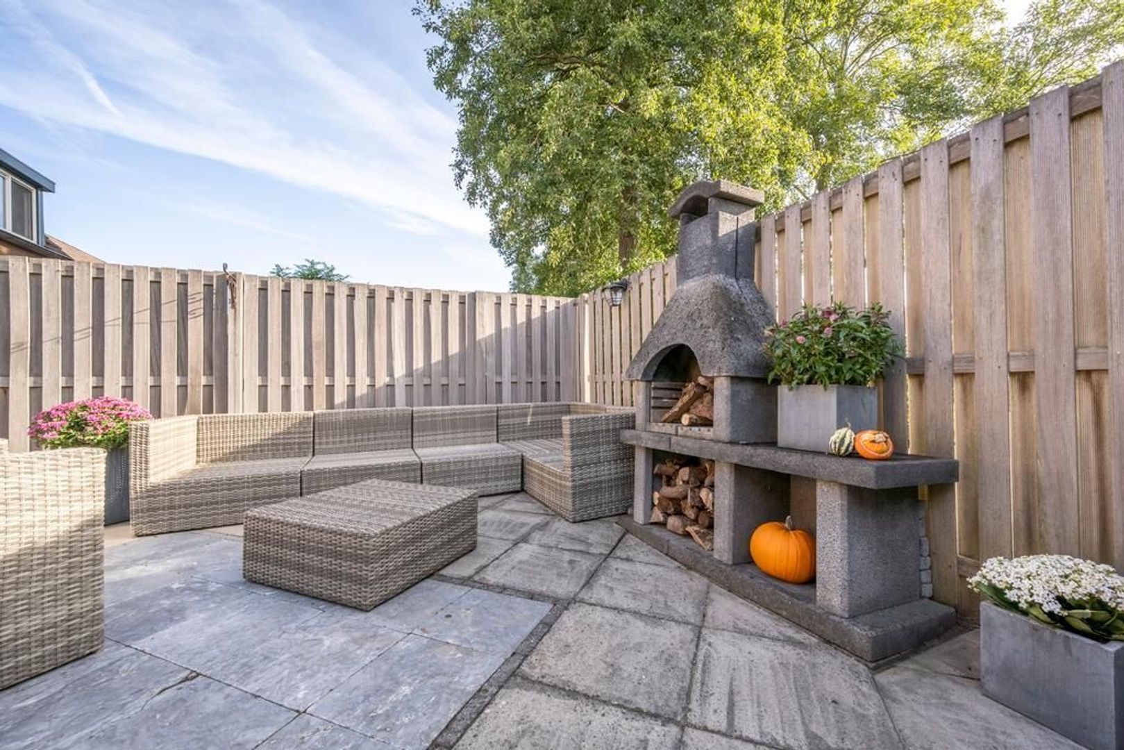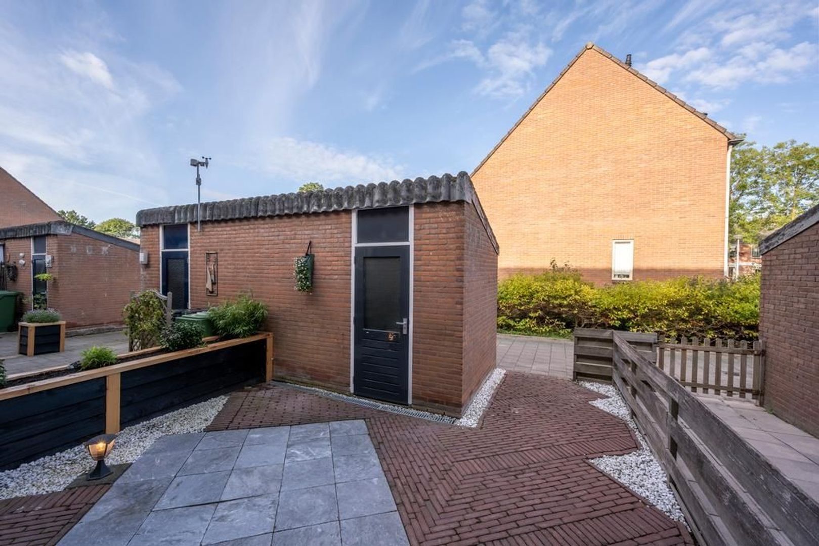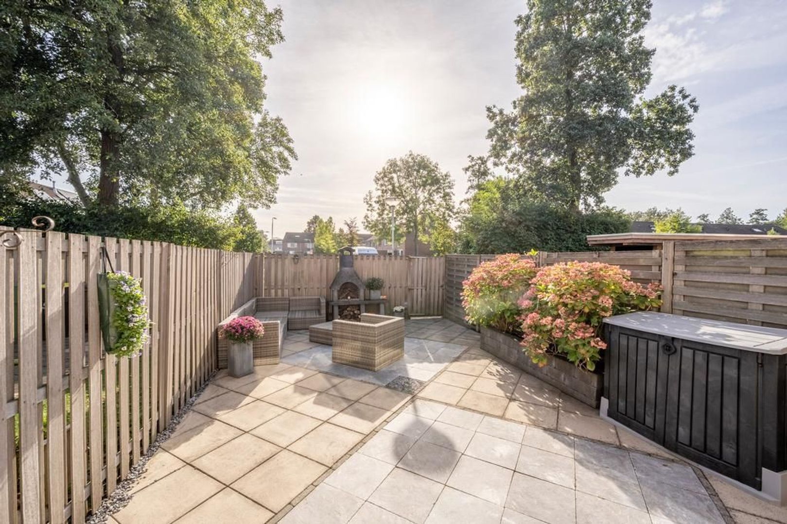In de op het zuidoosten gelegen achtertuin is altijd wel een plekje in de zon of schaduw te vinden. Omdat er aan het einde van de tuin geen directe bebouwing ligt, geeft de tuin een heerlijk vrij gevoel.