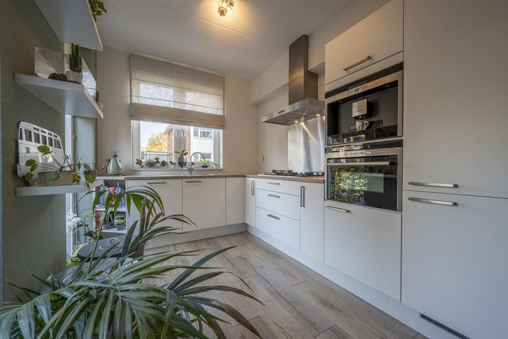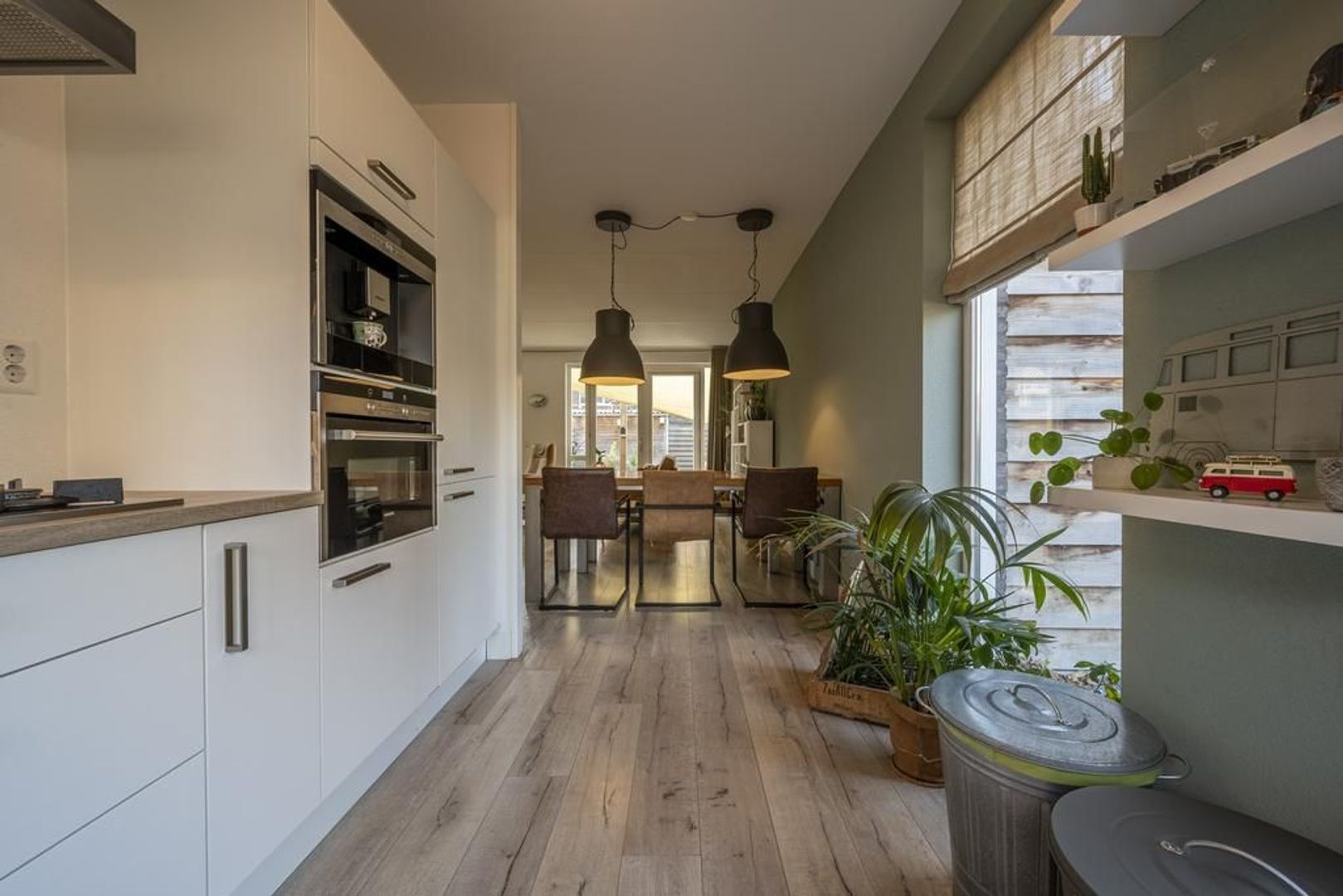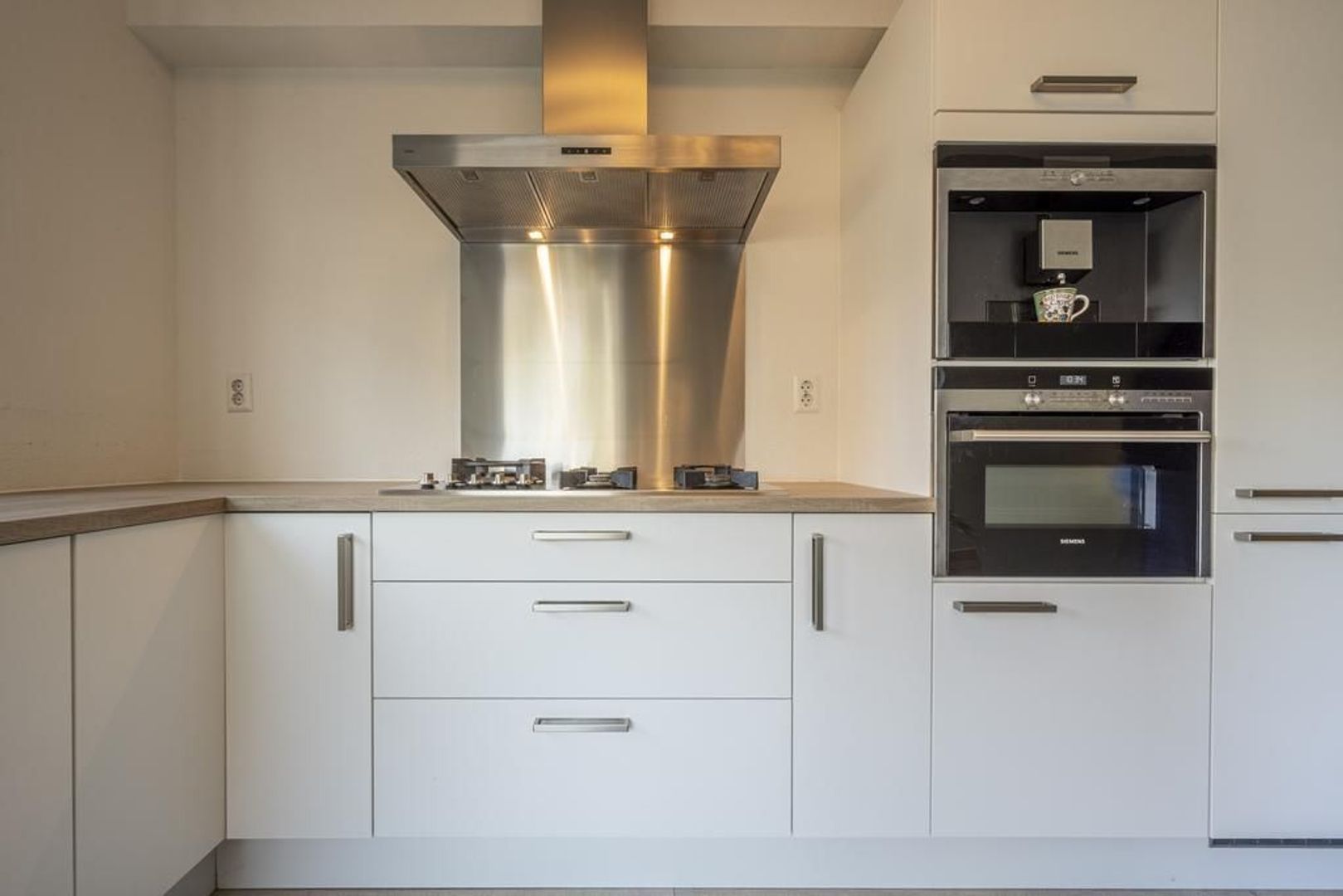 Door de twee grote ramen aan de zijkant is de keuken heerlijk licht. Deze is uitgevoerd in een L-opstelling met de nodige inbouwapparatuur, te weten: vijfpits gaskookplaat, koel-vriescombinatie, vaatwasser, combi-magnetron, afzuigkap en een koffiemachine.