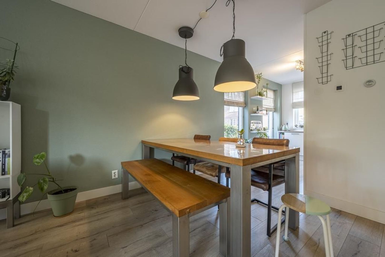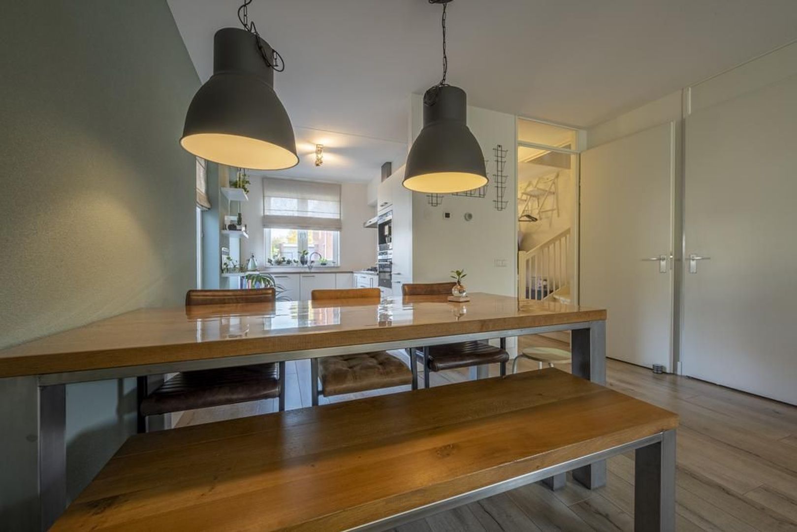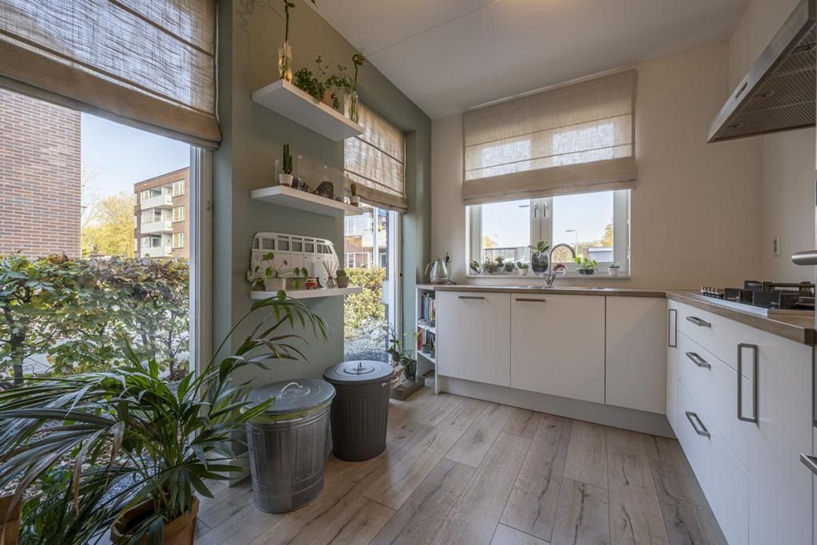 Door de twee grote ramen aan de zijkant is de keuken heerlijk licht. Deze is uitgevoerd in een L-opstelling met de nodige inbouwapparatuur, te weten: vijfpits gaskookplaat, koel-vriescombinatie, vaatwasser, combi-magnetron, afzuigkap en een koffiemachine.