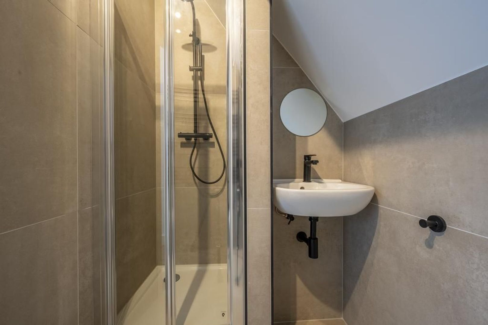 De badkamer is uitgevoerd met een doucheruimte, een toilet en een wasbakje.