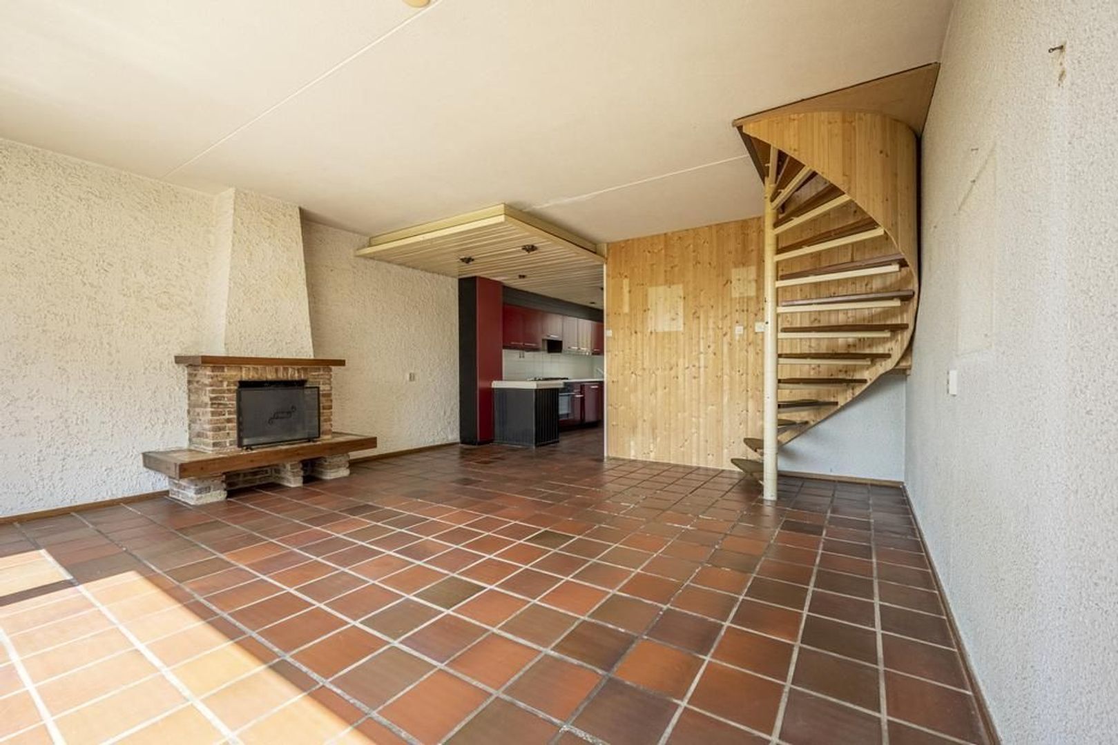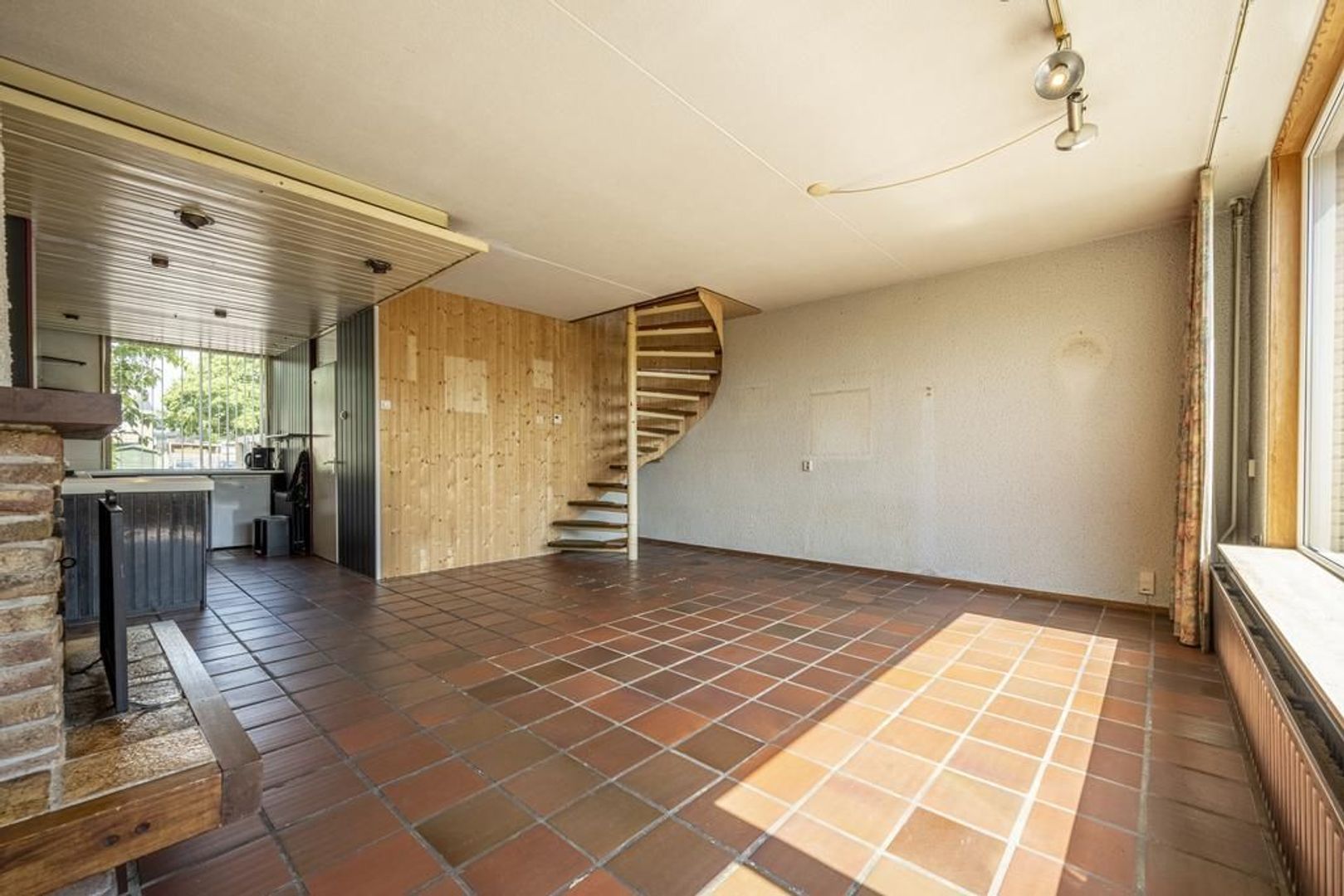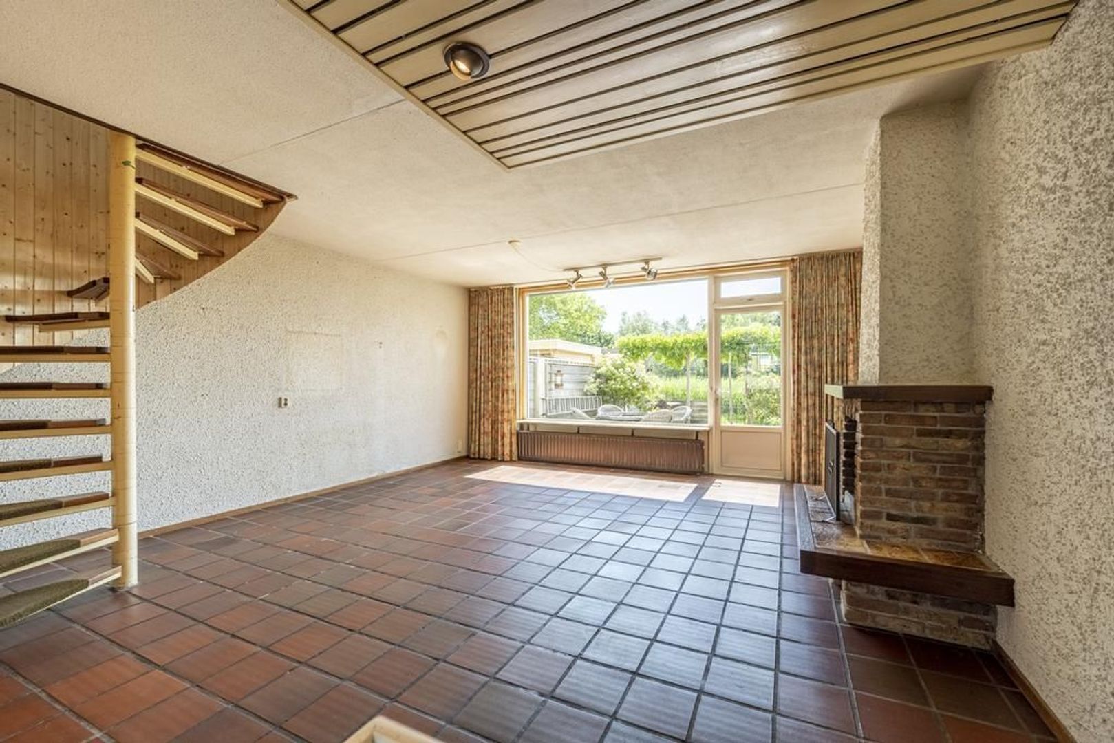 Tuingerichte woonkamer met openhaard en trapopgang.