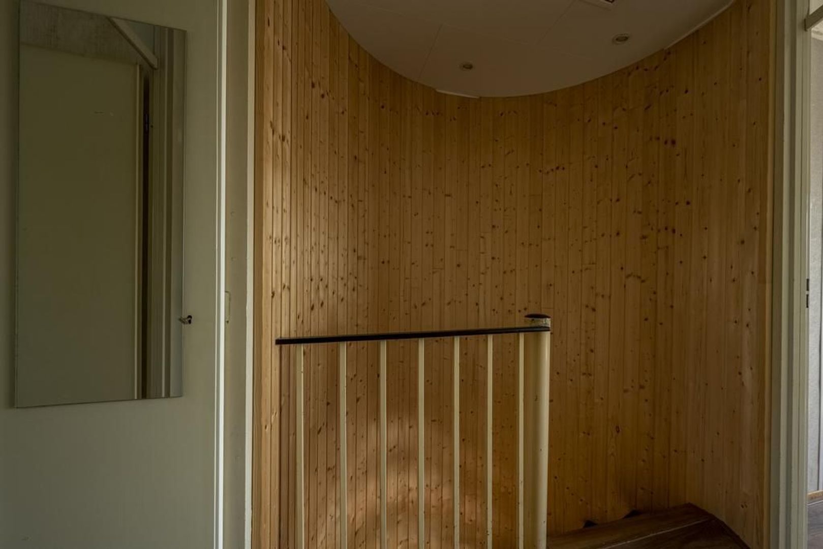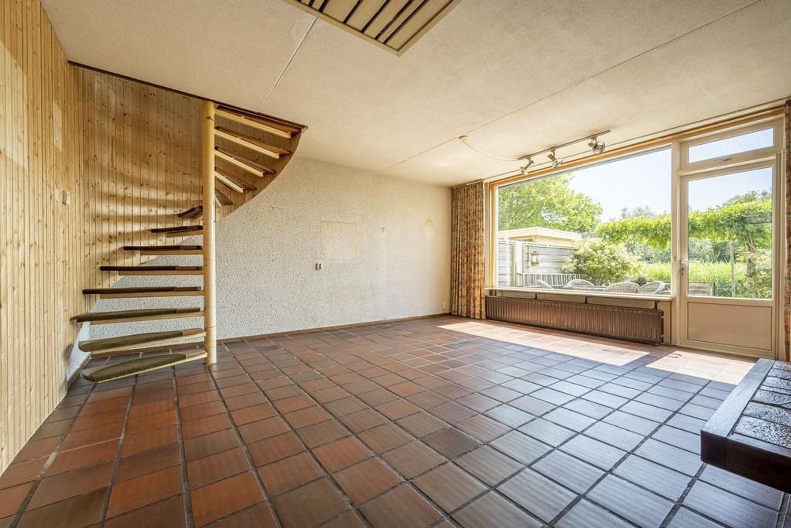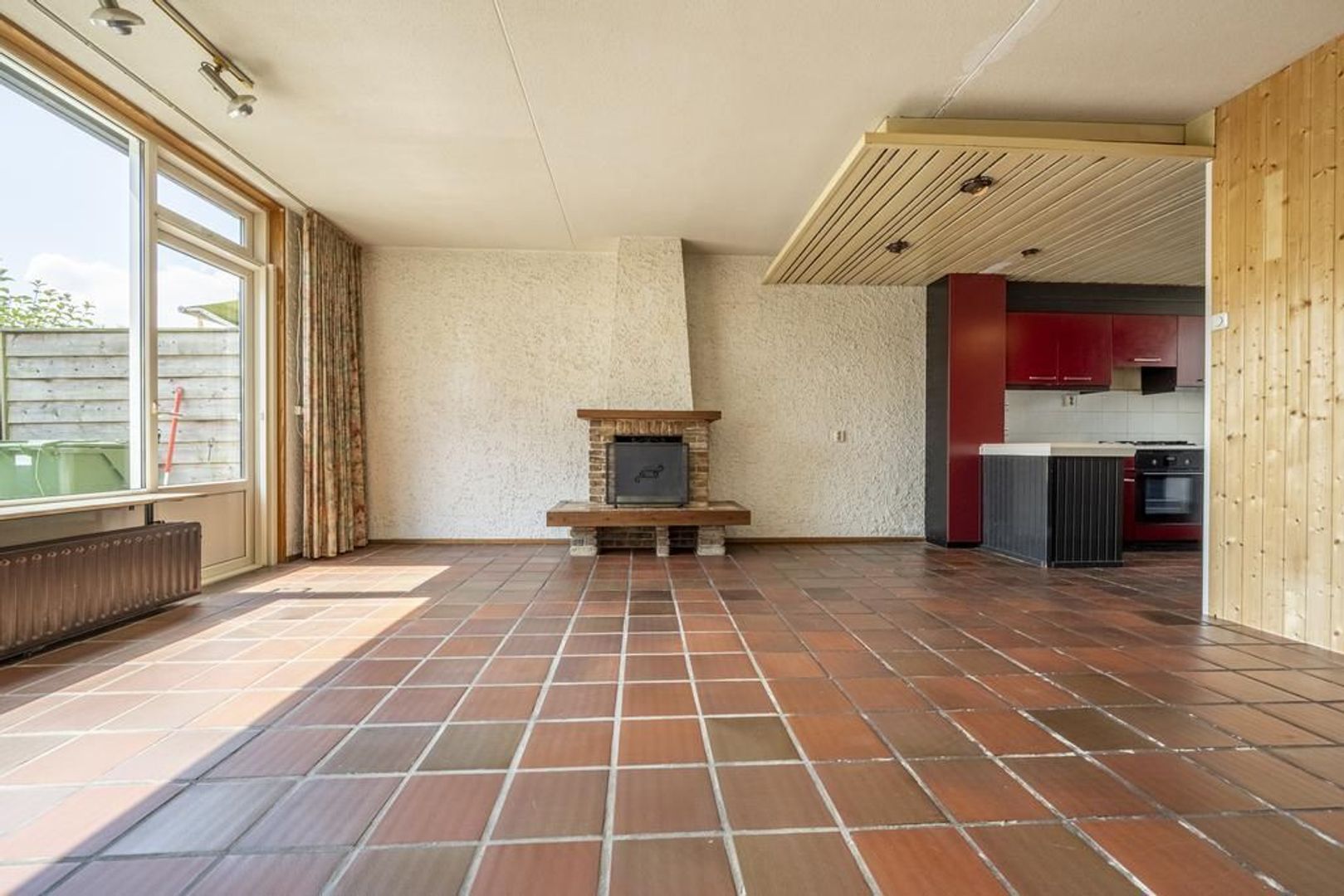 Tuingerichte woonkamer met openhaard en trapopgang.