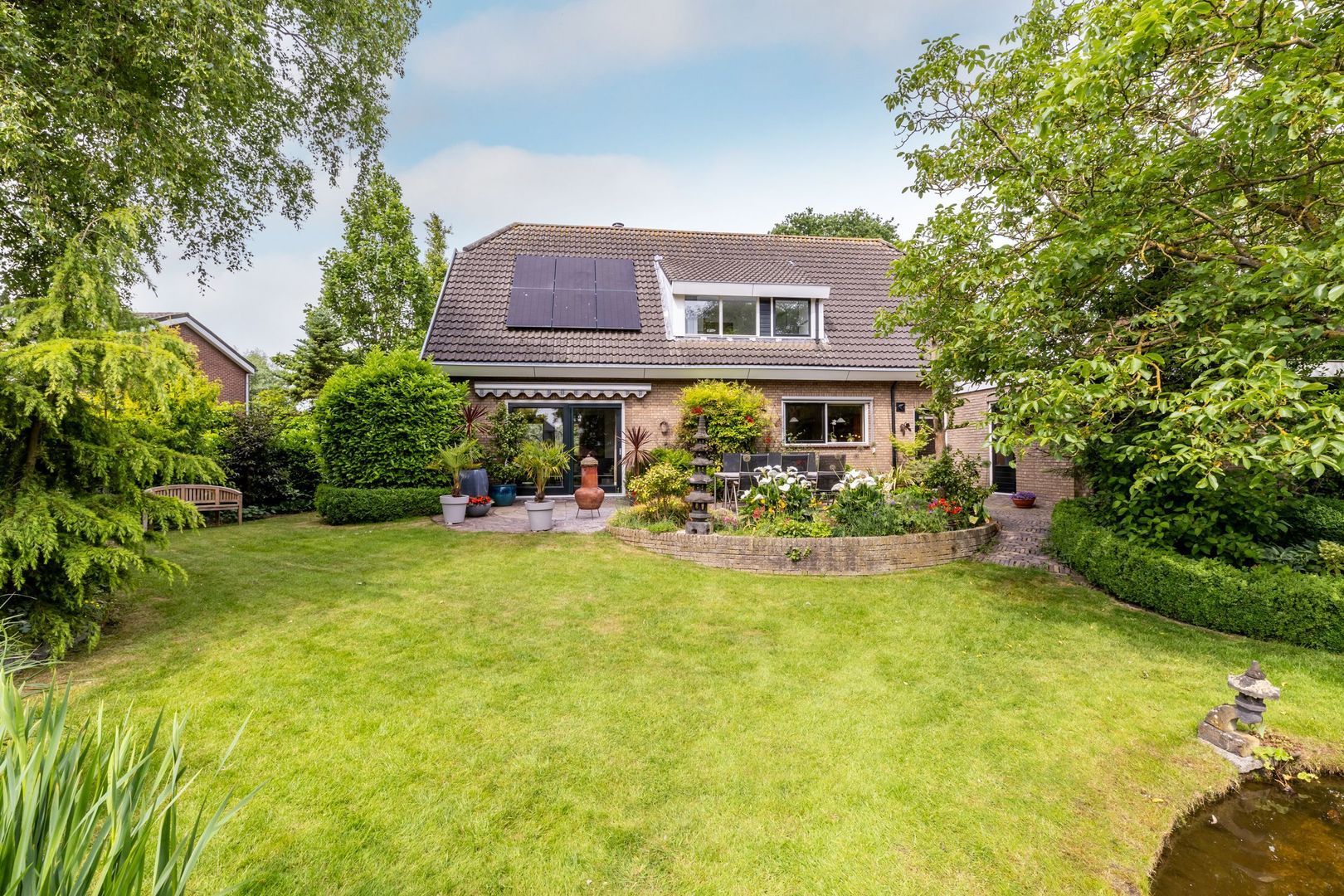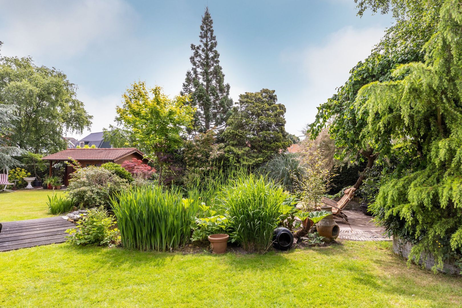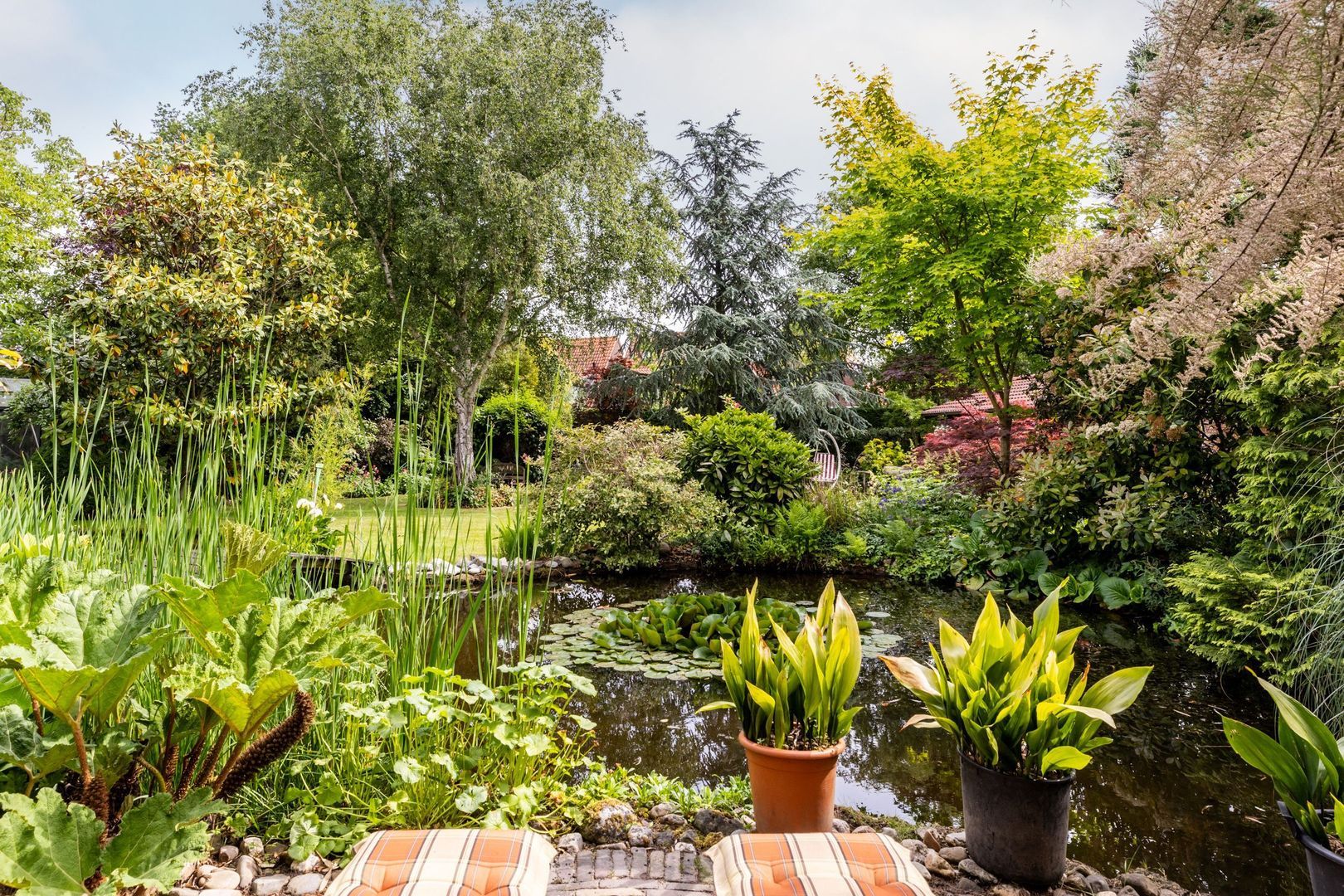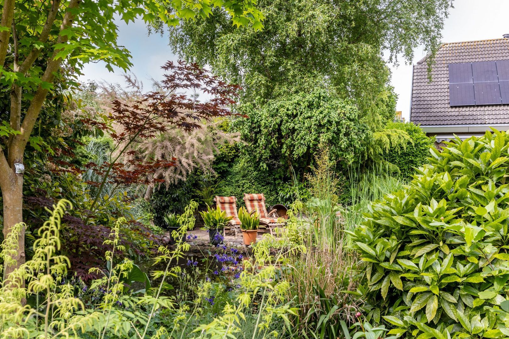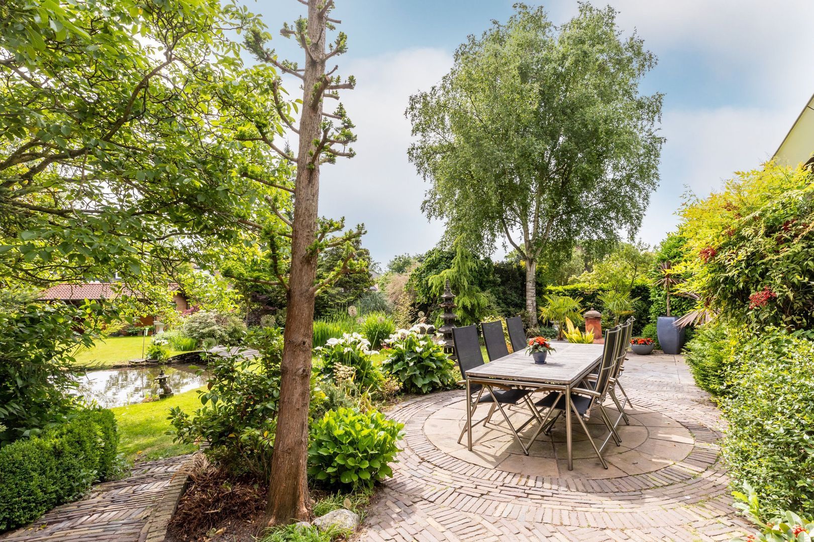 De achtertuin is prachtig aangelegd en goed onderhouden. Direct achter de woning ligt een fraai bestraat terras, dat overgaat in het gazon met prachtige borders, volwassen bomen en struiken, een vijverpartij en een mooi houten tuinhuis. Een hobbykas om zelf in te telen ontbreekt niet. Ook middenin de tuin ligt een fraai terras.