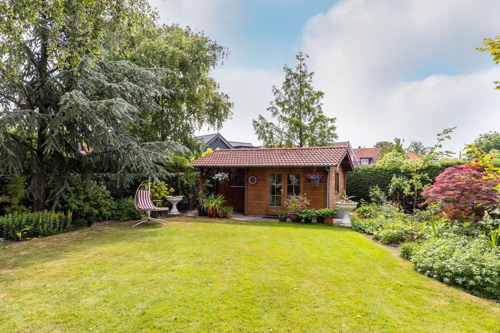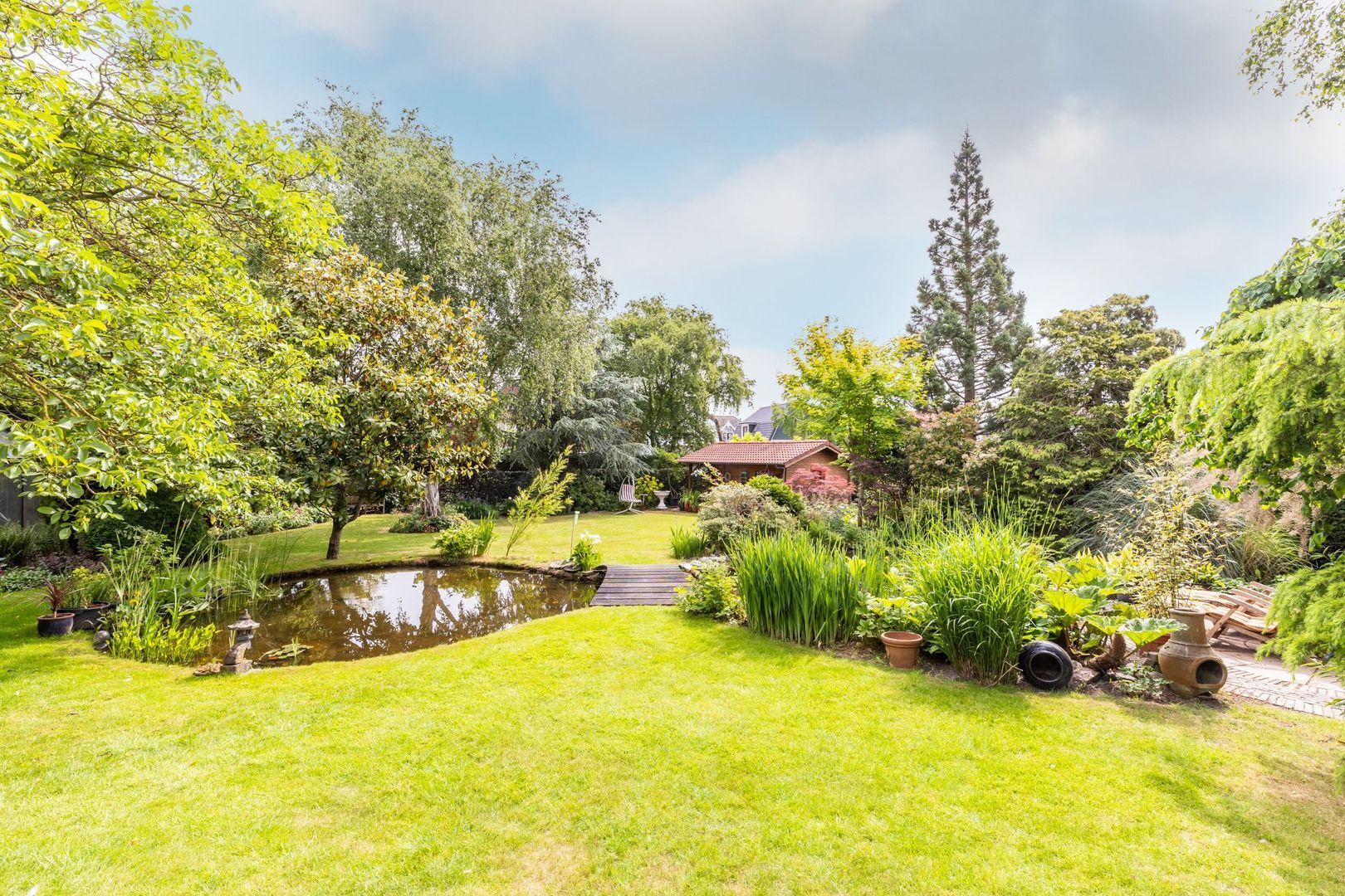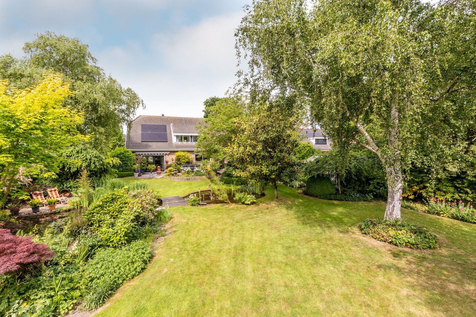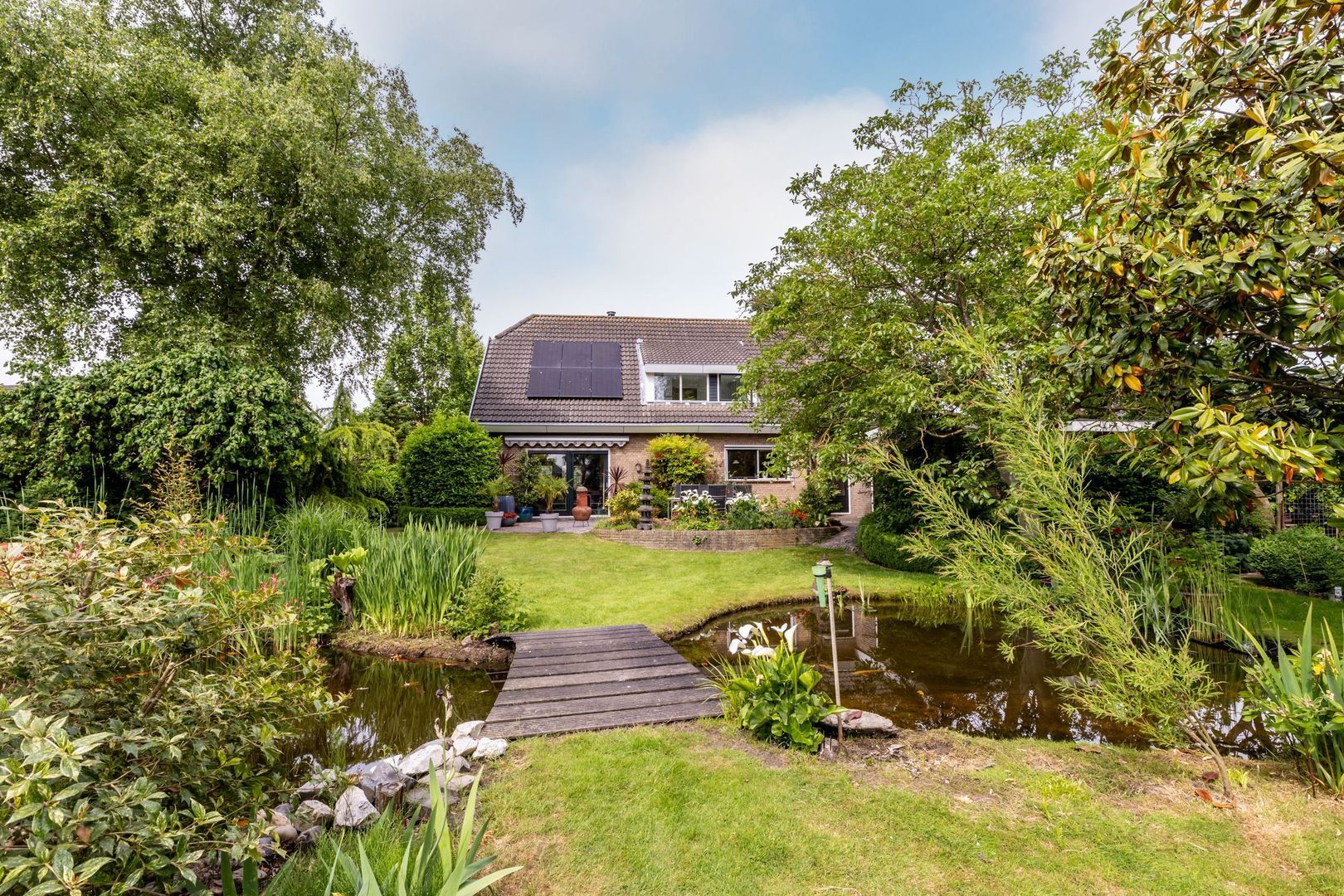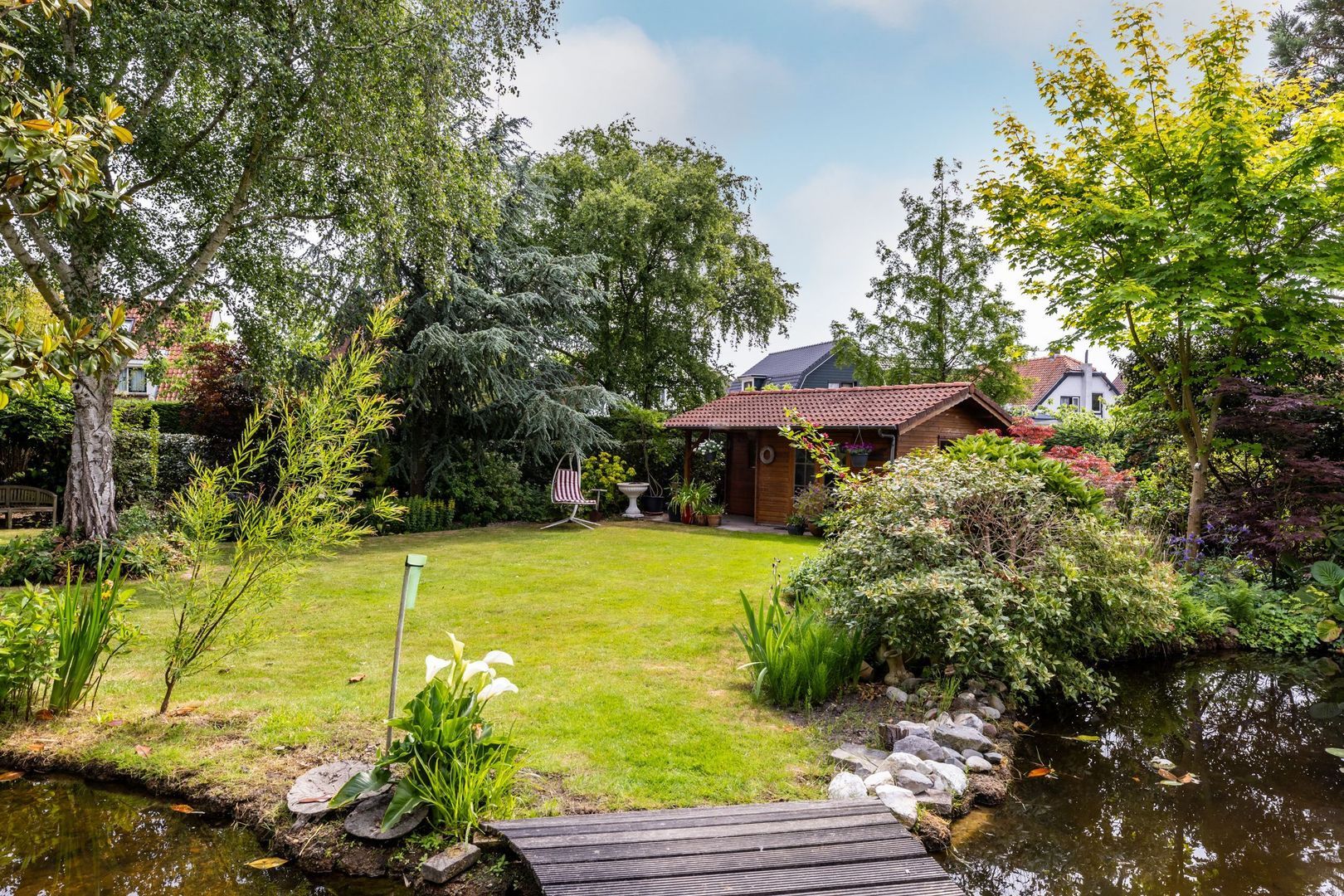 De achtertuin is prachtig aangelegd en goed onderhouden. Direct achter de woning ligt een fraai bestraat terras, dat overgaat in het gazon met prachtige borders, volwassen bomen en struiken, een vijverpartij en een mooi houten tuinhuis. Een hobbykas om zelf in te telen ontbreekt niet. Ook middenin de tuin ligt een fraai terras.