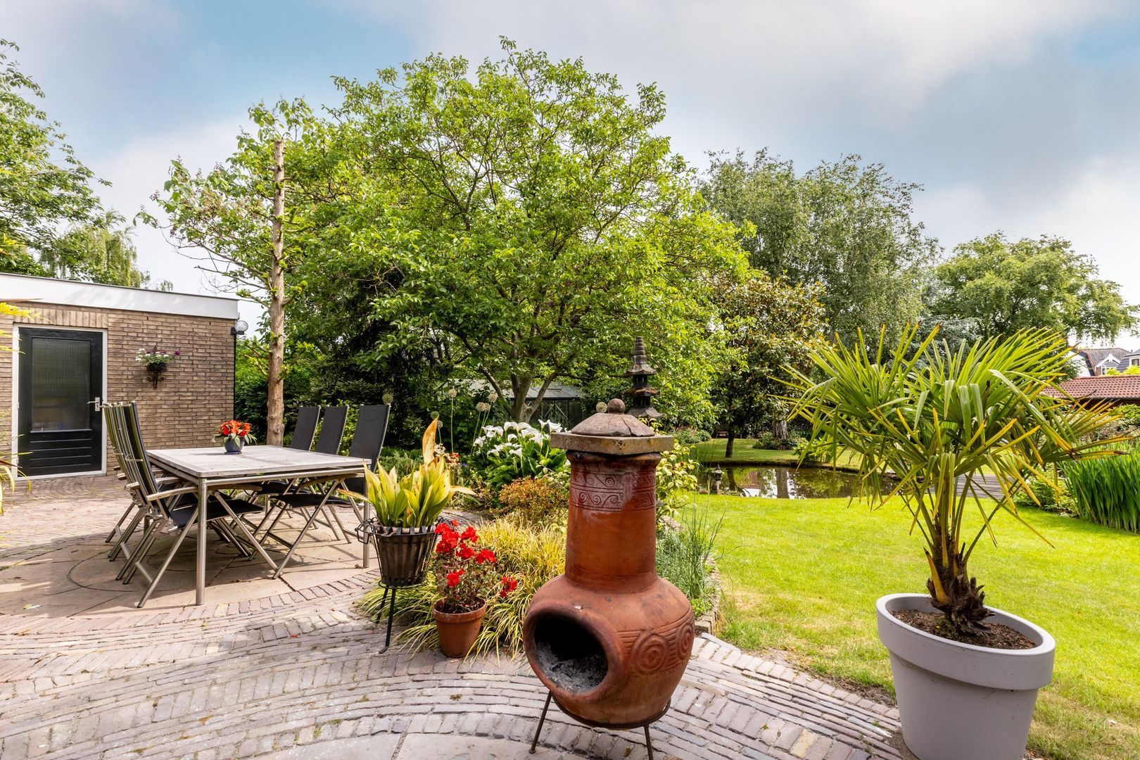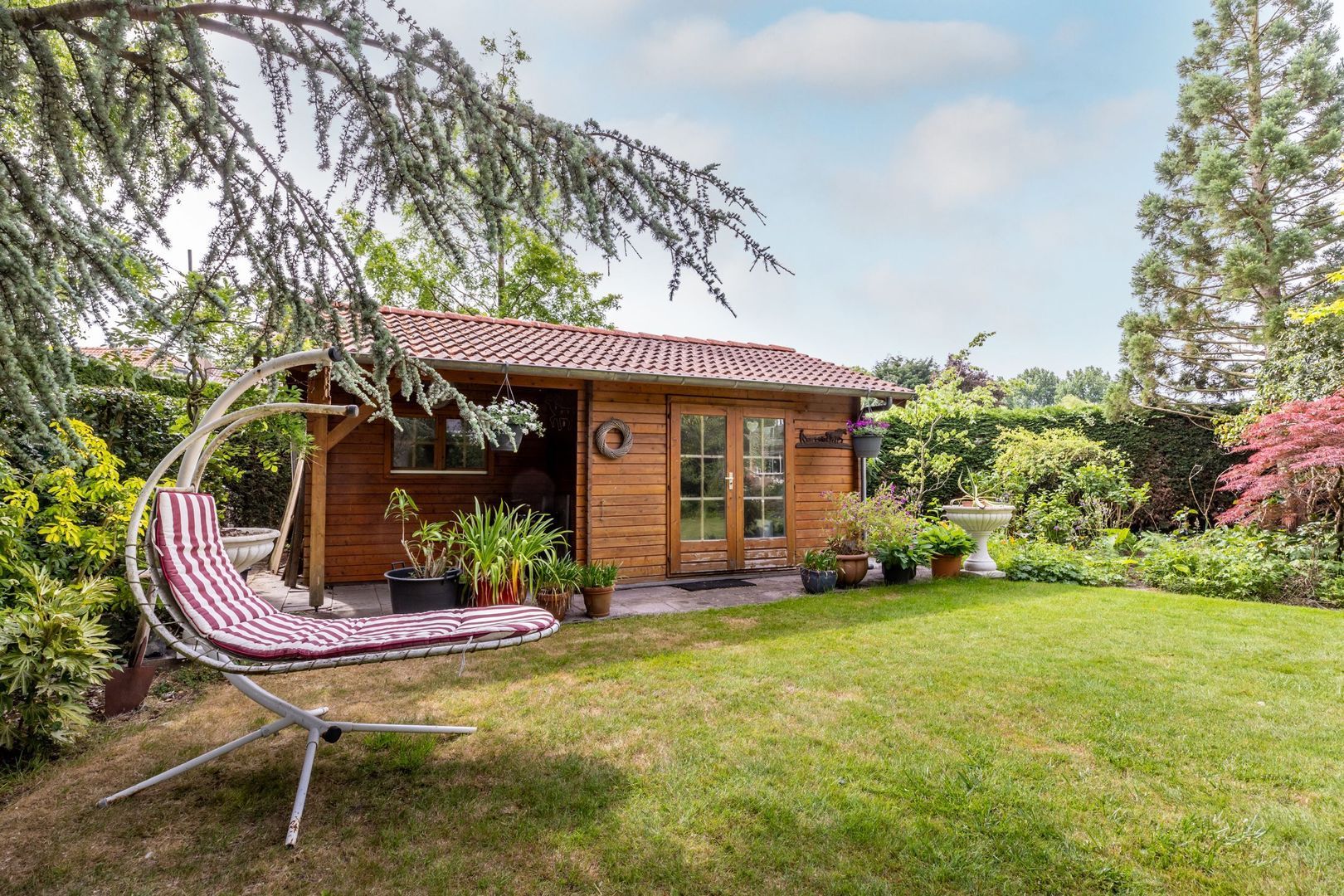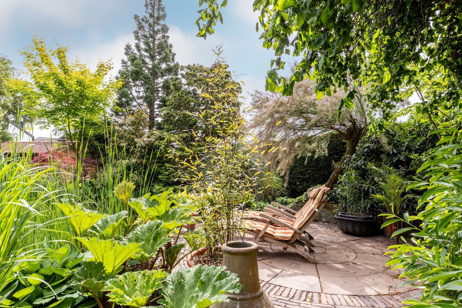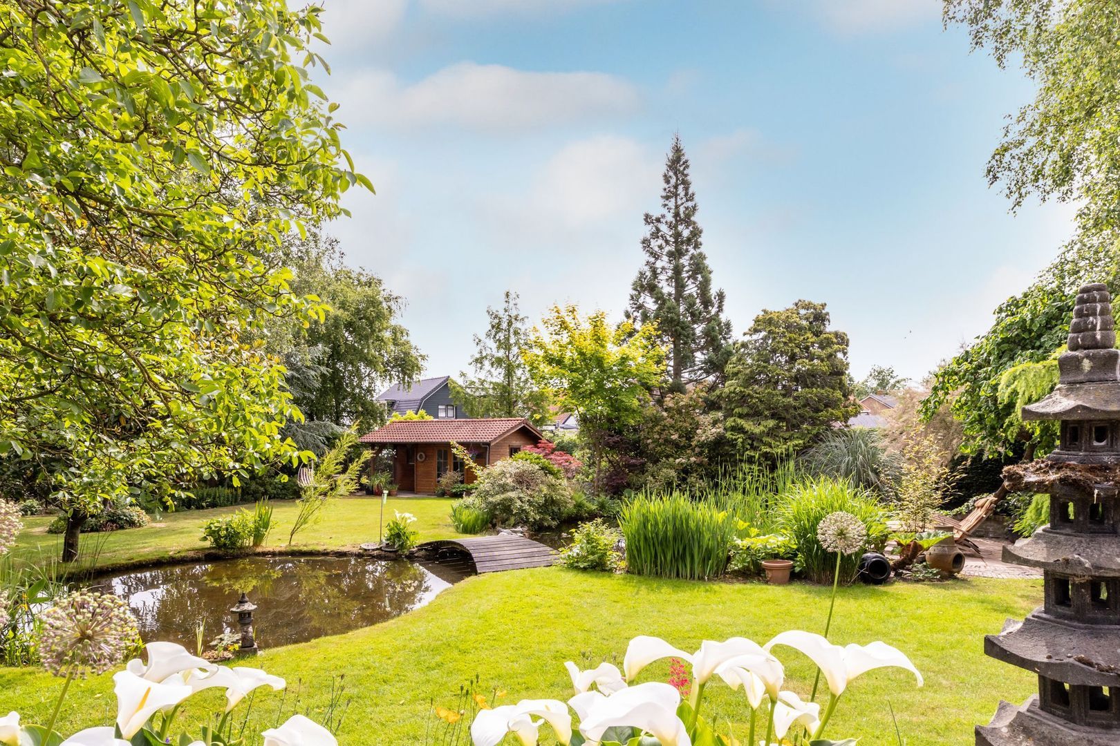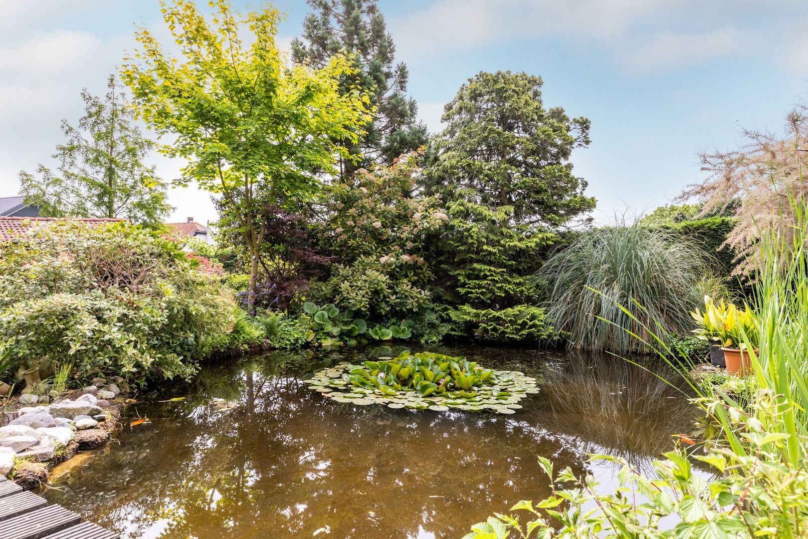 De achtertuin is prachtig aangelegd en goed onderhouden. Direct achter de woning ligt een fraai bestraat terras, dat overgaat in het gazon met prachtige borders, volwassen bomen en struiken, een vijverpartij en een mooi houten tuinhuis. Een hobbykas om zelf in te telen ontbreekt niet. Ook middenin de tuin ligt een fraai terras.