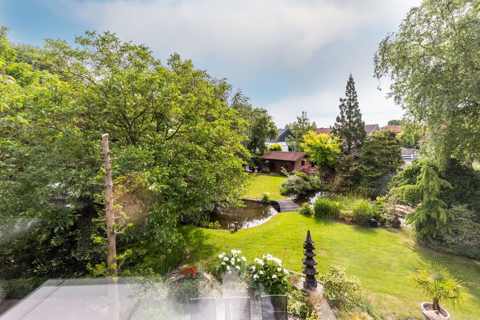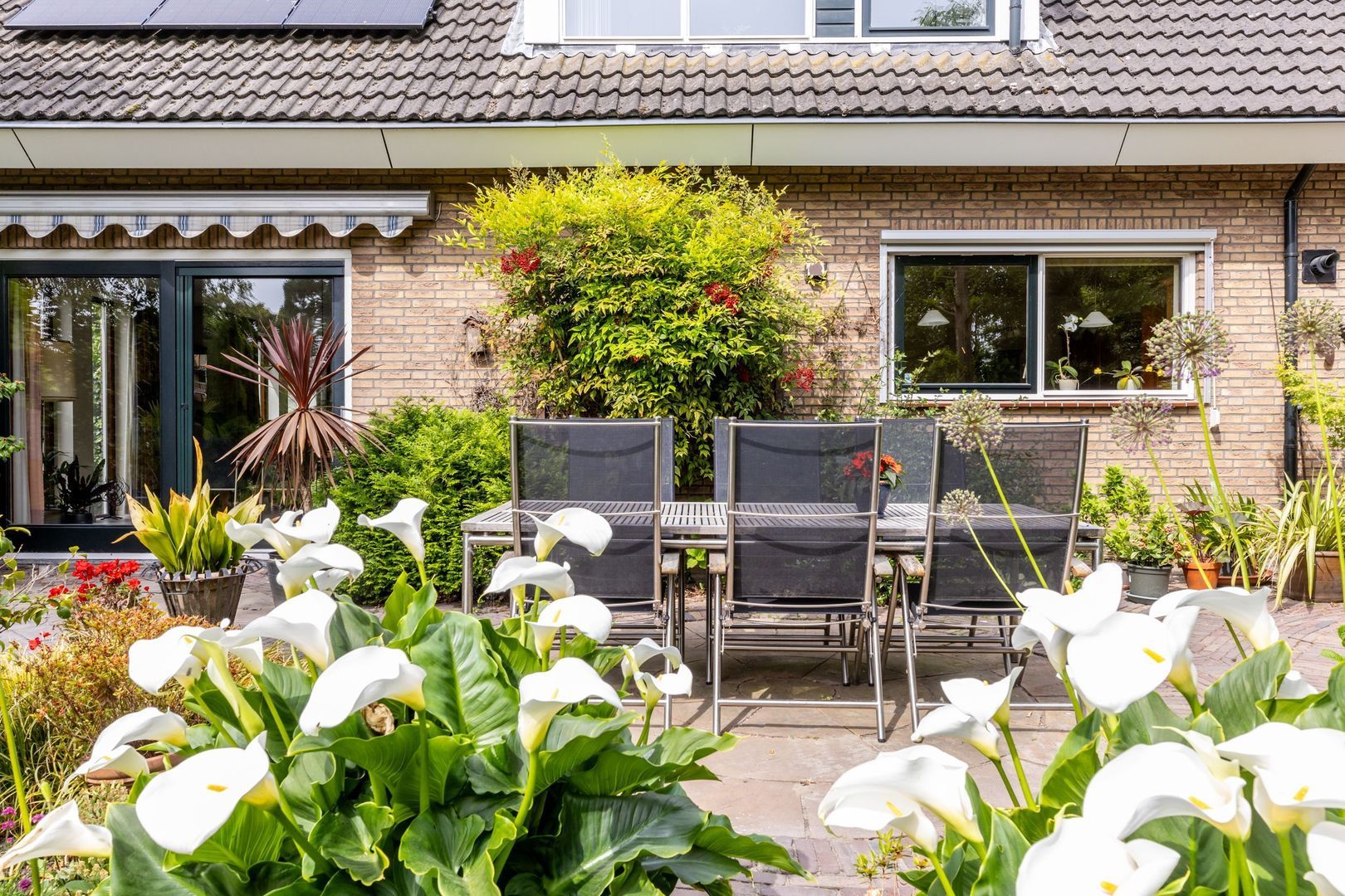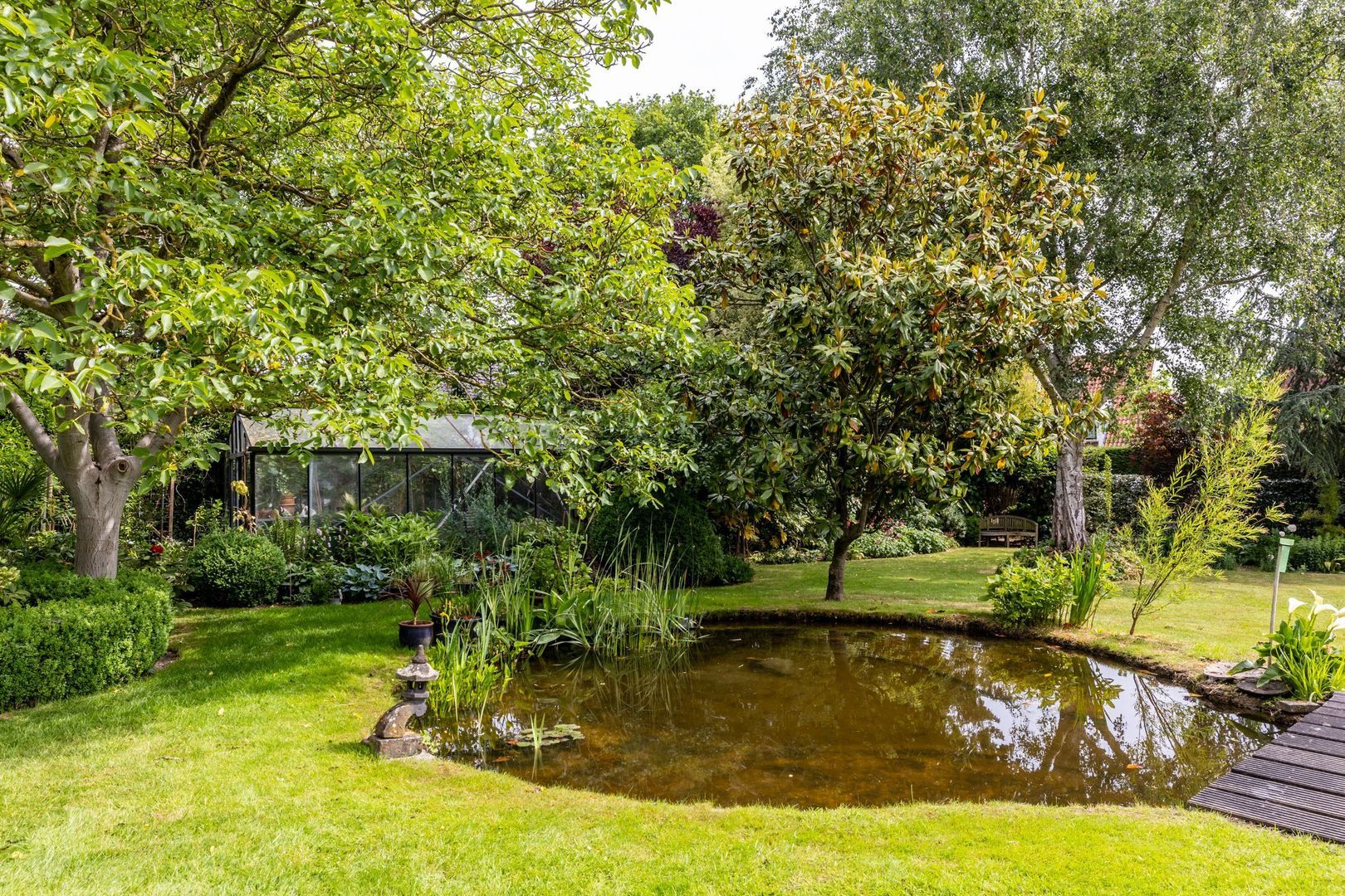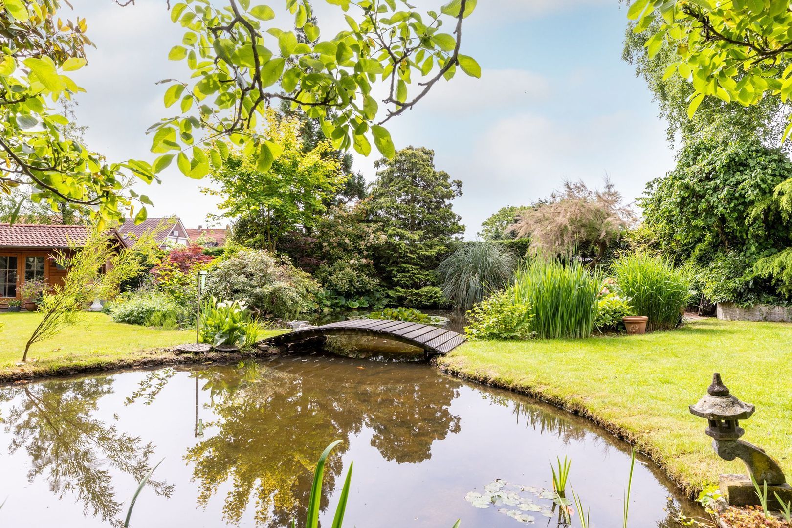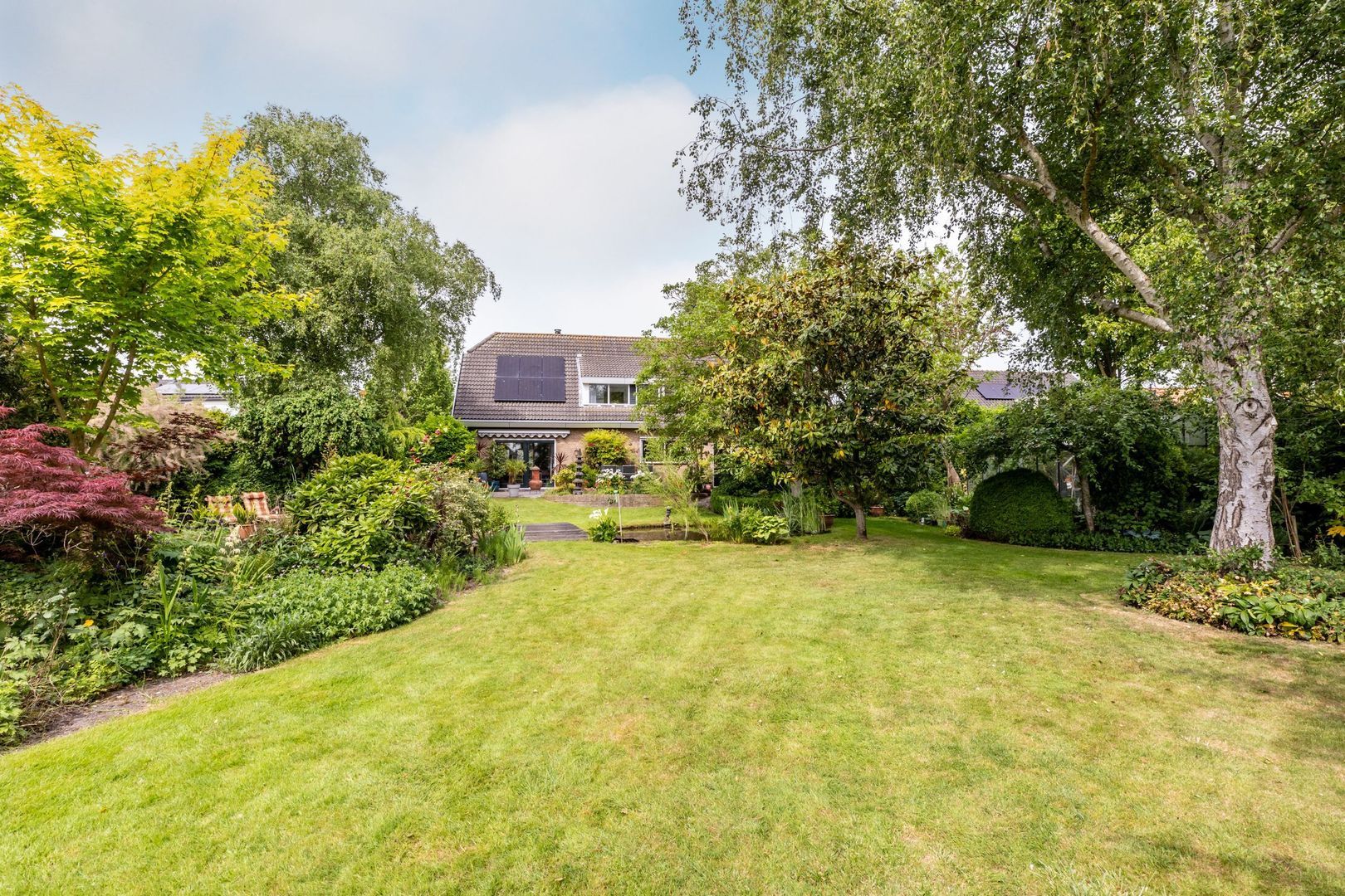 De achtertuin is prachtig aangelegd en goed onderhouden. Direct achter de woning ligt een fraai bestraat terras, dat overgaat in het gazon met prachtige borders, volwassen bomen en struiken, een vijverpartij en een mooi houten tuinhuis. Een hobbykas om zelf in te telen ontbreekt niet. Ook middenin de tuin ligt een fraai terras.