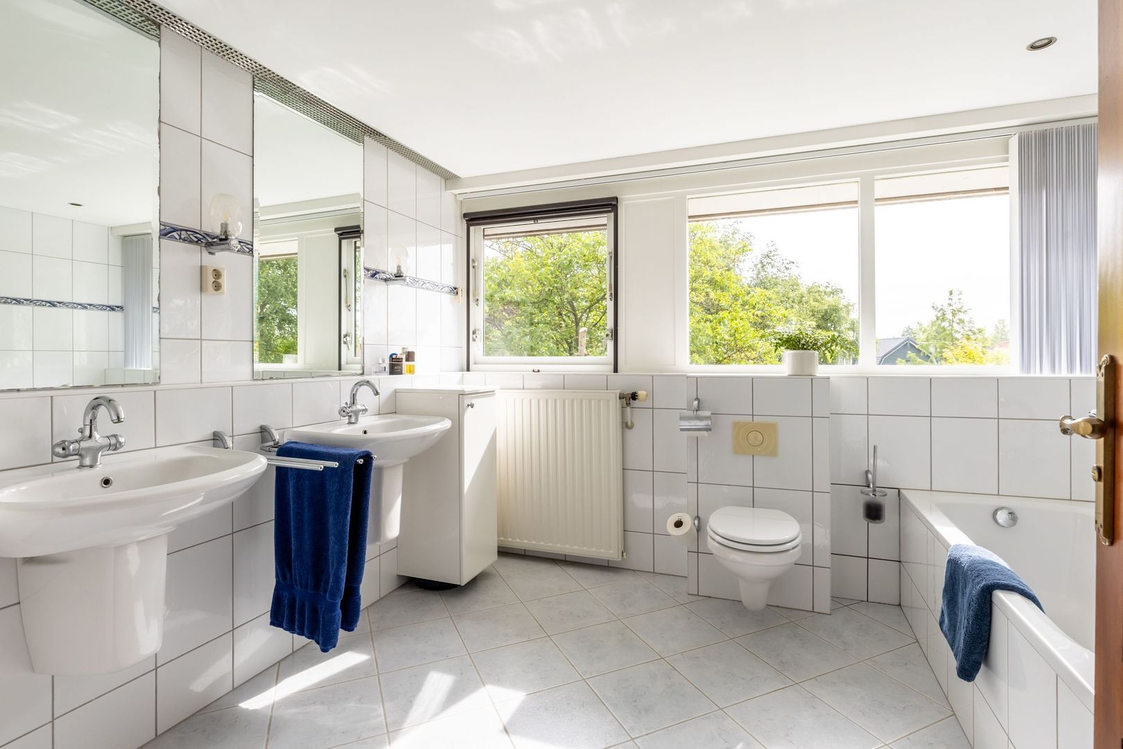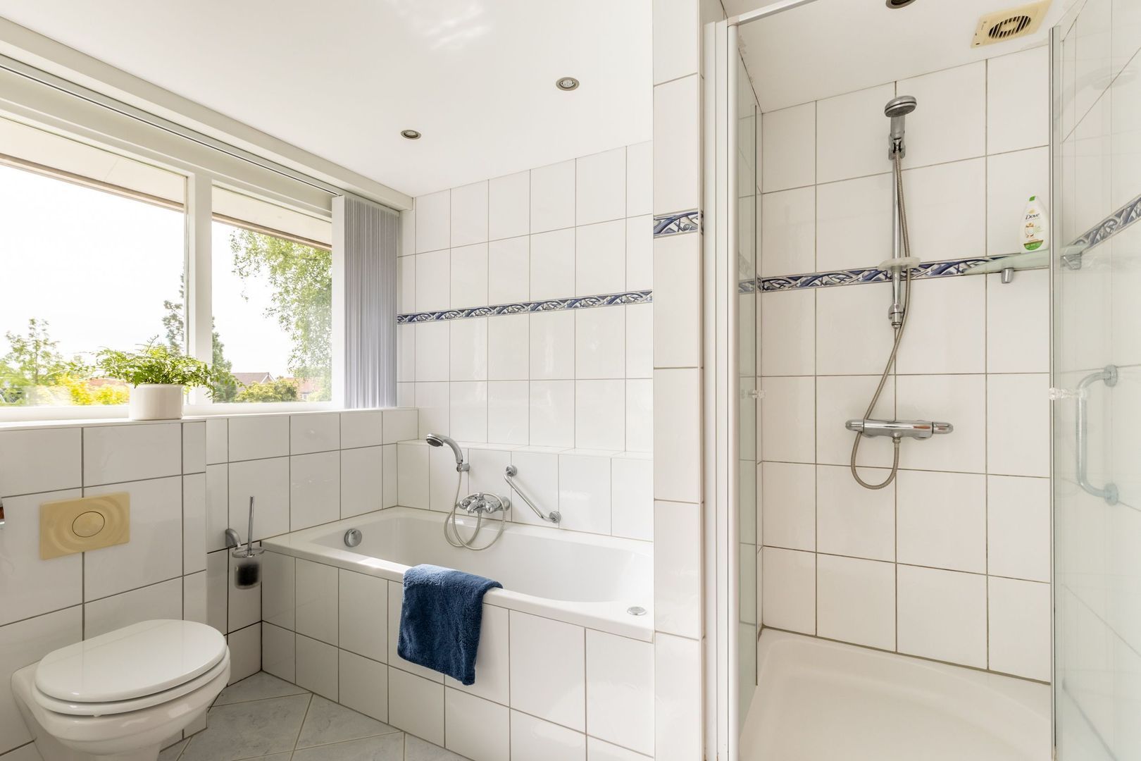 De badkamer is ingericht met een kunststof bad, een aparte doucheruimte, twee wastafels en een toilet. Het raam dat open kan, maakt ventileren met frisse buitenlucht mogelijk.
