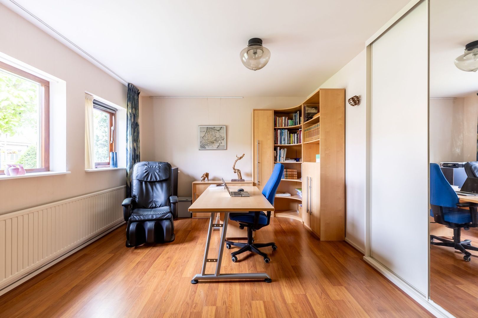 De indeling is globaal als volgt: entree, ruime hal met toiletruimte, trapopgang en toegang tot een royale werkkamer met vaste kast. De woonkamer is L-vormig en beschikt over een schouw met inzethaard en een schuifpui naar de tuin.
