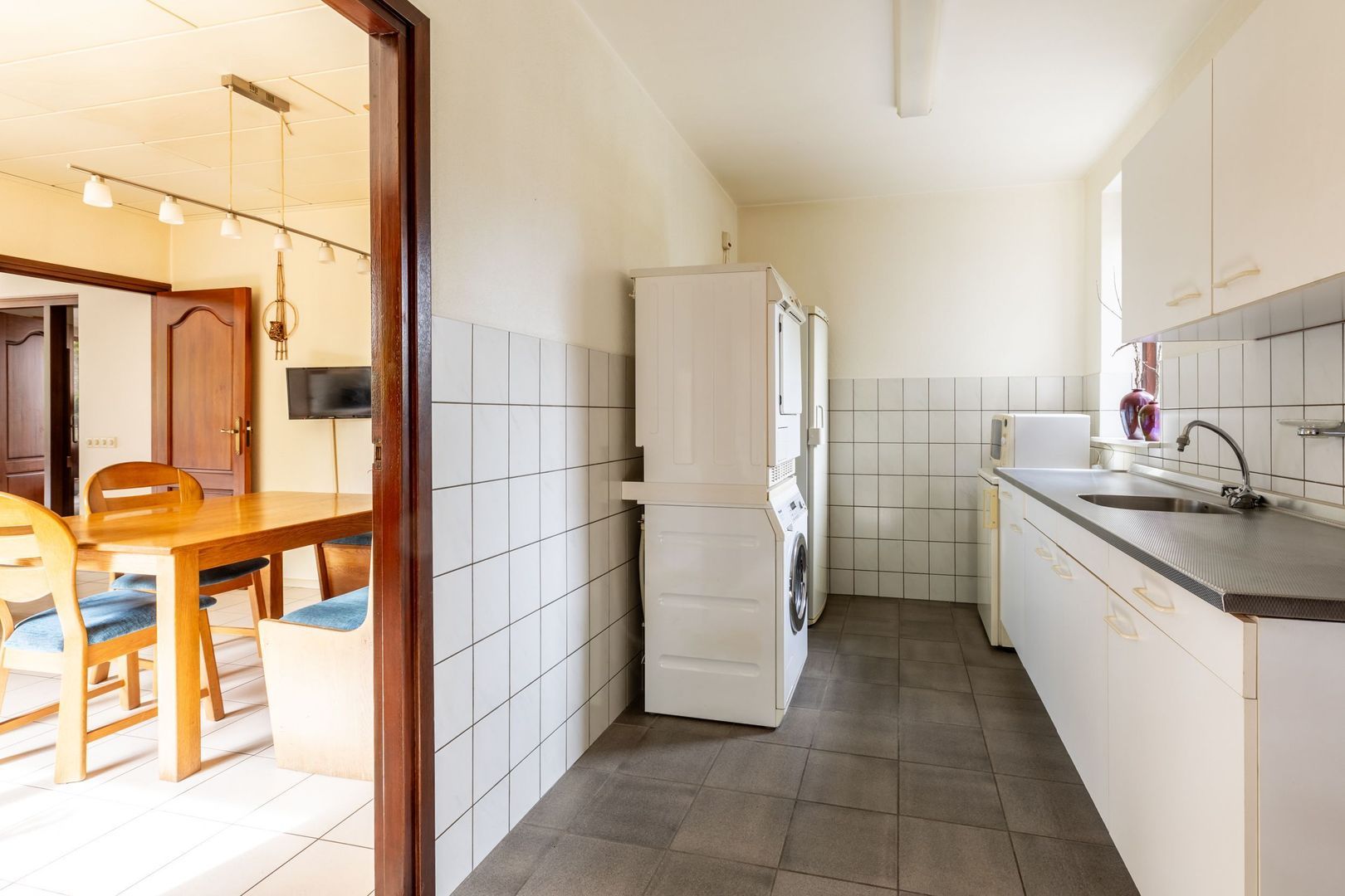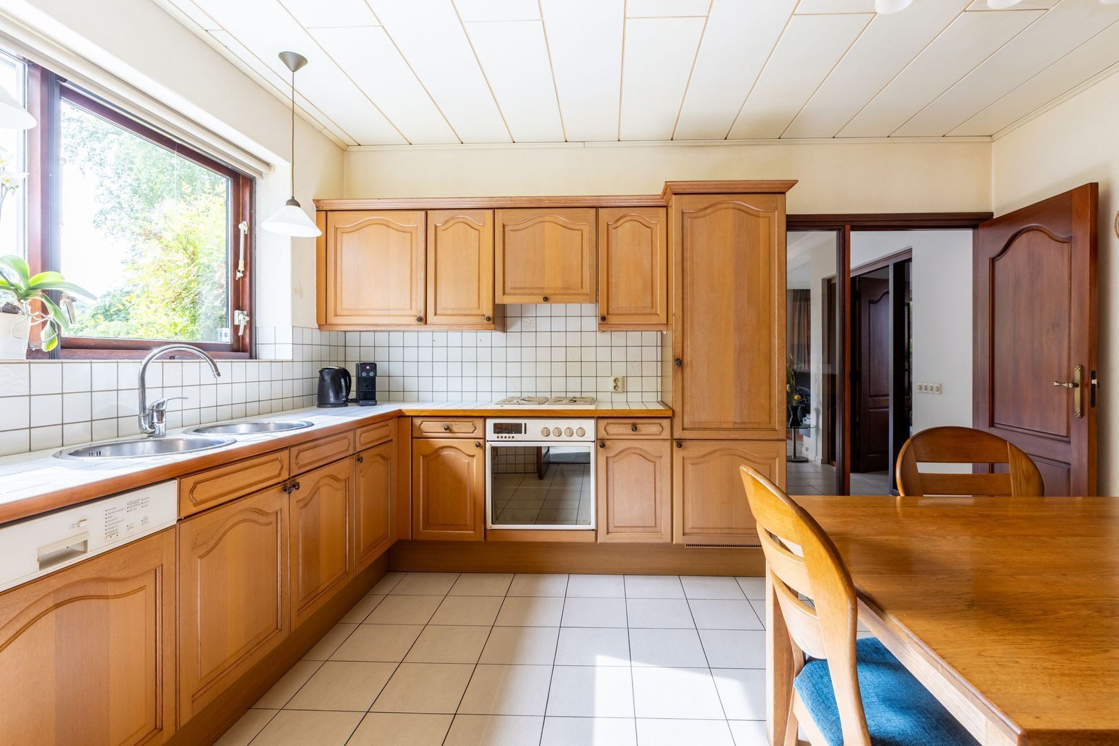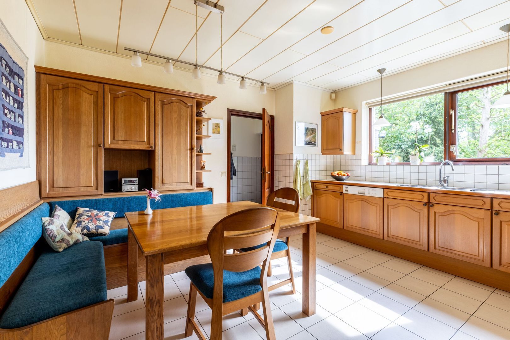 De keuken is voorzien van een L-vormige houten inrichting met diverse inbouwapparaten. Er is ruimte genoeg voor een eethoek met stoelen. Aansluitend bevindt zich de praktische bijkeuken met daarin de aansluiting voor de wasmachine, een kastenblok met gootsteen en de cv-ruimte. Ook de garage is binnendoor bereikbaar via de bijkeuken.