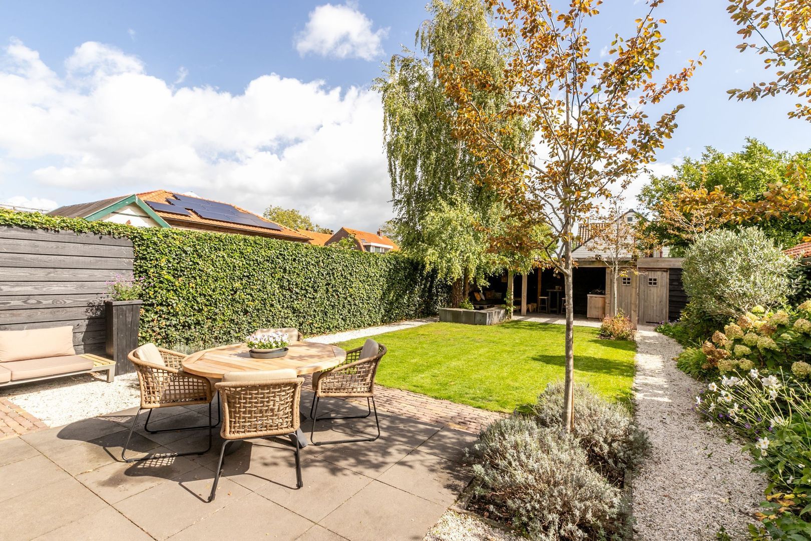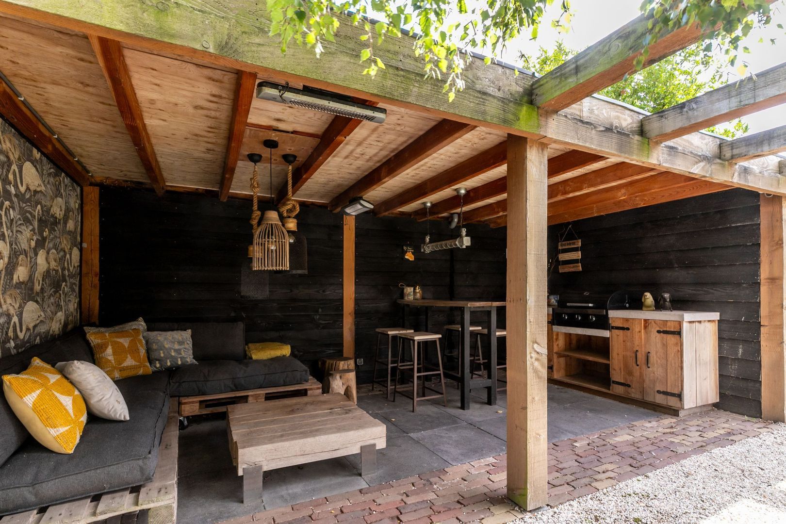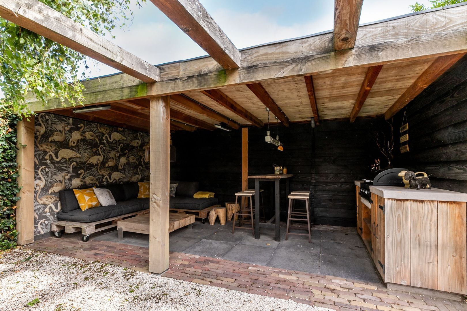 De tuin biedt veel ruimte en privacy en is goed aangelegd. Achterin staat een houten berging met aangebouwde overkapping, waarin het tot 's avonds laat goed toeven is.