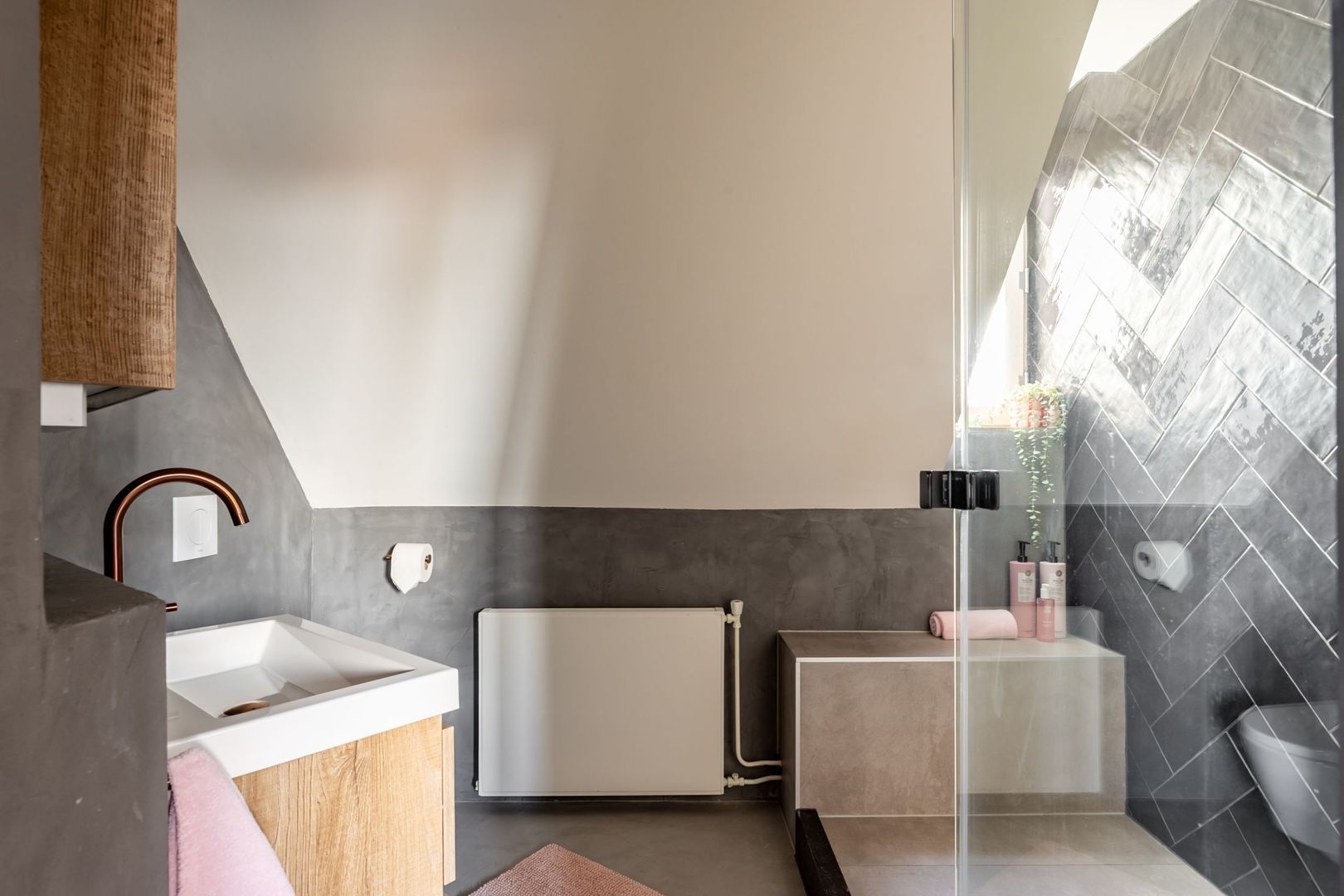 De badkamer is ingericht met een doucheruimte, een tweede toilet en een wastafelmeubel. Het openslaande raam maakt ventileren met frisse buitenlucht mogelijk.