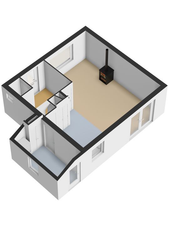 De indeling is als volgt: entree, ruime hal met toiletruimte en toegang tot de leefruimte. Deze bestaat uit een woonkamer met een gezellige houtkachel en een open keuken aan de tuinzijde. Deze is voorzien van een moderne L-vormige opstelling met inbouwapparatuur en een kokend-waterkraan. De openslaande deuren verbinden de woonkamer met het terras en de tuin. De vloer is afgewerkt met een laminaat vloer.