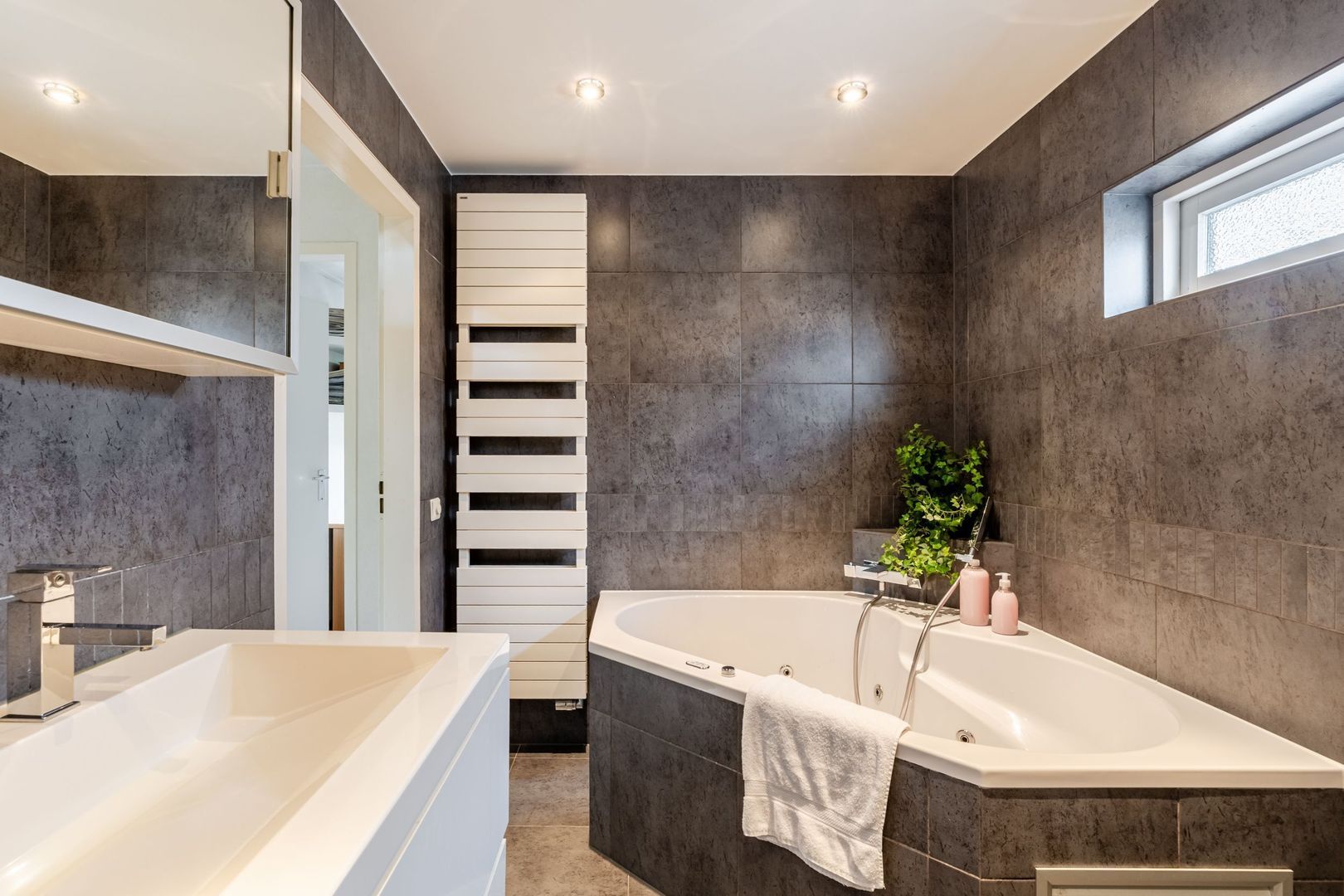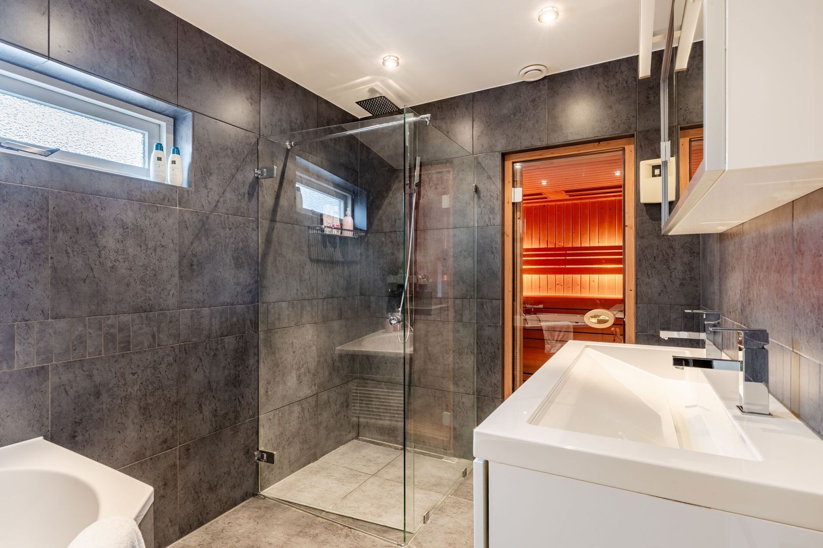 De luxe badkamer is ingericht met een hoekbad, een doucheruimte, een dubbel wastafelmeubel en een Finse sauna met infrarood functie. Op de overloop is een aparte toiletruimte.