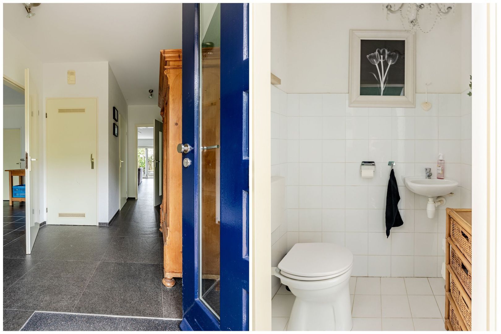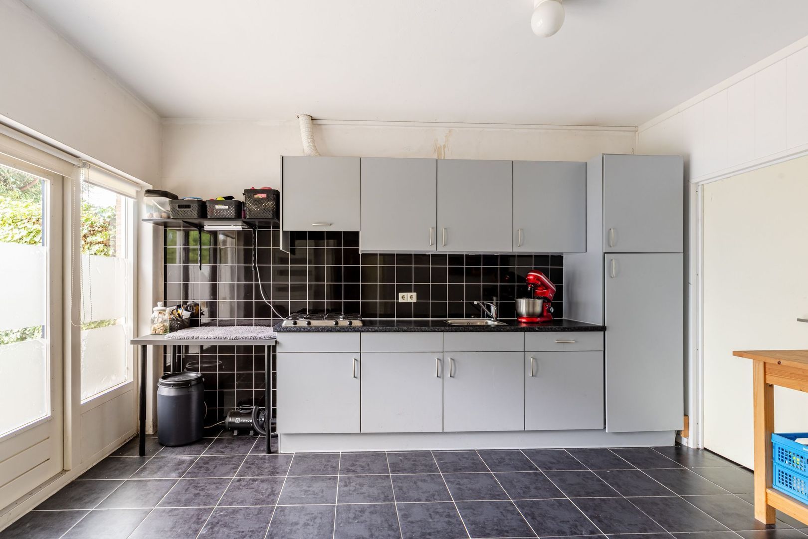 De hal geeft eveneens toegang tot een bijzonder ruime bijkeuken met keukenblok, een plavuizen vloer en een deur naar de oprit. Ook is er een inpandige berging met de opstelplaats voor de (nieuwe) cv-ketel en de wasmachine.