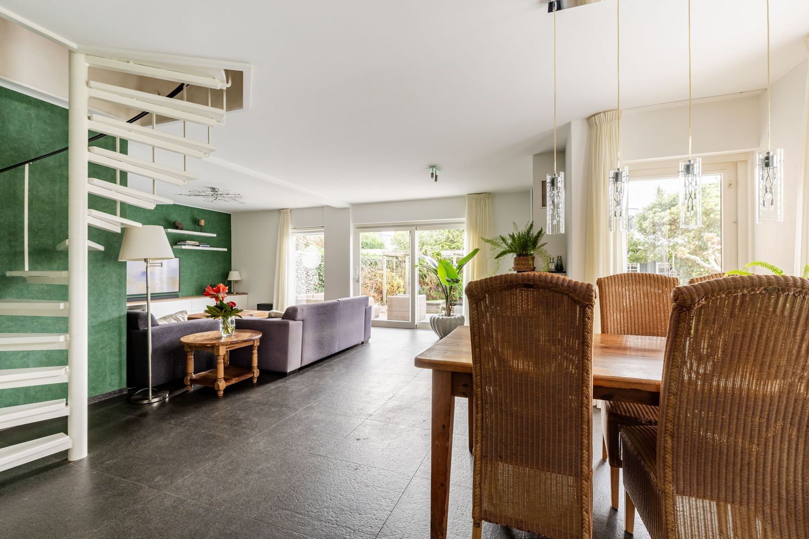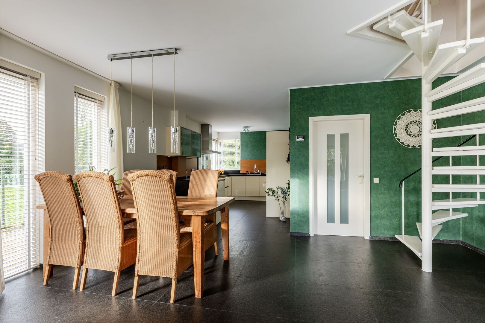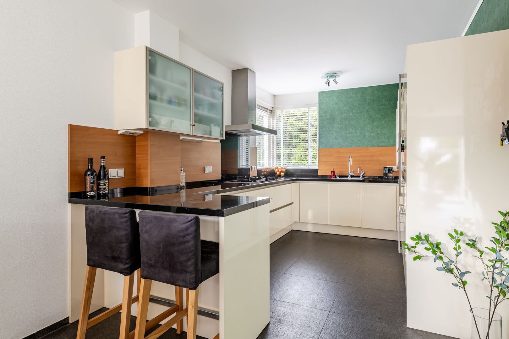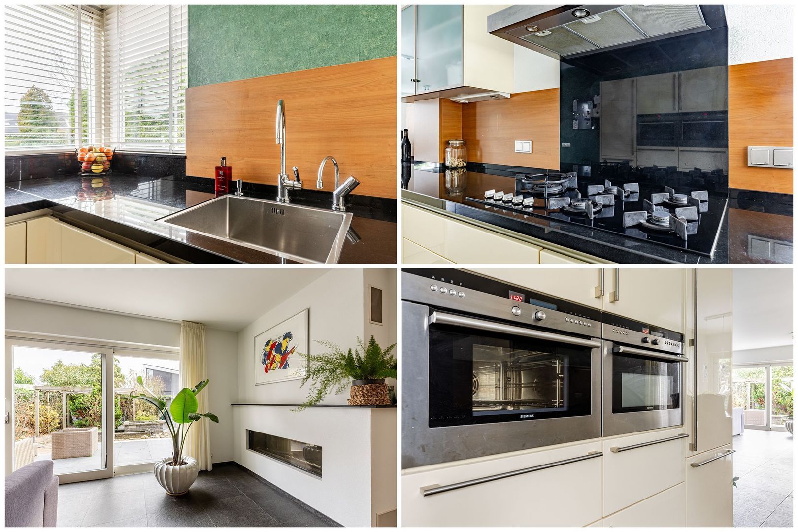 De open keuken bevindt zich aan de straatkant. Deze heeft een uitgebreide inrichting met veel kastruimte, inbouwapparatuur, een Quooker en een natuurstenen aanrechtblad.