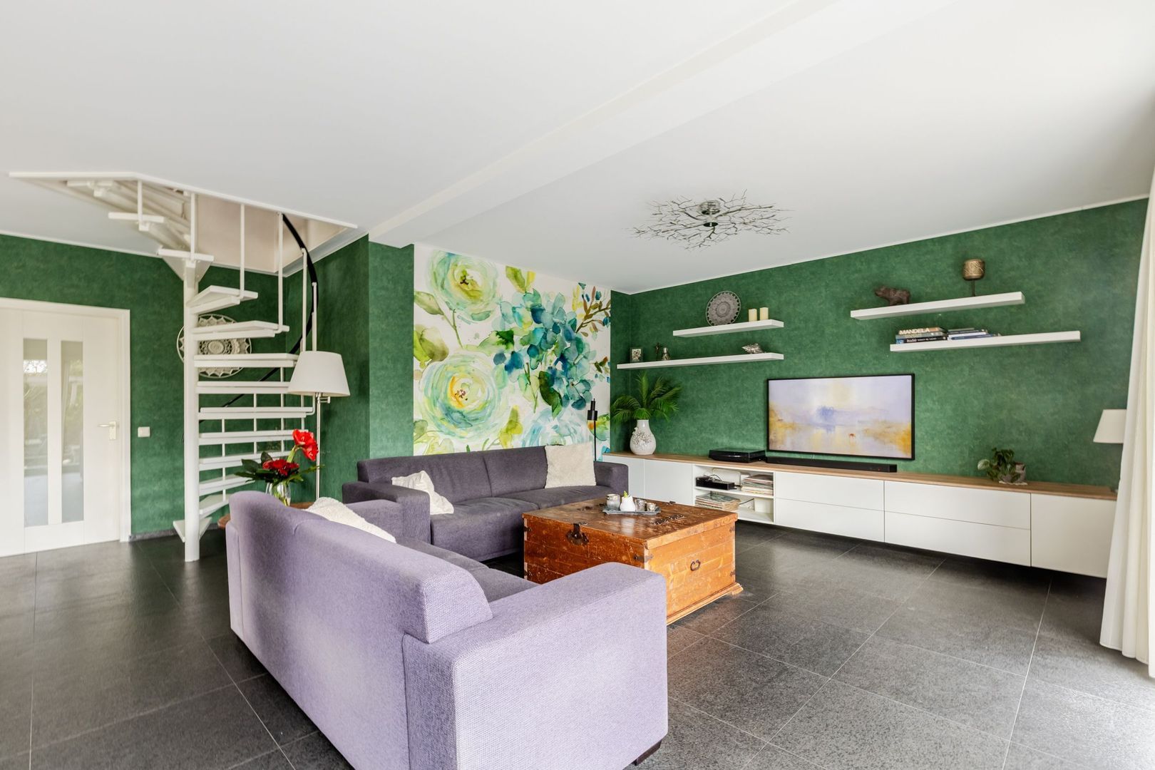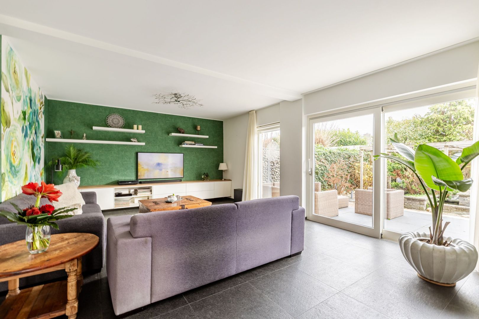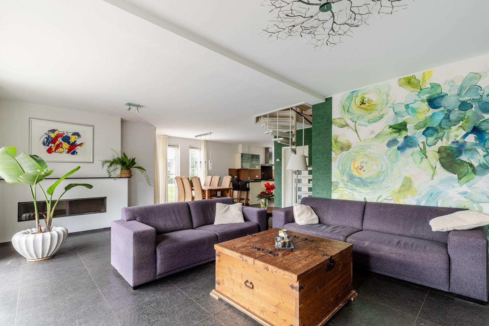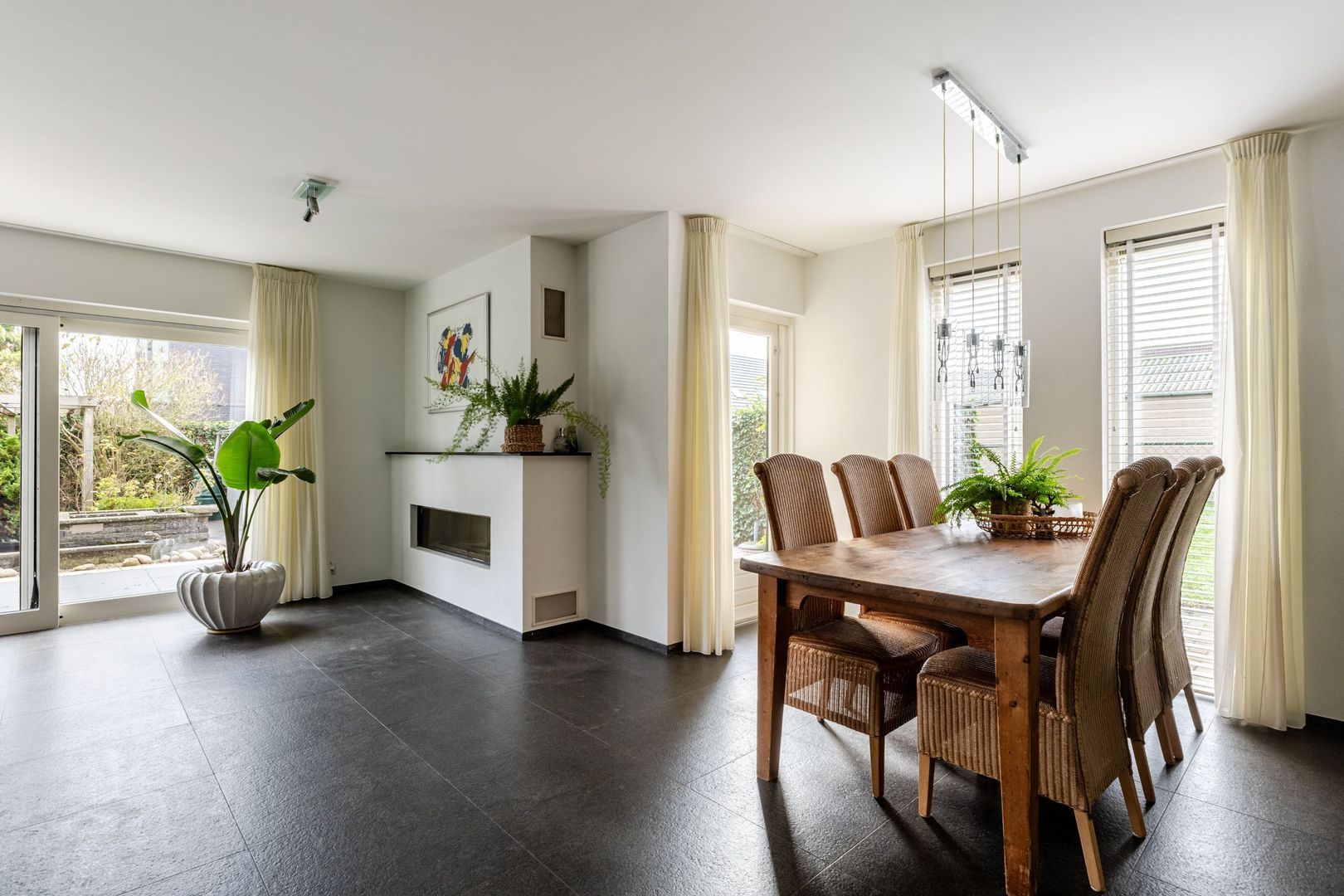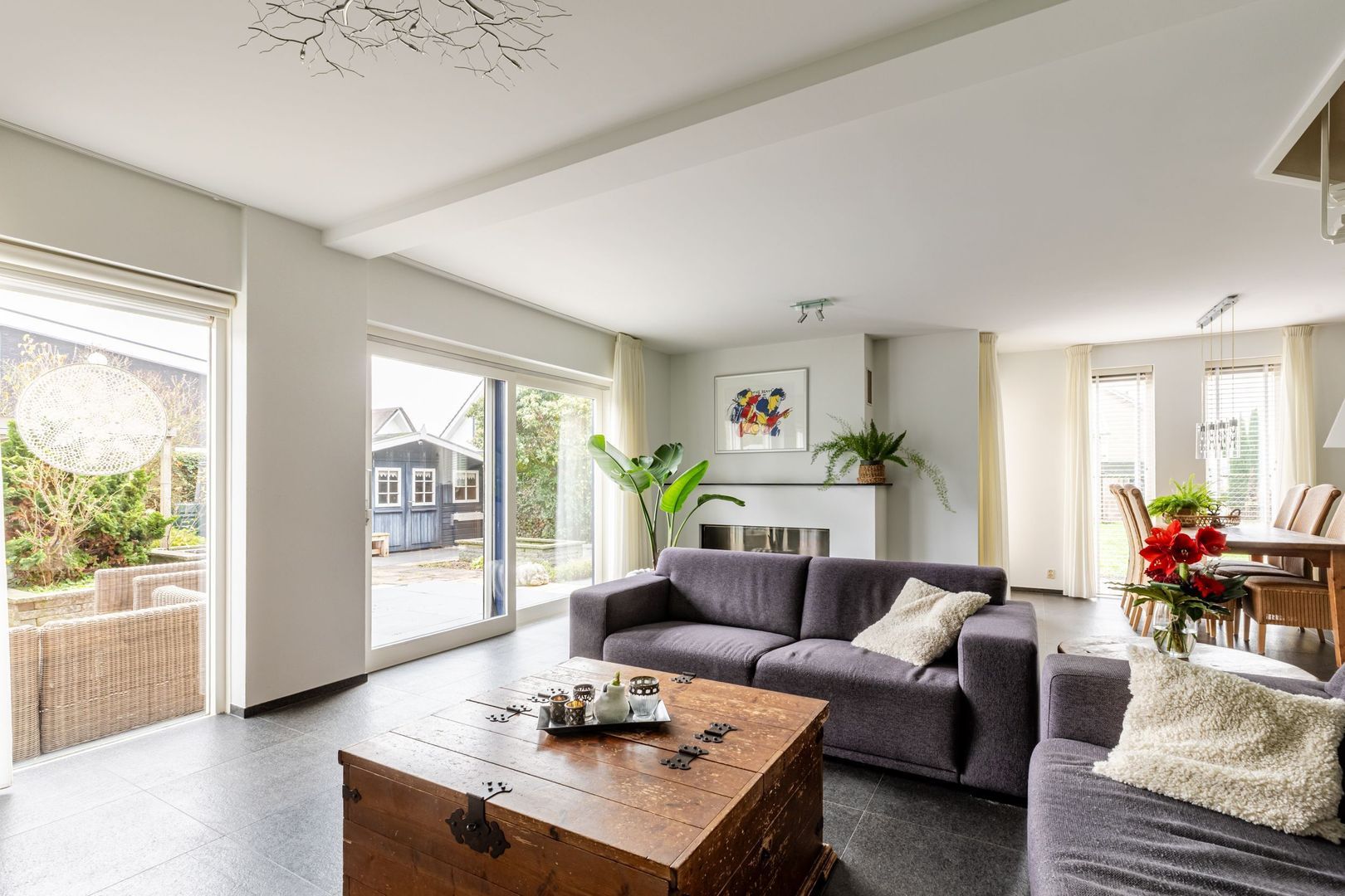 Mooie tuingerichte woonkamer met veel ramen en een moderne inbouw gashaard.