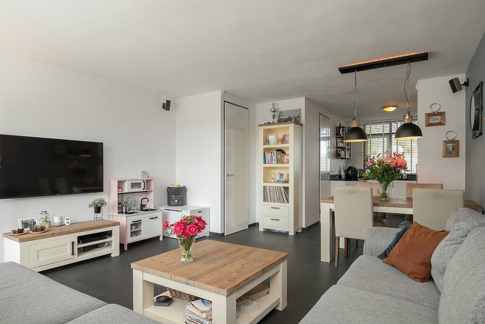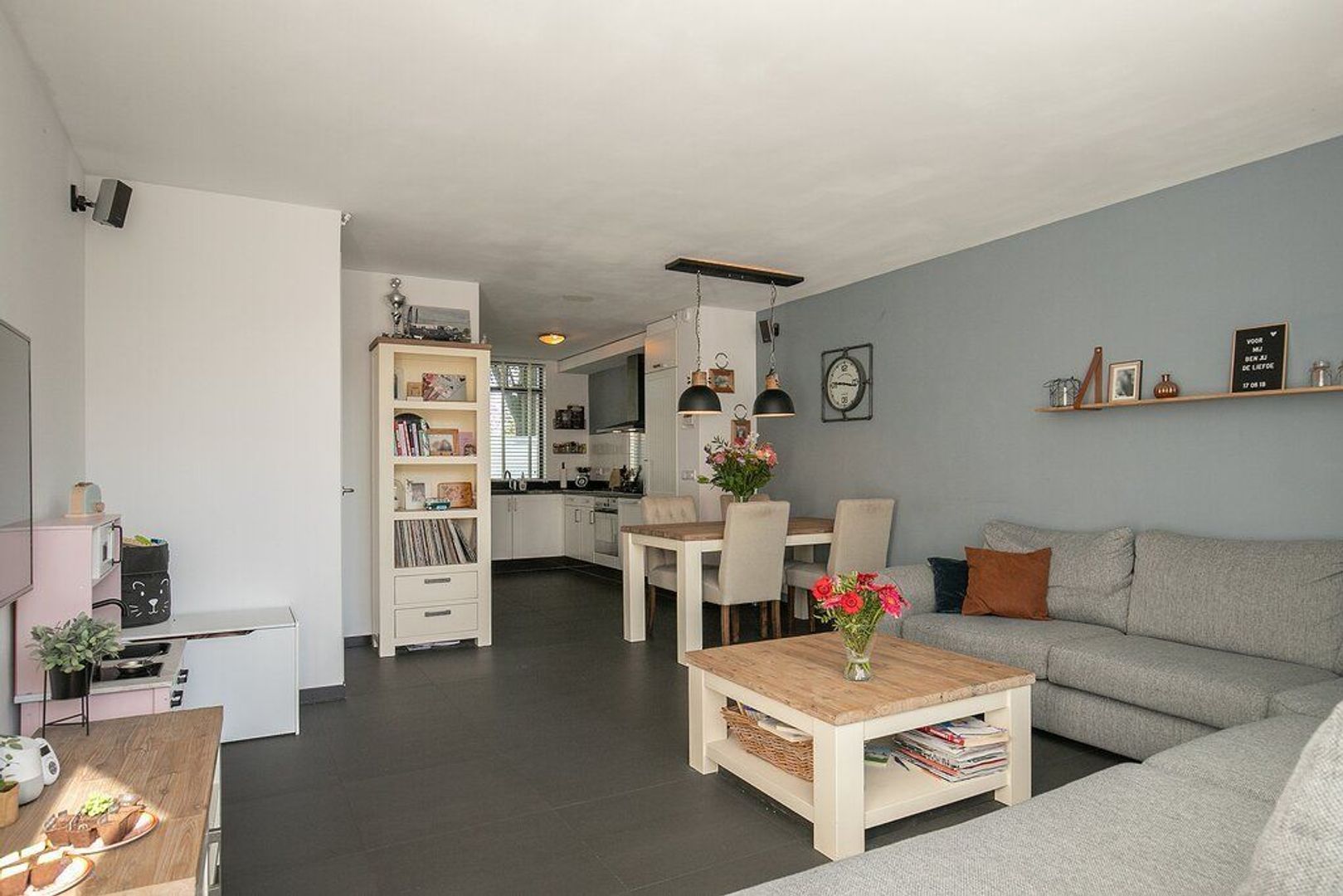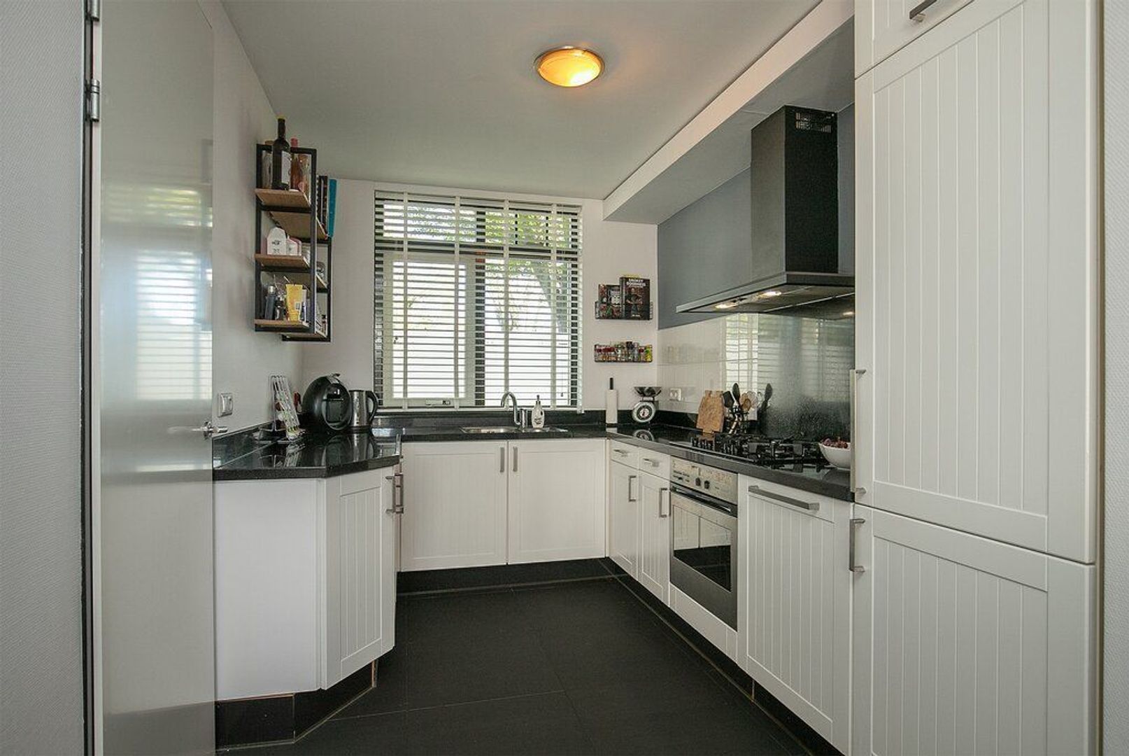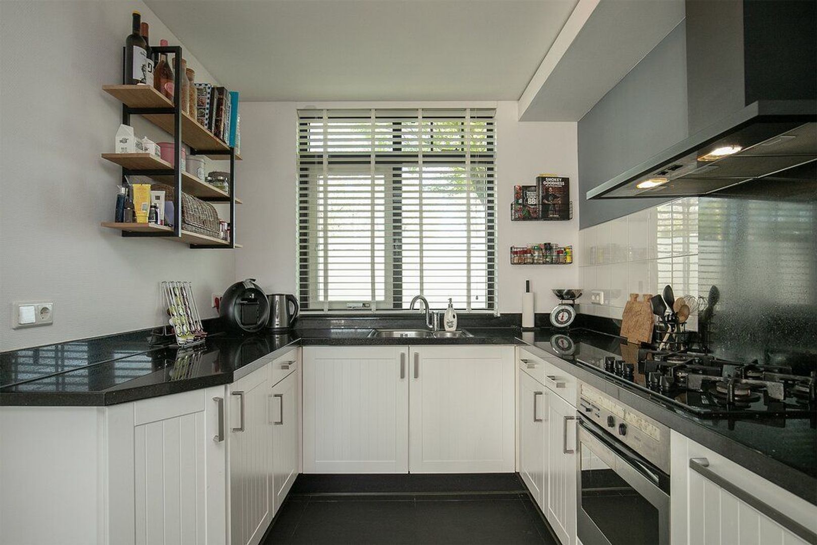 Tuingerichte woonkamer met trapkast. Open keuken aan de straatzijde met U-vormige inrichting, voorzien van een natuurstenen aanrechtblad, vijfpits gaskookplaat, afzuigkap, koel-vriescombinatie, oven en vaatwasser.