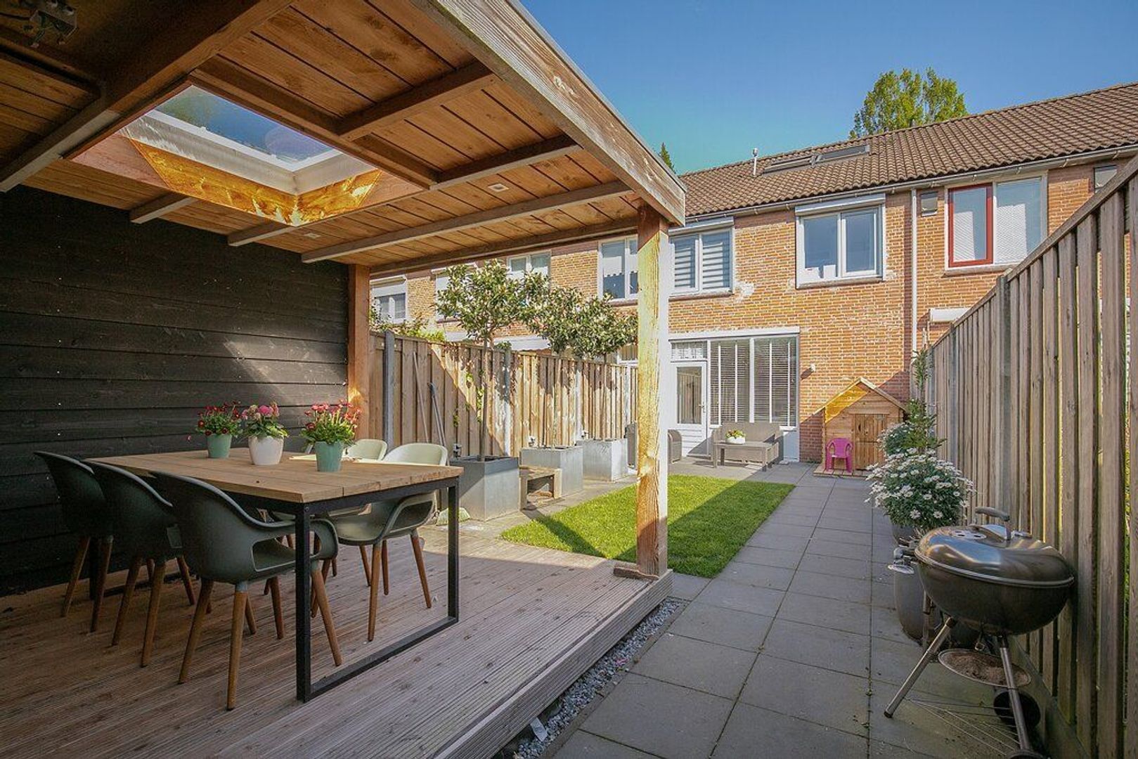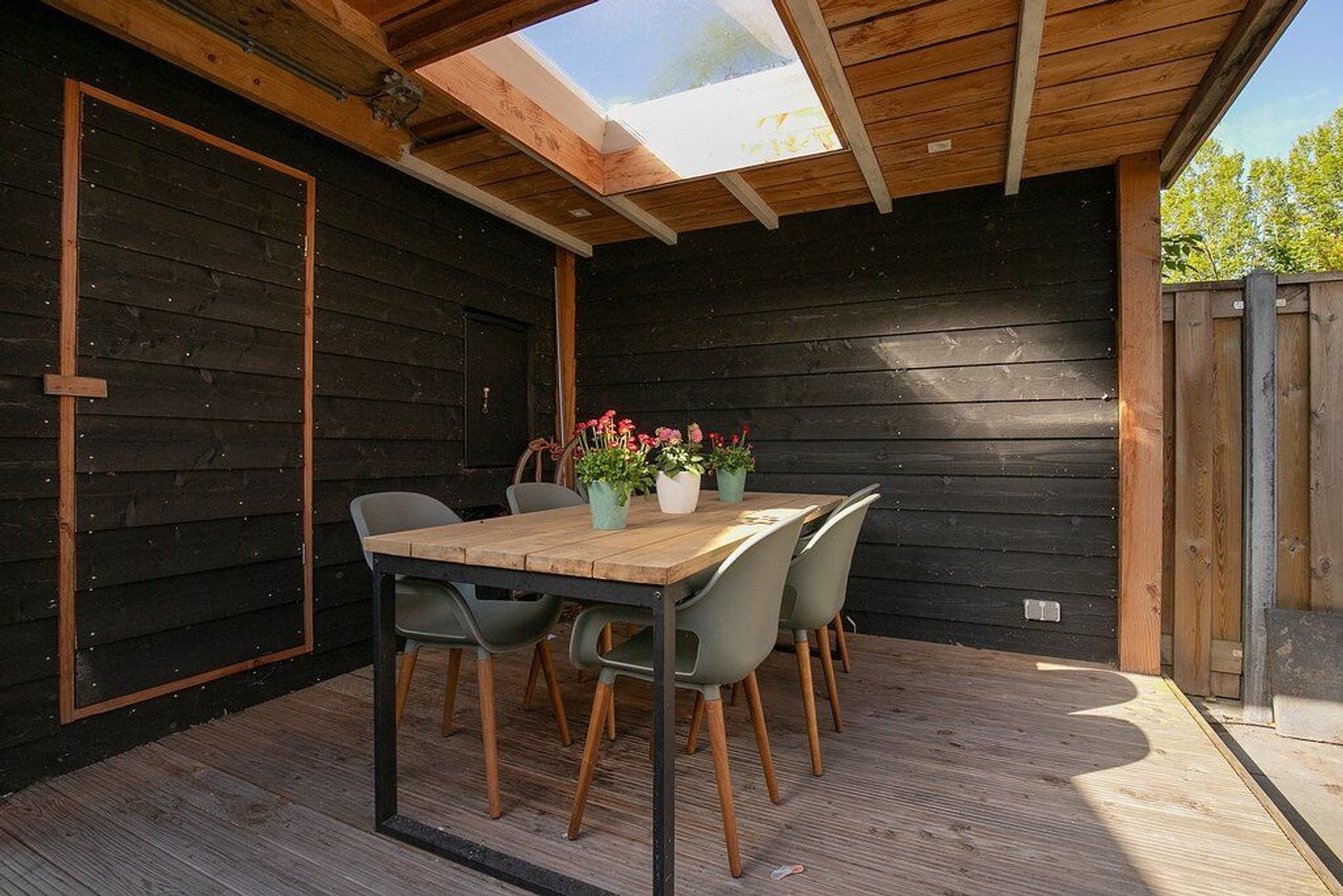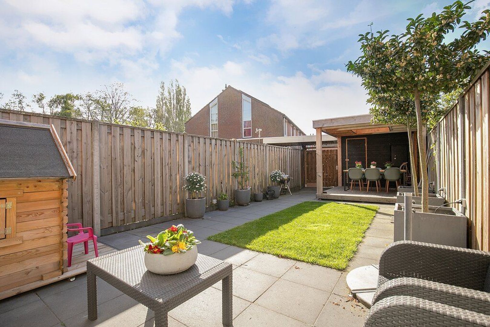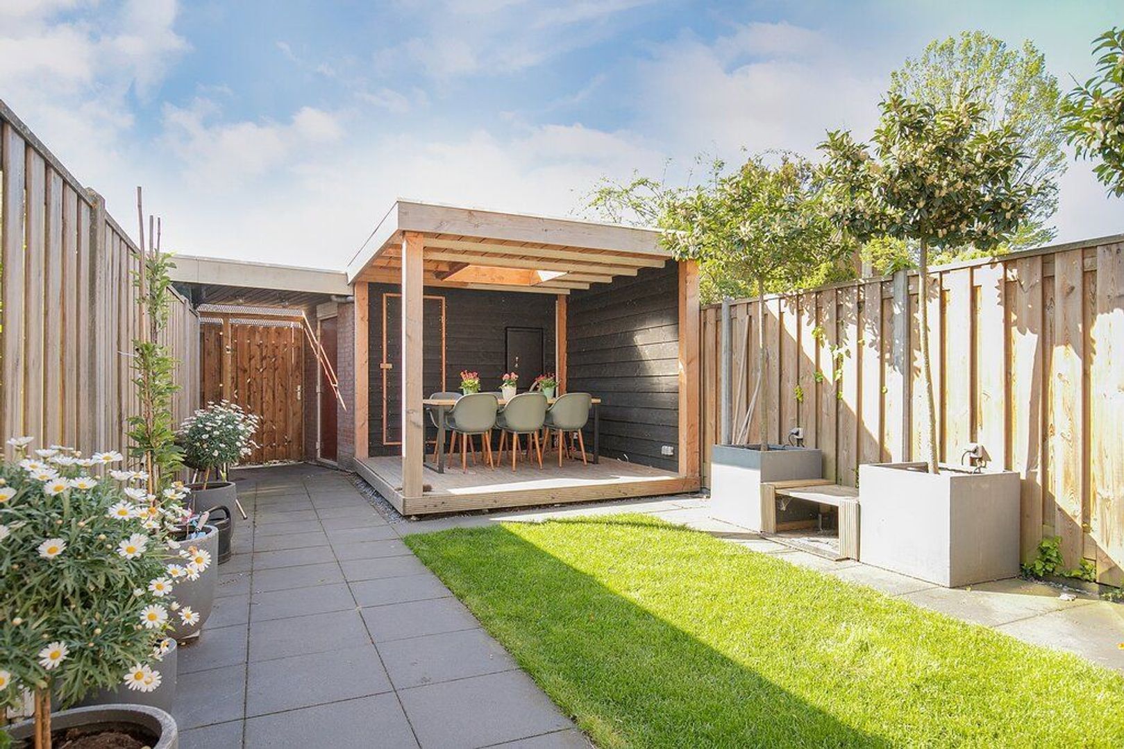 De achtertuin ligt op het zuiden. Achterin staat een stenen berging met daarvoor een stoere overkapping.