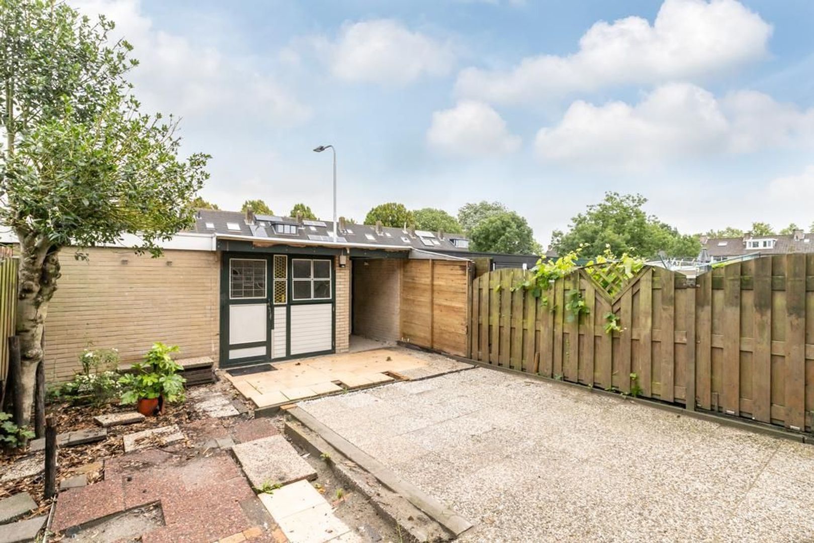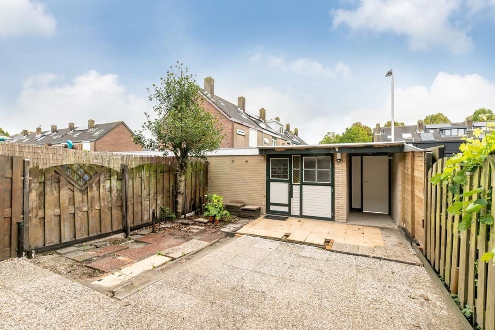 De achtertuin ligt op het oosten. Hierin staat een stenen berging.