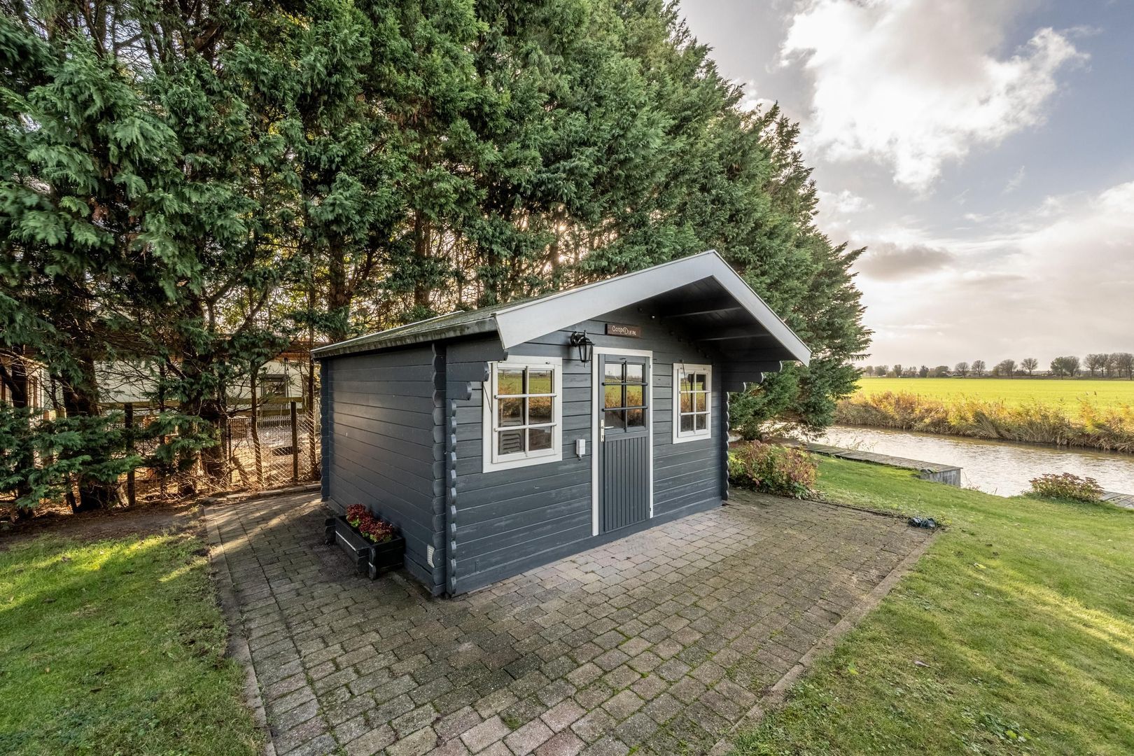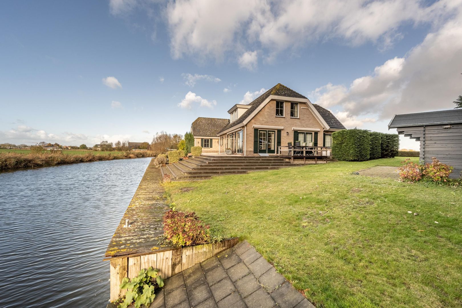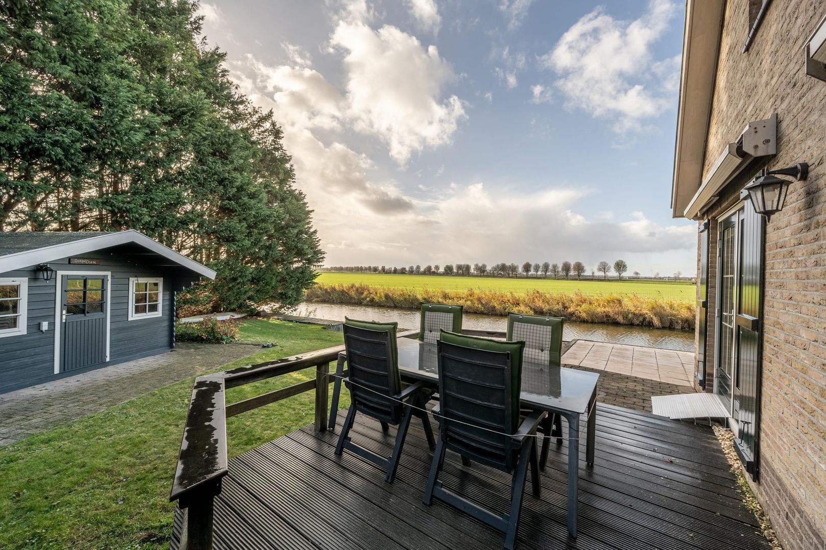 Onderdijks op het gazon staat tevens een houten chaletberging met een terras rondom én een inlaatplaats voor bijvoorbeeld en bootje of kano.