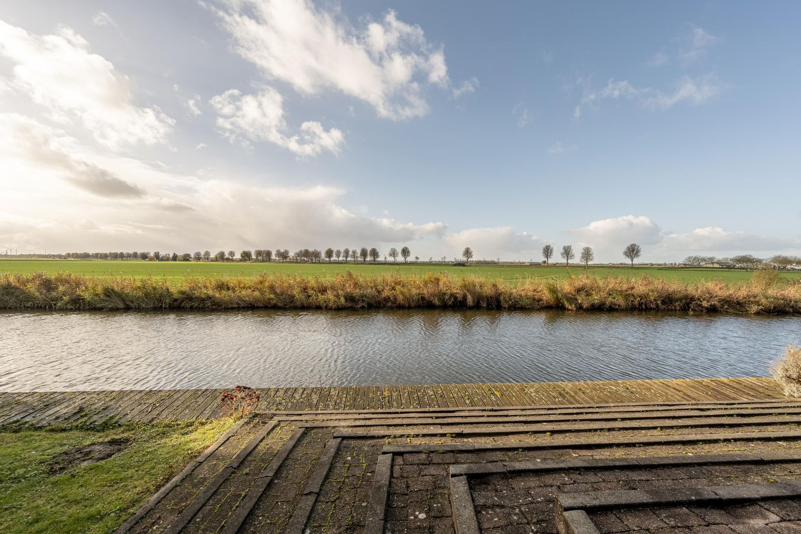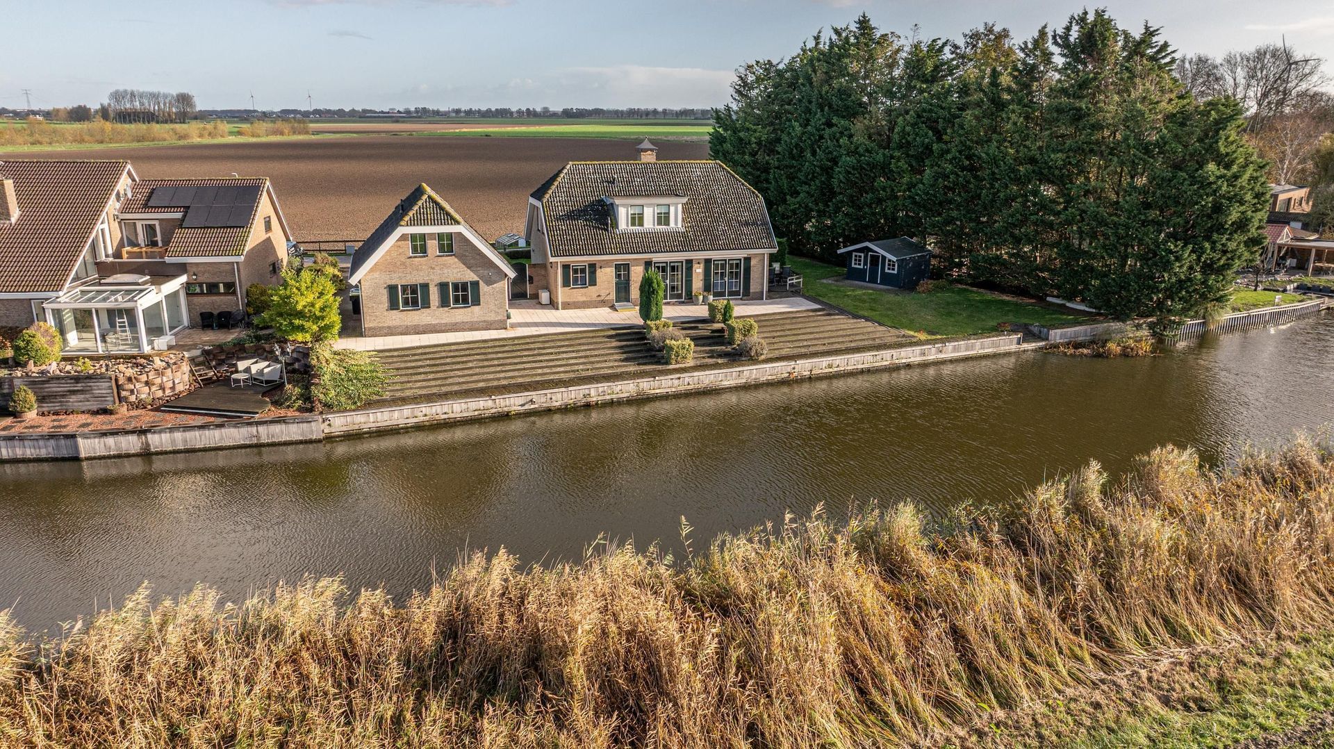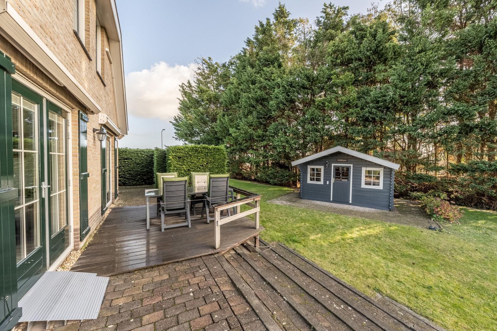 Onderdijks op het gazon staat tevens een houten chaletberging met een terras rondom én een inlaatplaats voor bijvoorbeeld en bootje of kano.