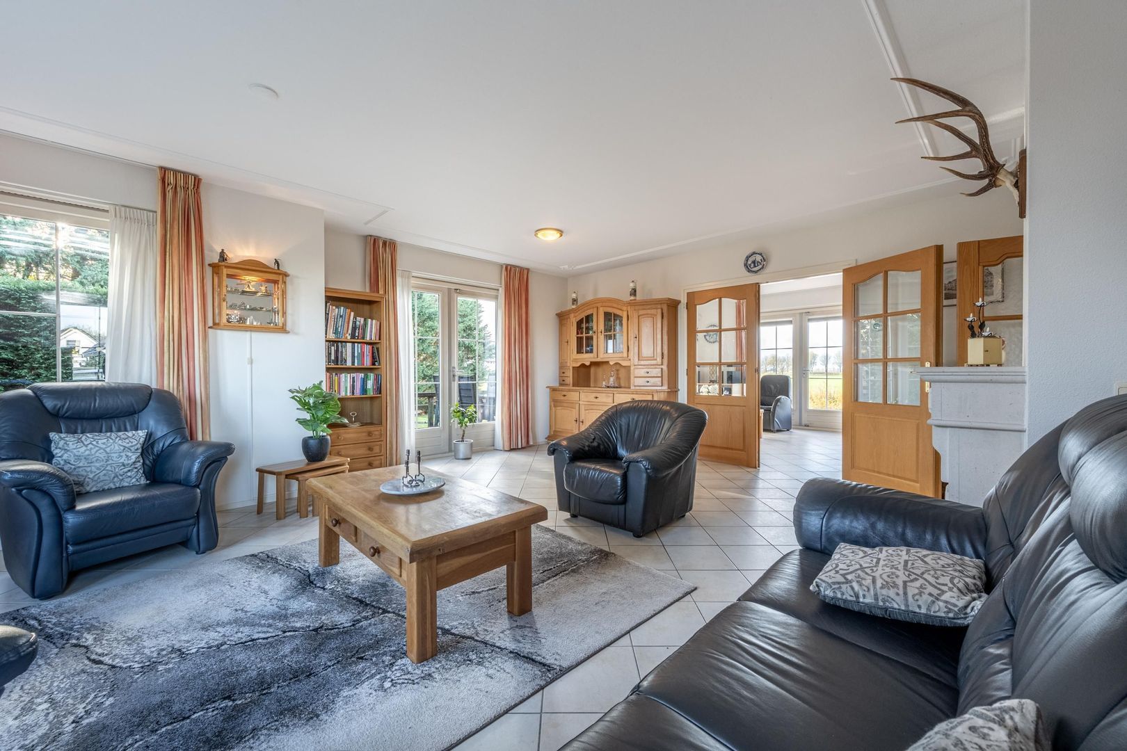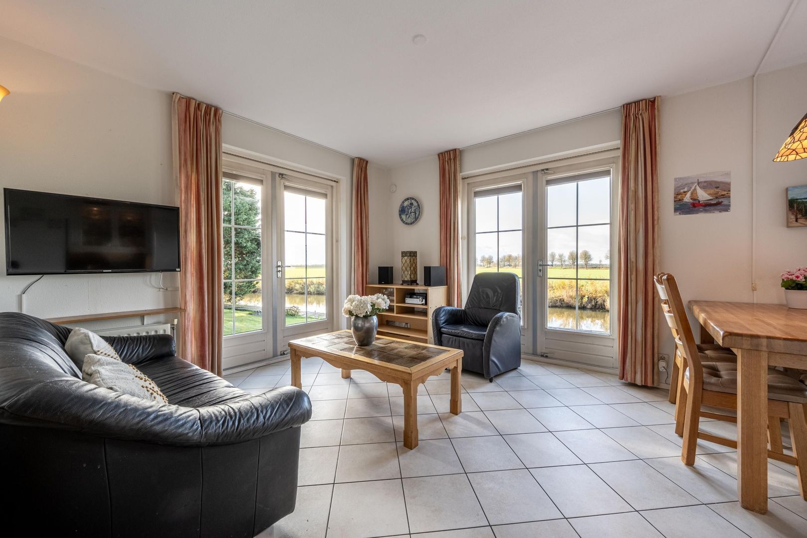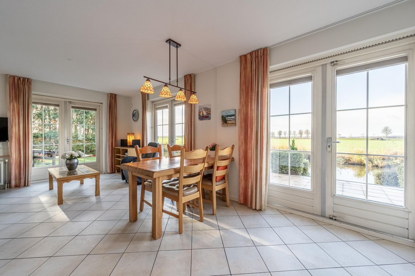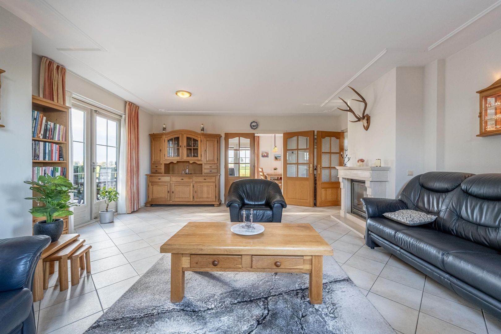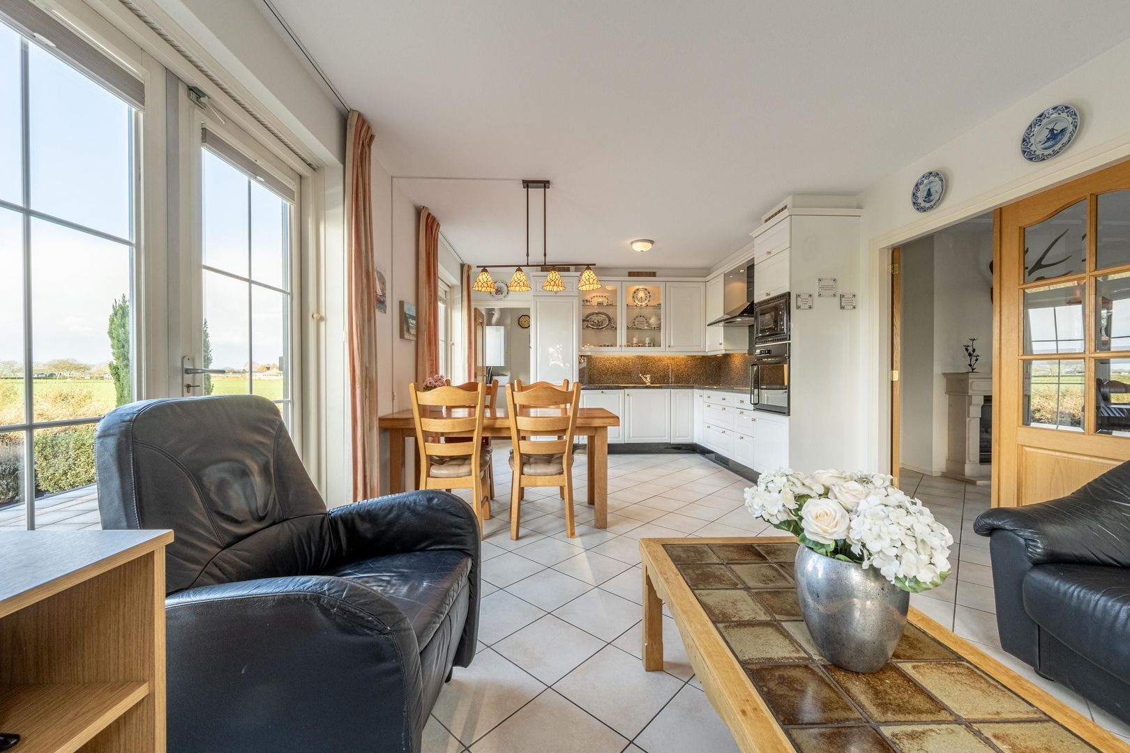De gezellige woonkamer met schouw en gashaard biedt een geweldig uitzicht over het zo kenmerkende Hoeksche Waardse landschap. Een viertal openslaande deuren verbindt buiten met binnen.