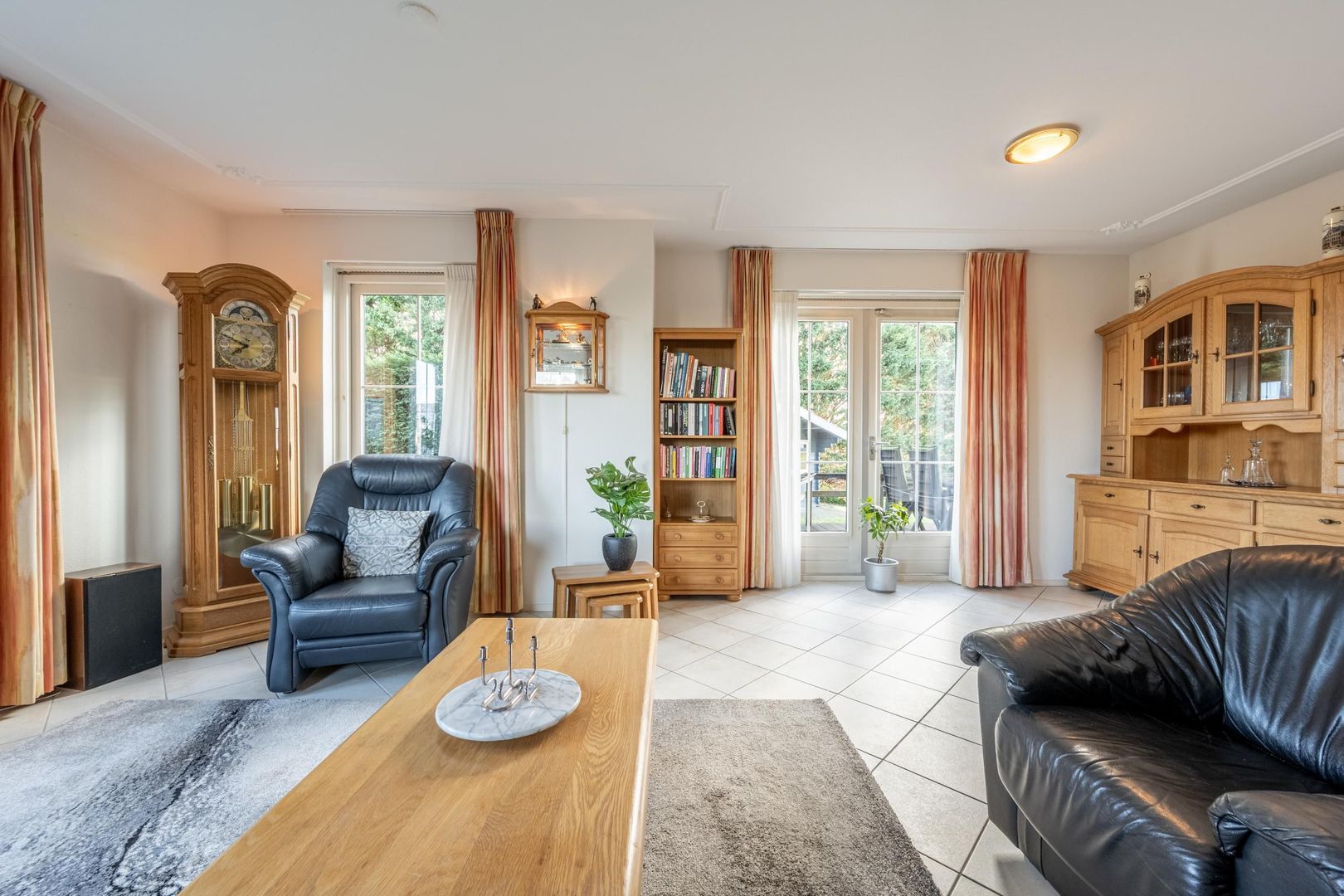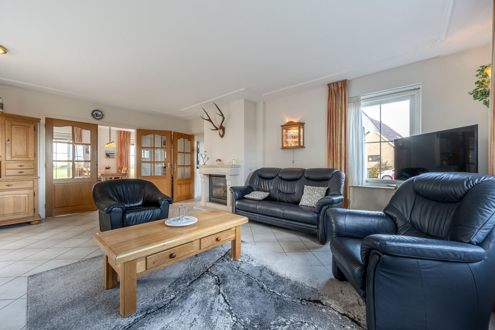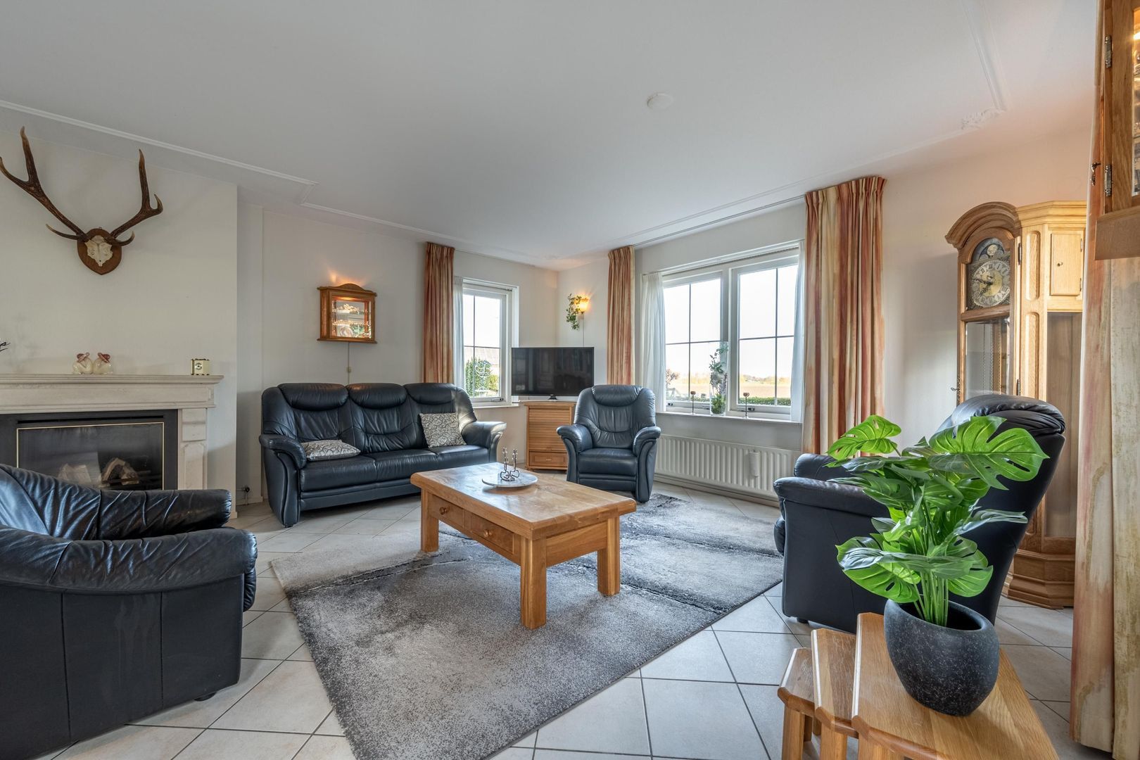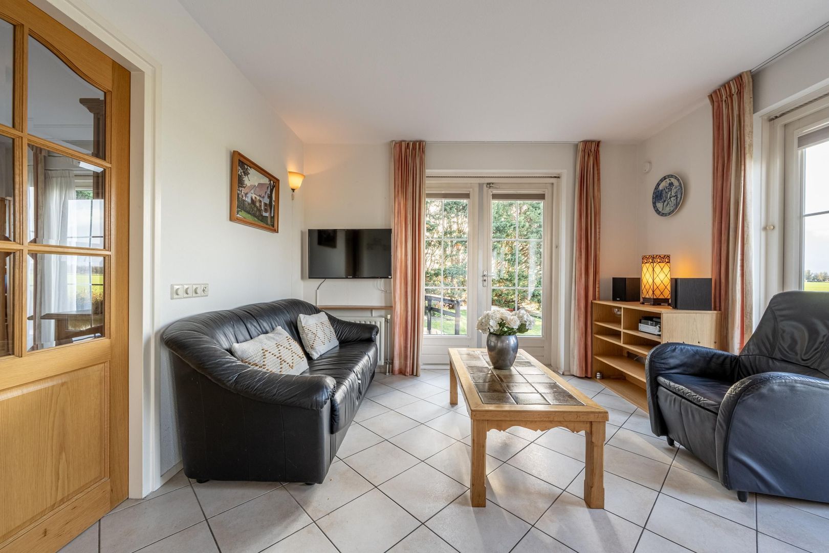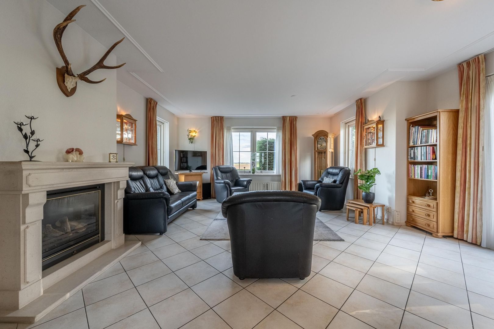 De gezellige woonkamer met schouw en gashaard biedt een geweldig uitzicht over het zo kenmerkende Hoeksche Waardse landschap. Een viertal openslaande deuren verbindt buiten met binnen.