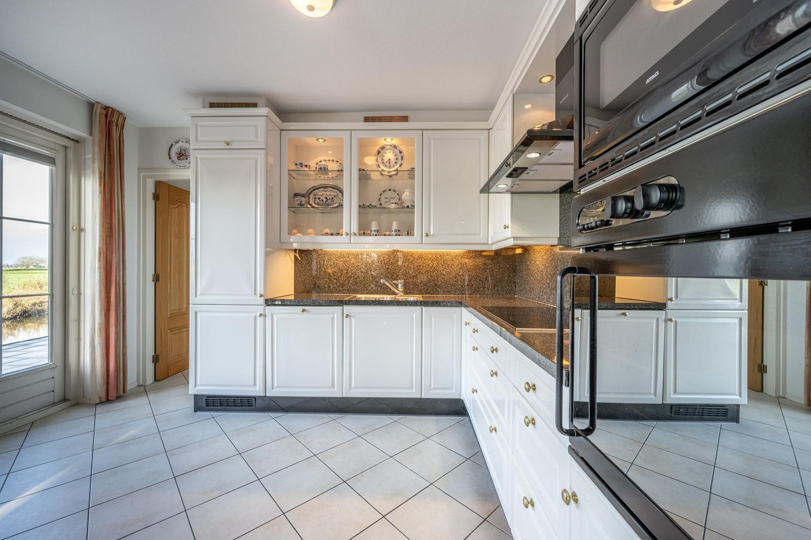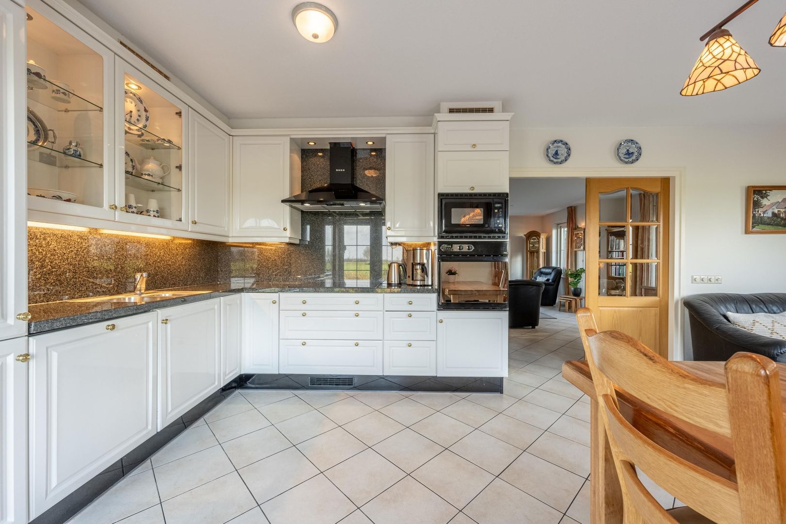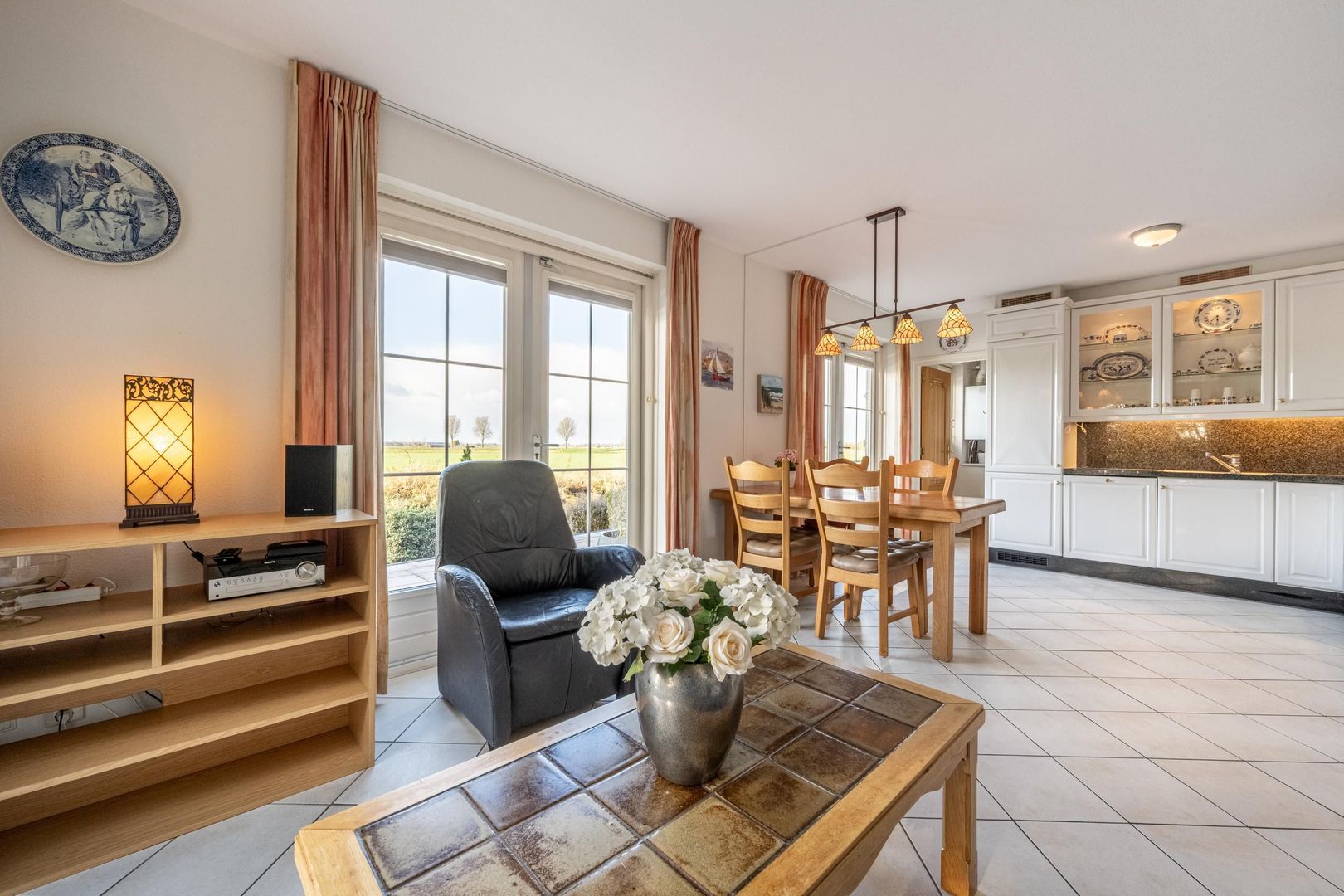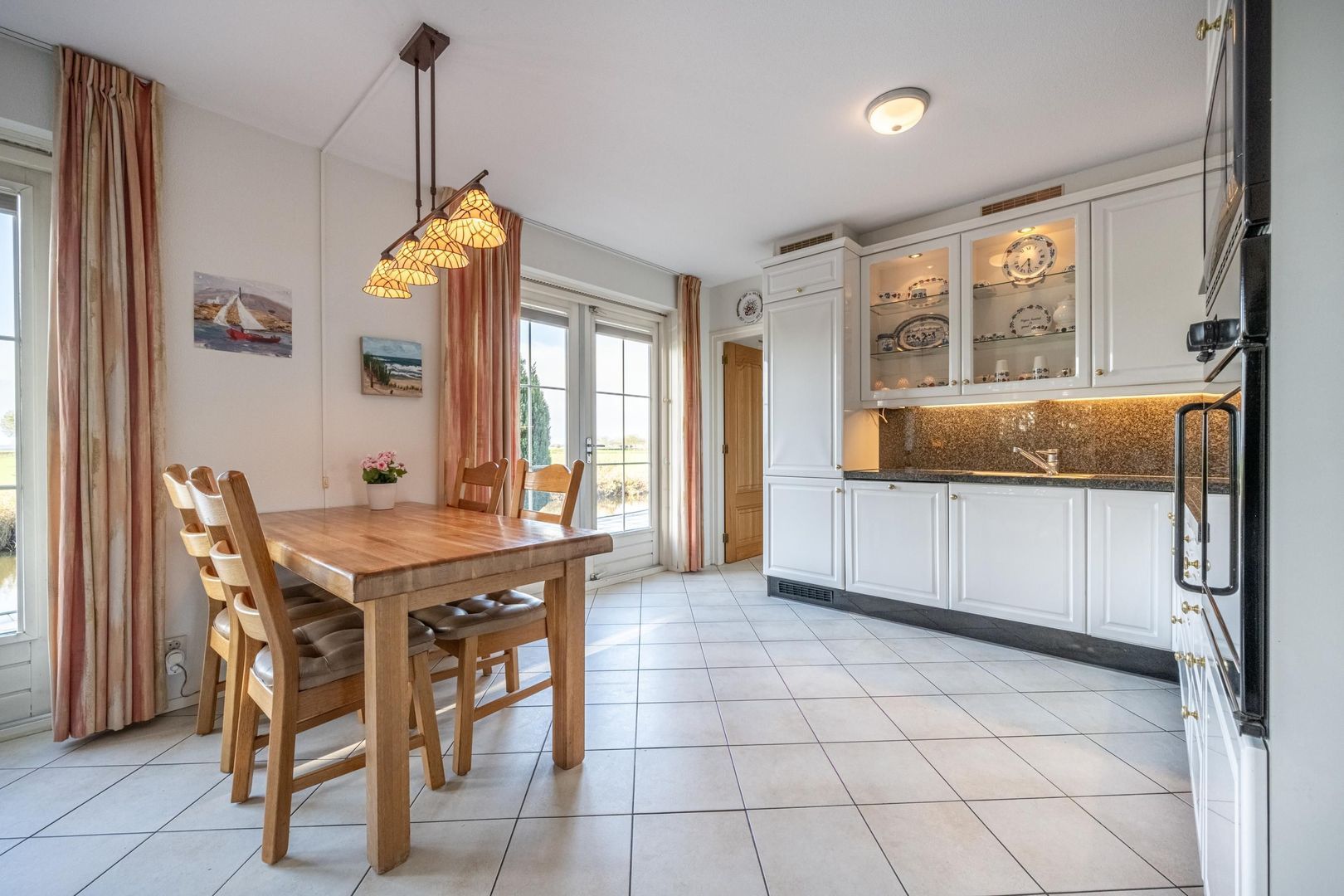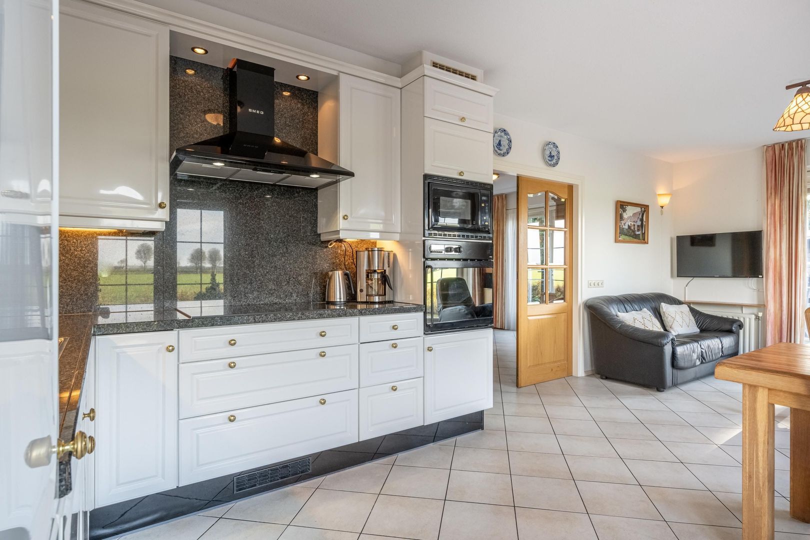 De keuken is van de kamer afgesloten door middel van twee deuren met glas, die natuurlijk ook open gezet kunnen worden om zodoende een half open keuken te creëren.