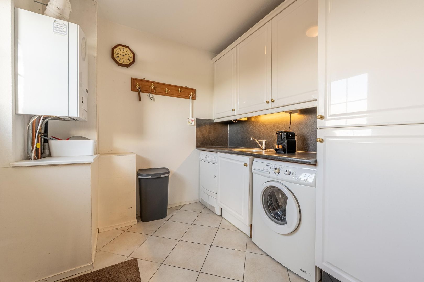 Een praktische bijkeuken met de aansluiting voor de wasapparatuur bevindt zich naast de keuken.