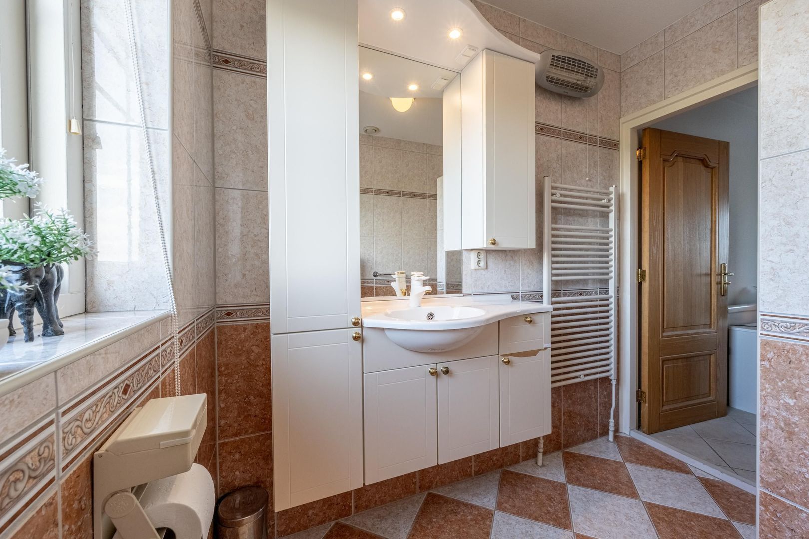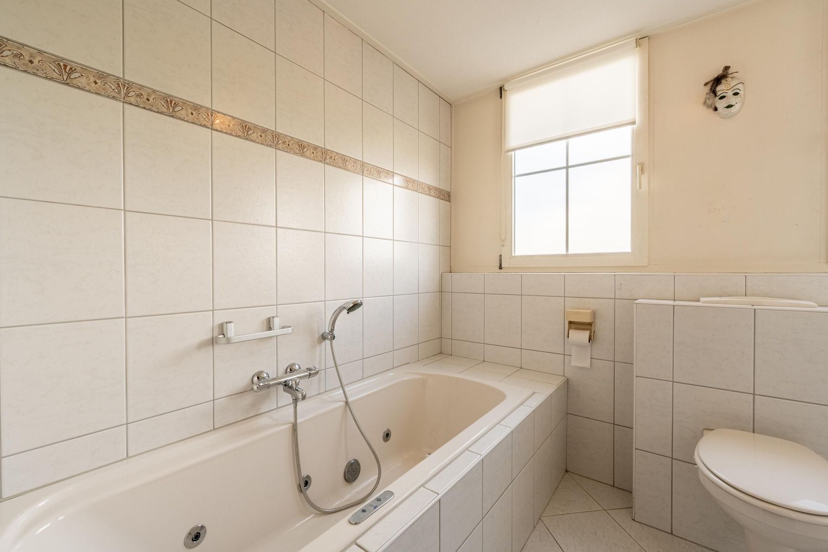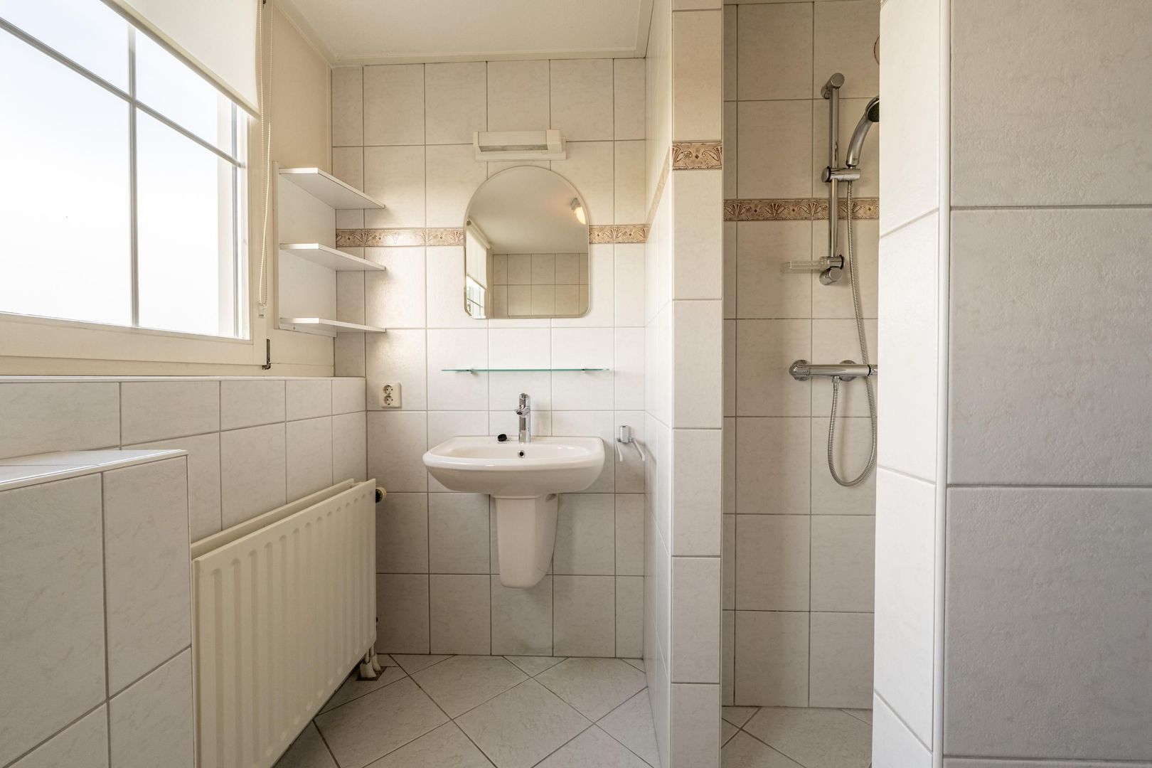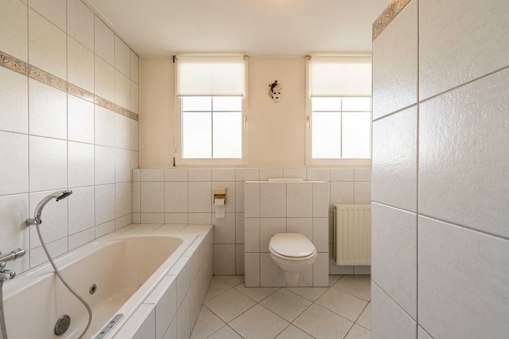 De complete tweede badkamer is ingericht met een ligbad een wandtoilet, een inloopdouche en een wastafel. Het openslaande raam maakt ventileren met frisse buitenlucht mogelijk.