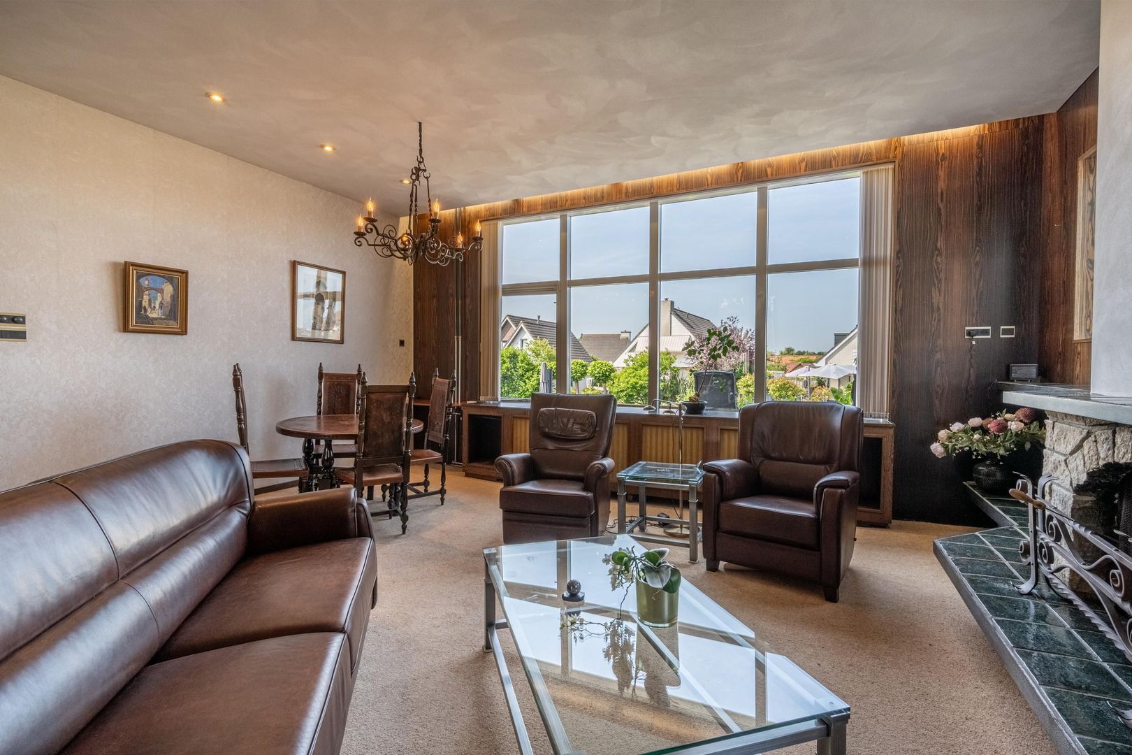 De woonkamer bevindt zich aan de rechterkant van de woning. Deze bestaat uit twee delen die middels twee traptreden met elkaar verbonden zijn. Aan de voorkant geeft het kenmerkende gebogen raam met glas in lood bovenlichten een fraai uitzicht op de straat. Aan de achterkant biedt de grote raampartij uitzicht op het water.