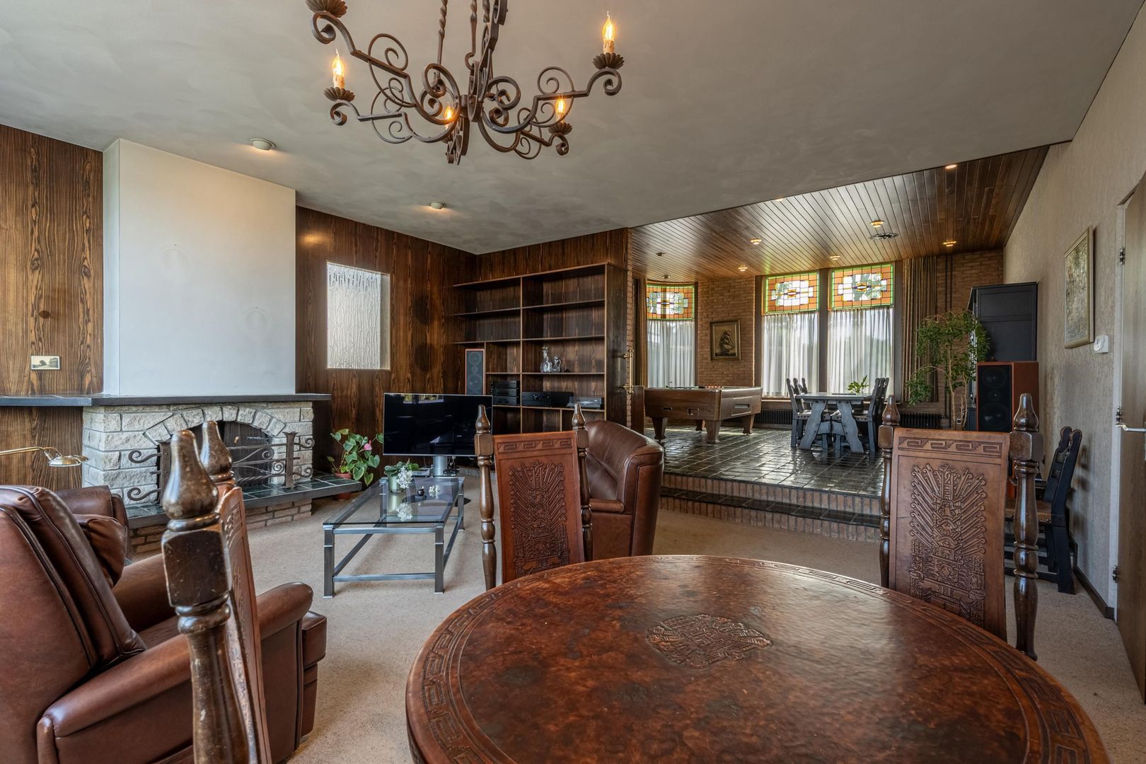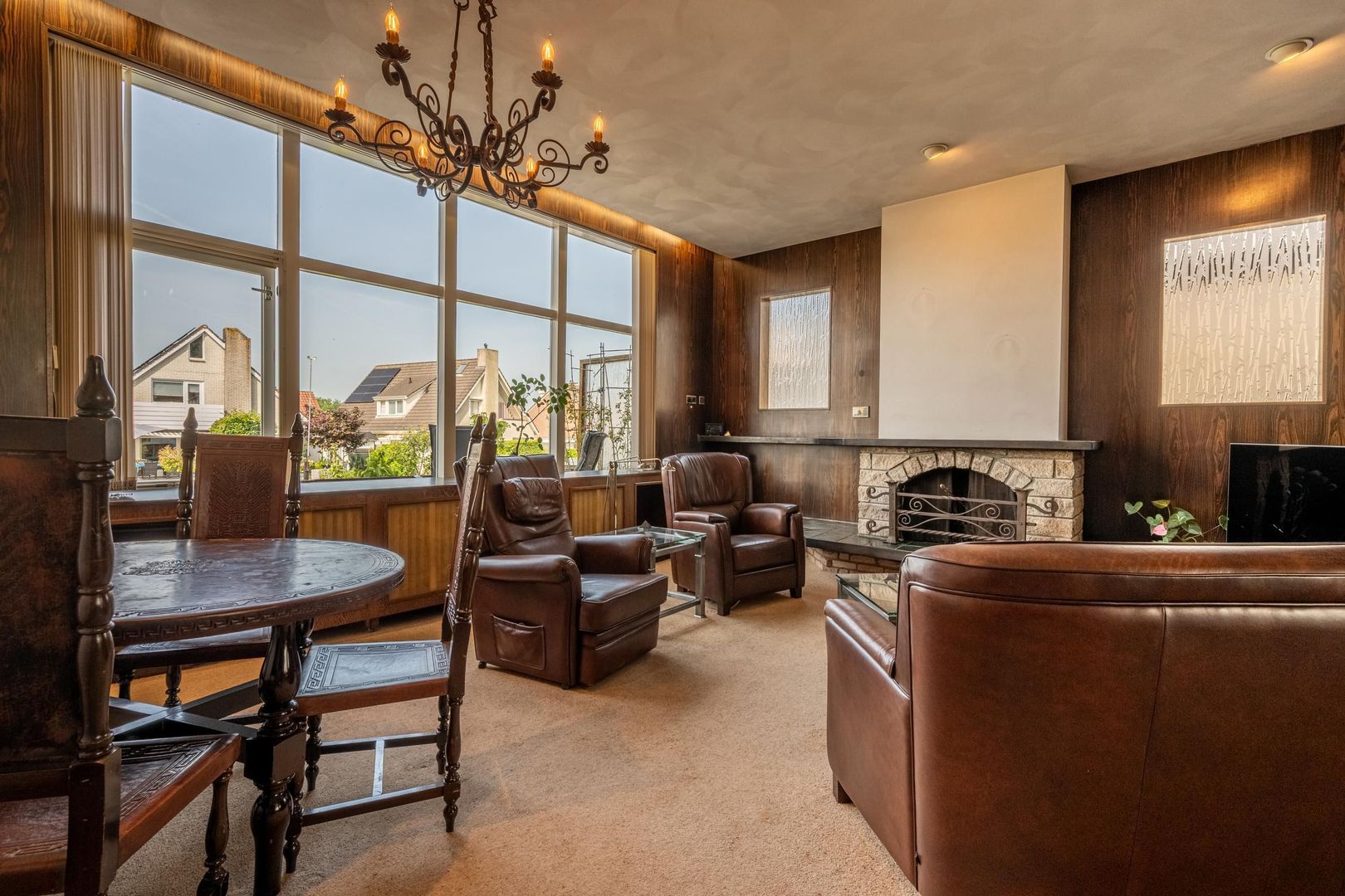 De woonkamer bevindt zich aan de rechterkant van de woning. Deze bestaat uit twee delen die middels twee traptreden met elkaar verbonden zijn. Aan de voorkant geeft het kenmerkende gebogen raam met glas in lood bovenlichten een fraai uitzicht op de straat. Aan de achterkant biedt de grote raampartij uitzicht op het water.