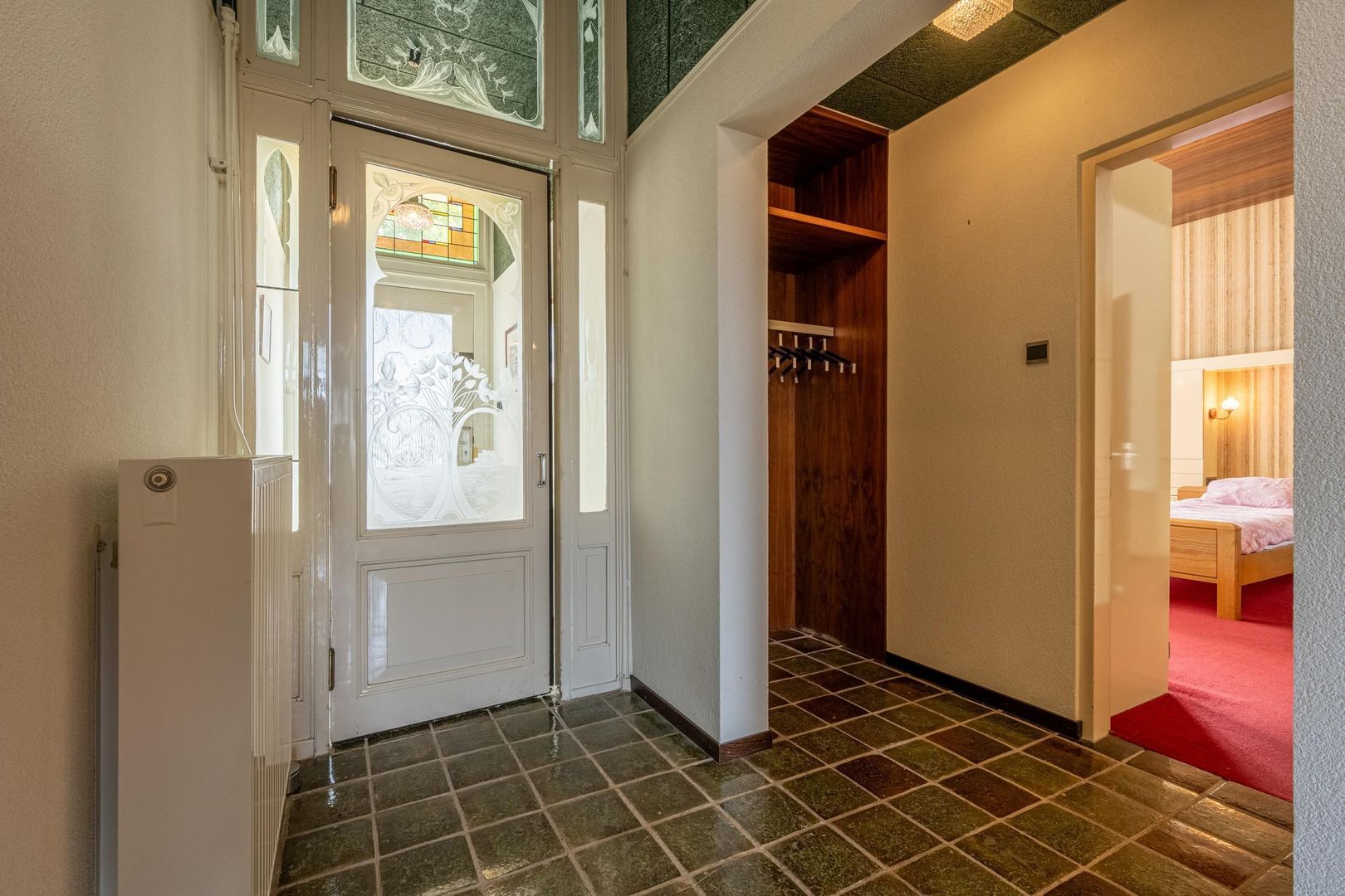 entree/vestibule en gang met garderobe, toiletruimte, kelder en toegang tot het balkon.