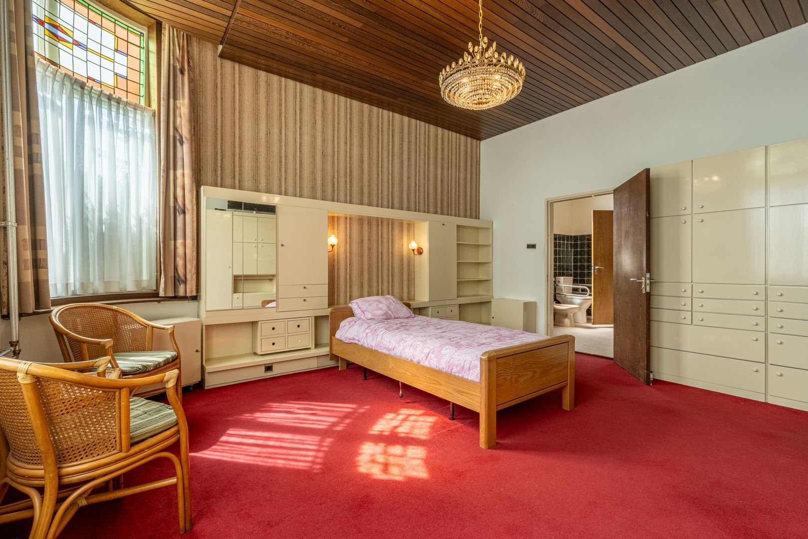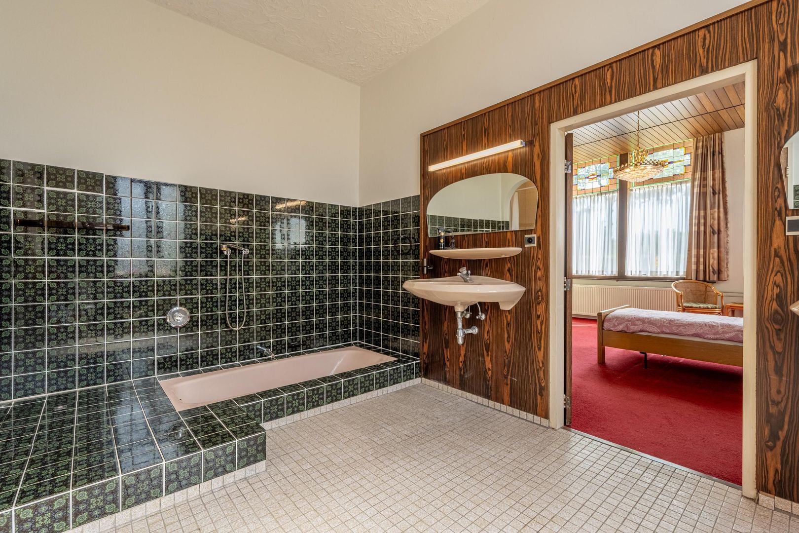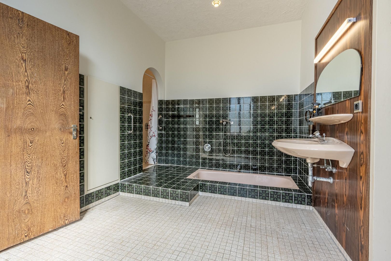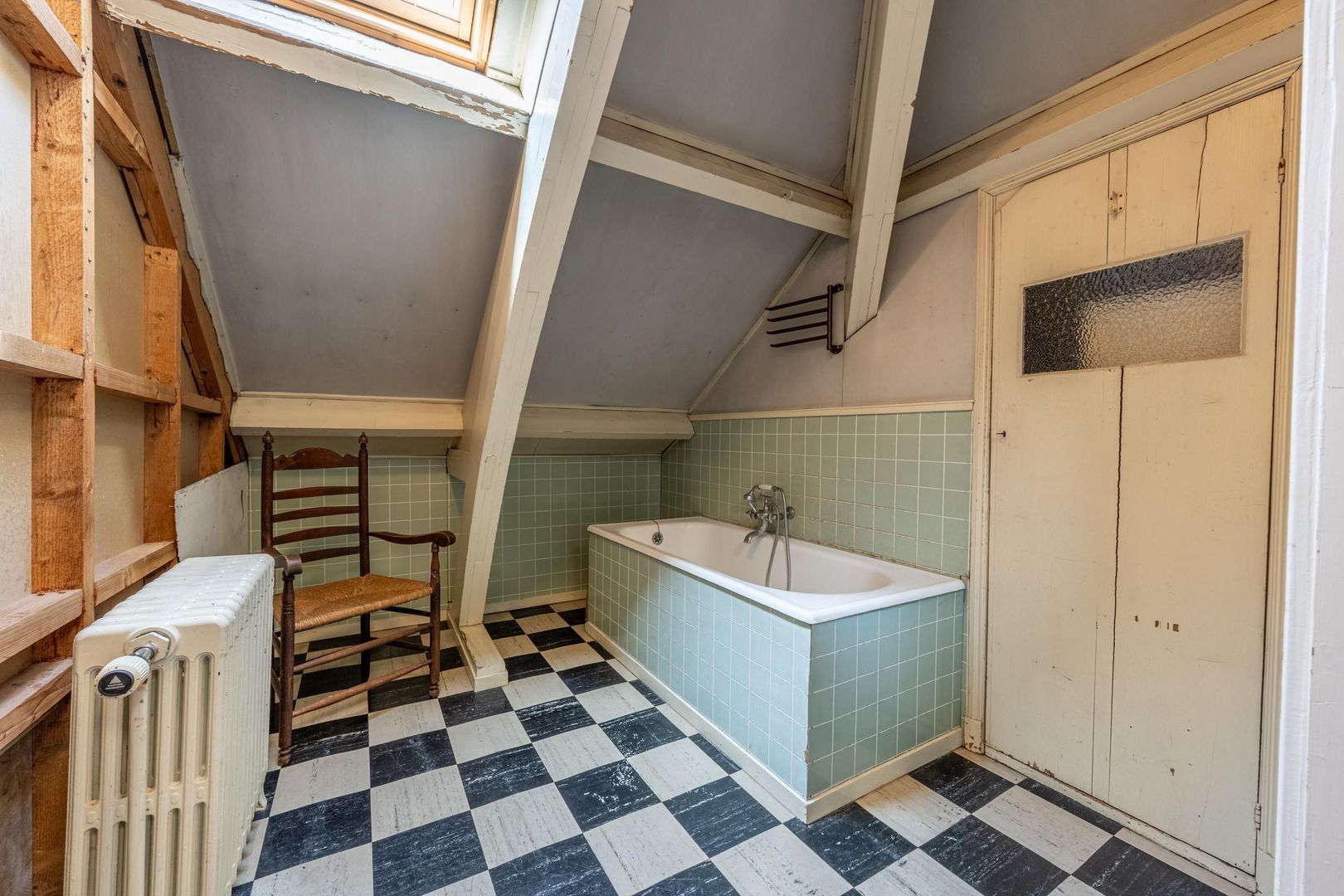 Aan de linkerkant van de gang is een slaapkamer, die eveneens beschikt over de fraaie ramen. De aangrenzende badkamer is ruim van formaat en biedt plaats aan een douchegelegenheid, een ligbad, een dubbele wastafel en een toilet.