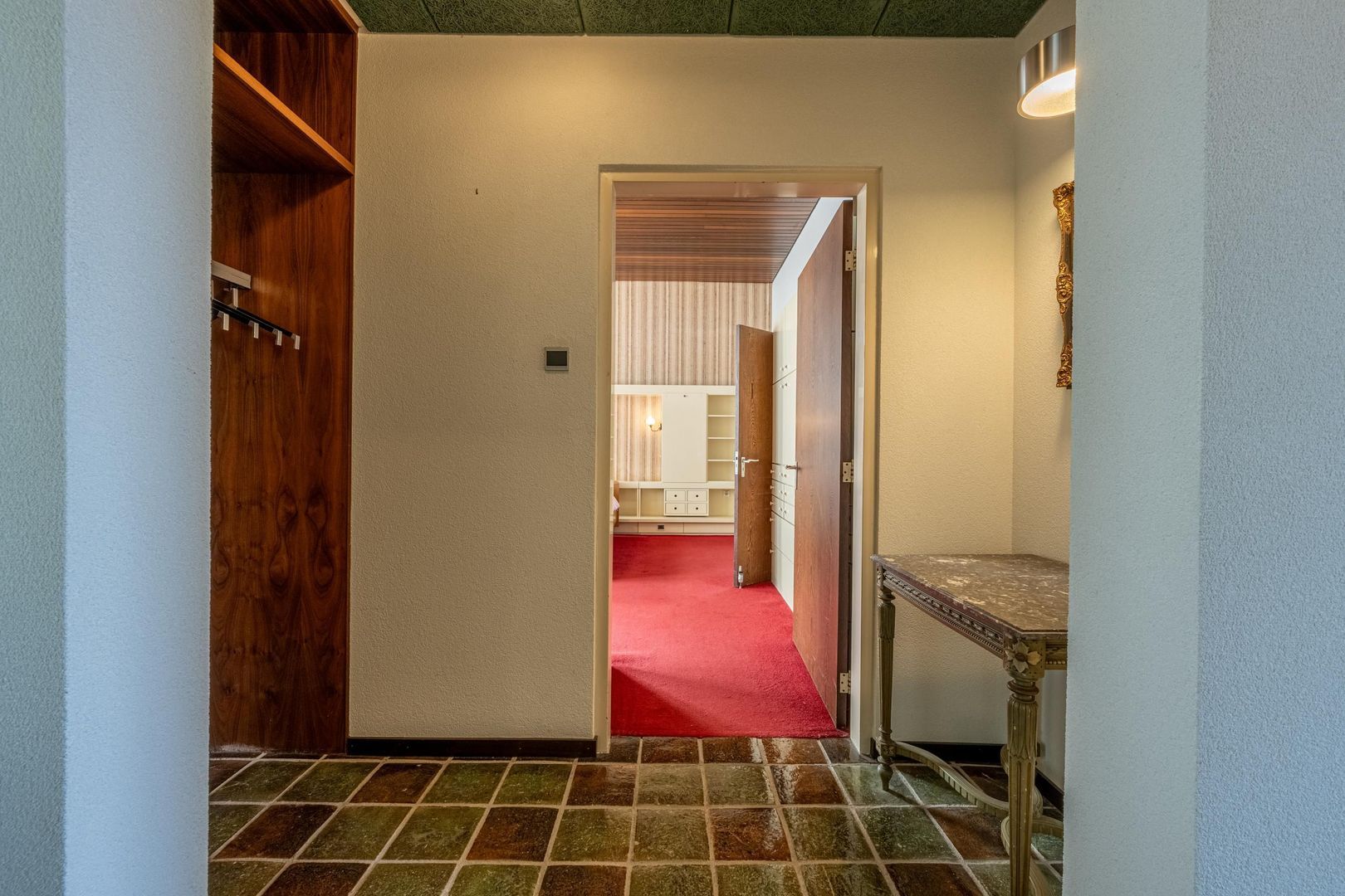 Een hal aan de zijkant leidt naar het erf met de berging en garages.