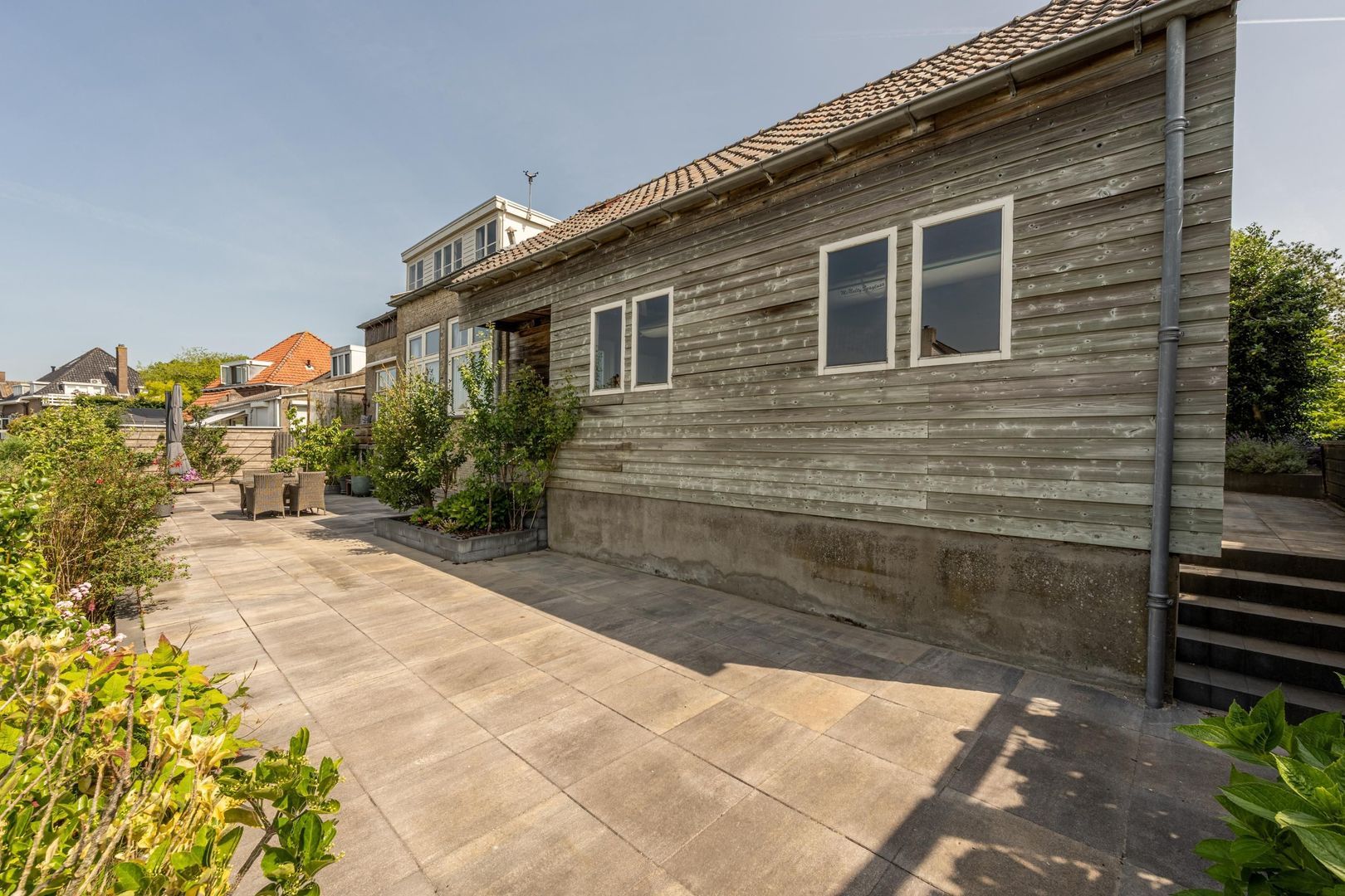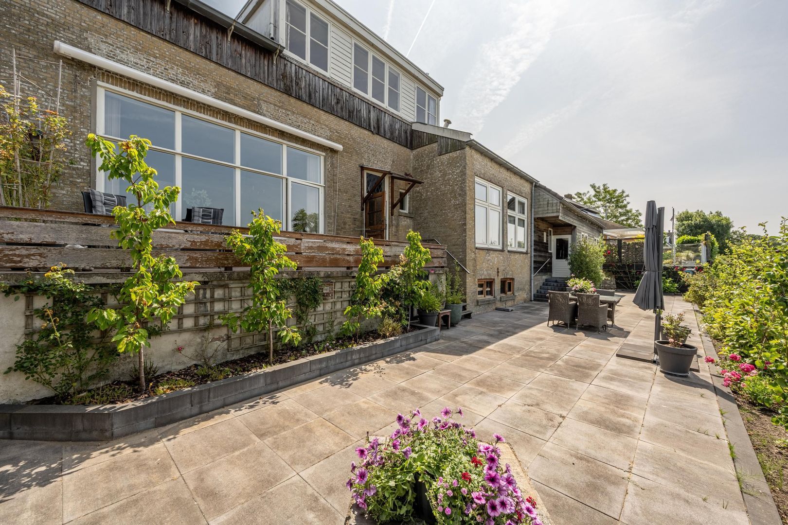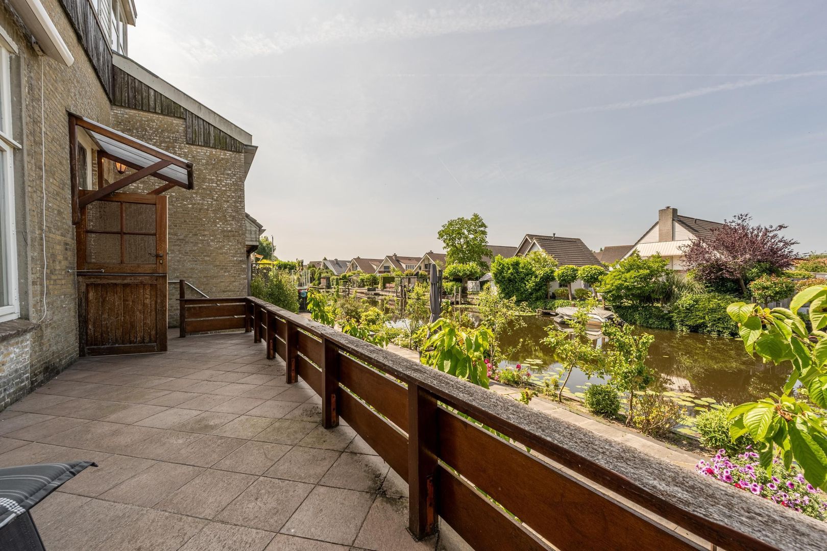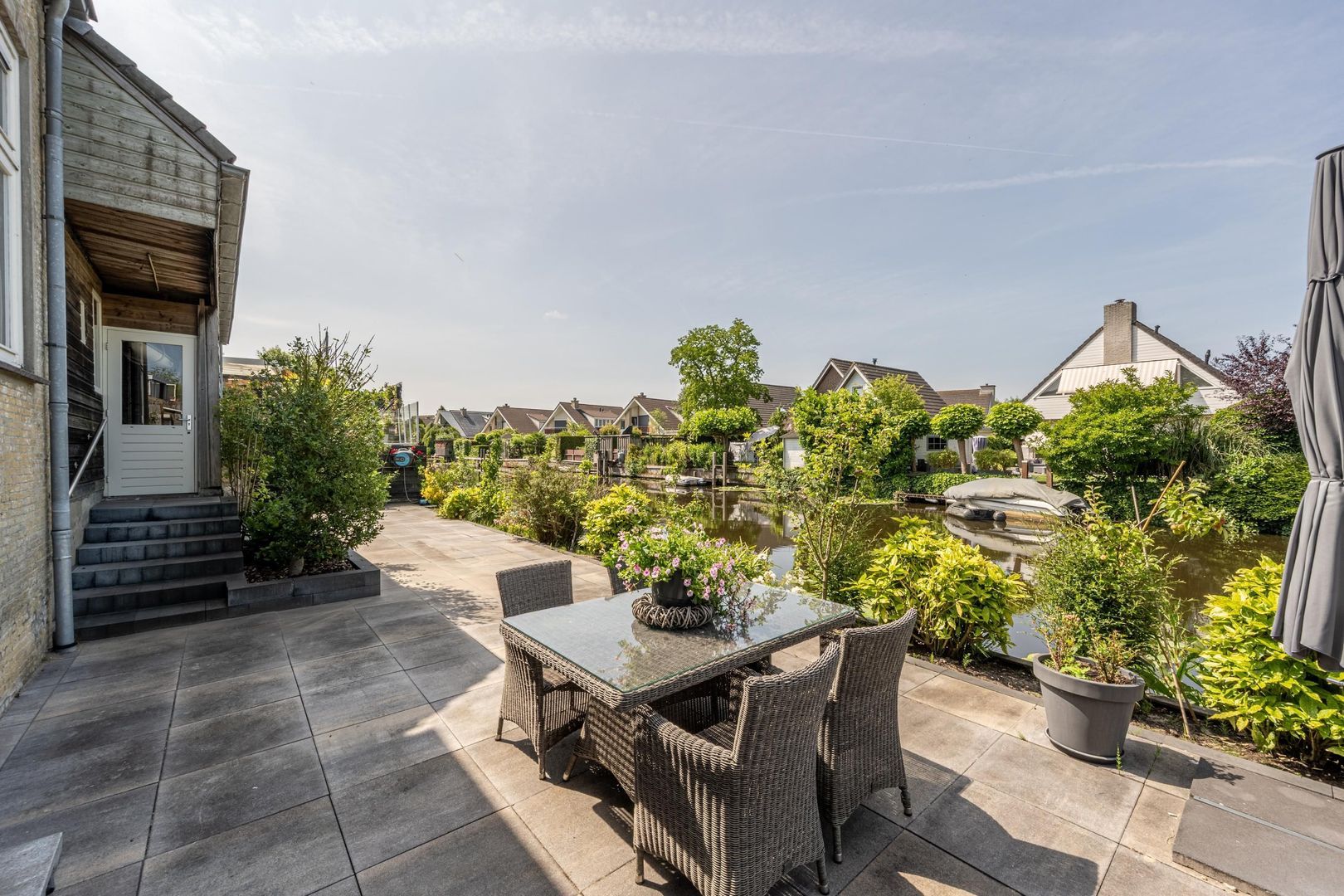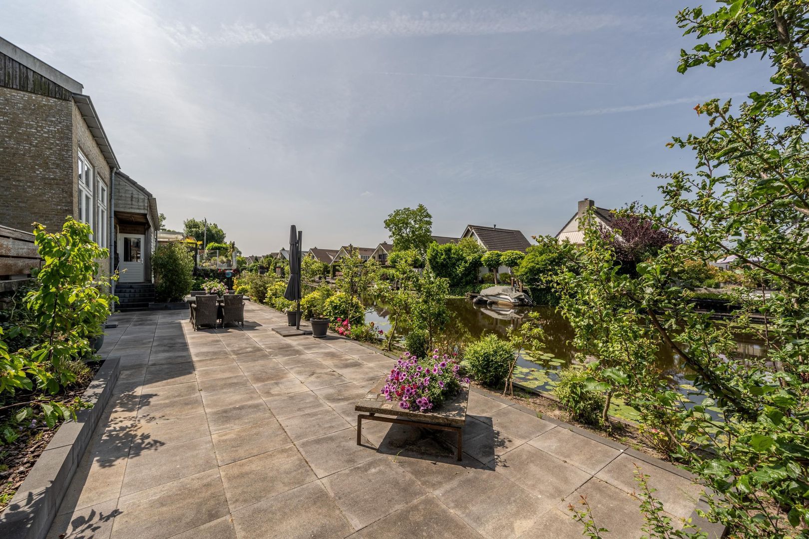De achtertuin ligt op de zonzijde en is grotendeels bestraat. De tuin grenst aan het water.