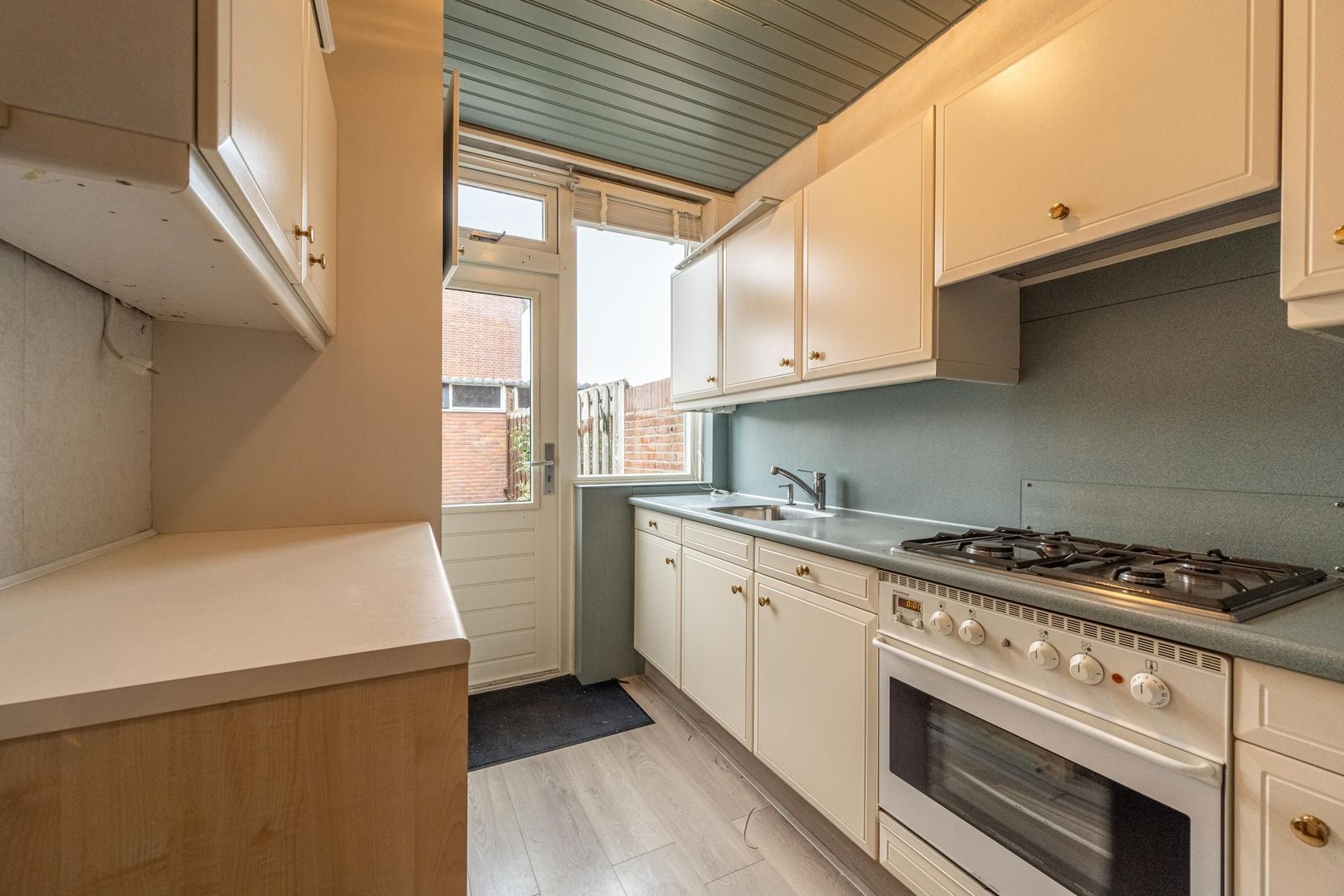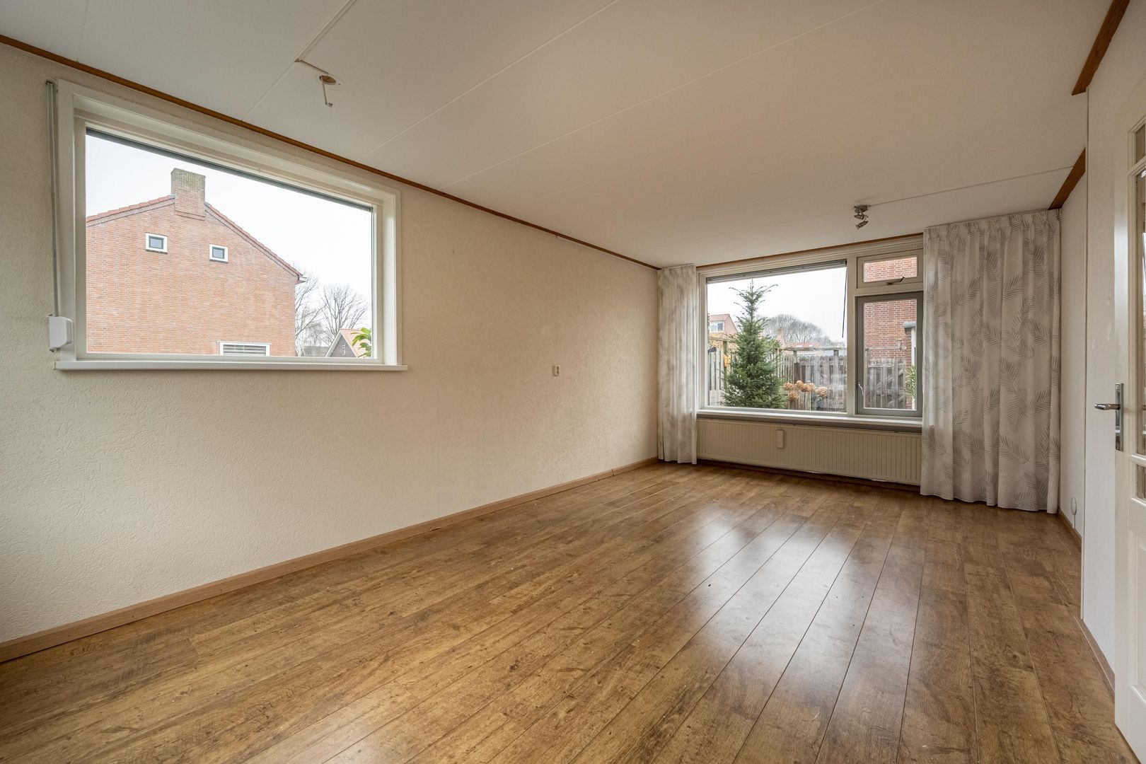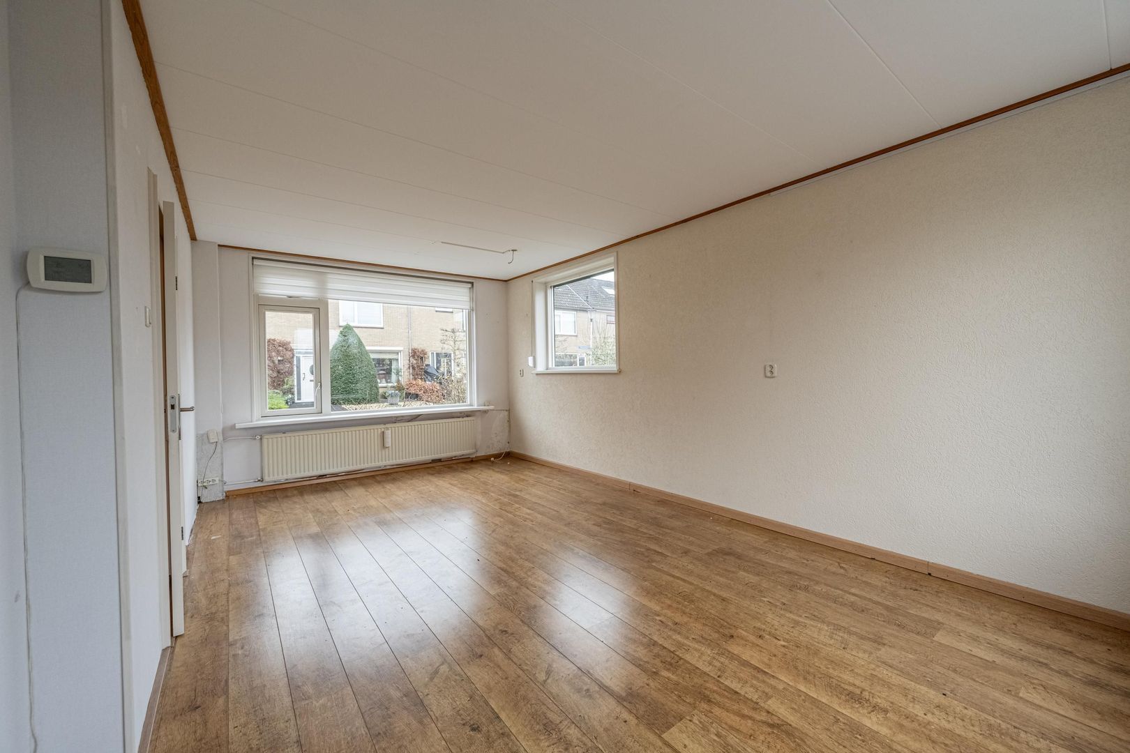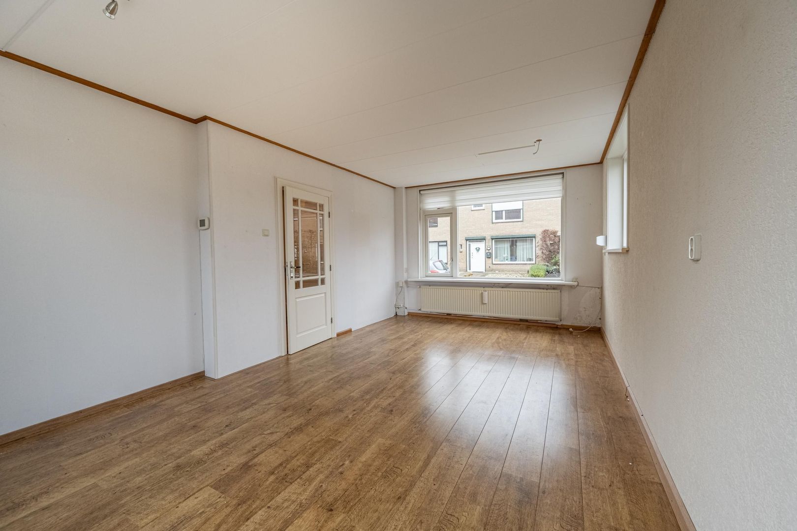 Lichte doorzon woonkamer met leuk zijraam. Dichte keuken met eenvoudige, maar nette wandopstelling.